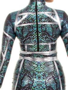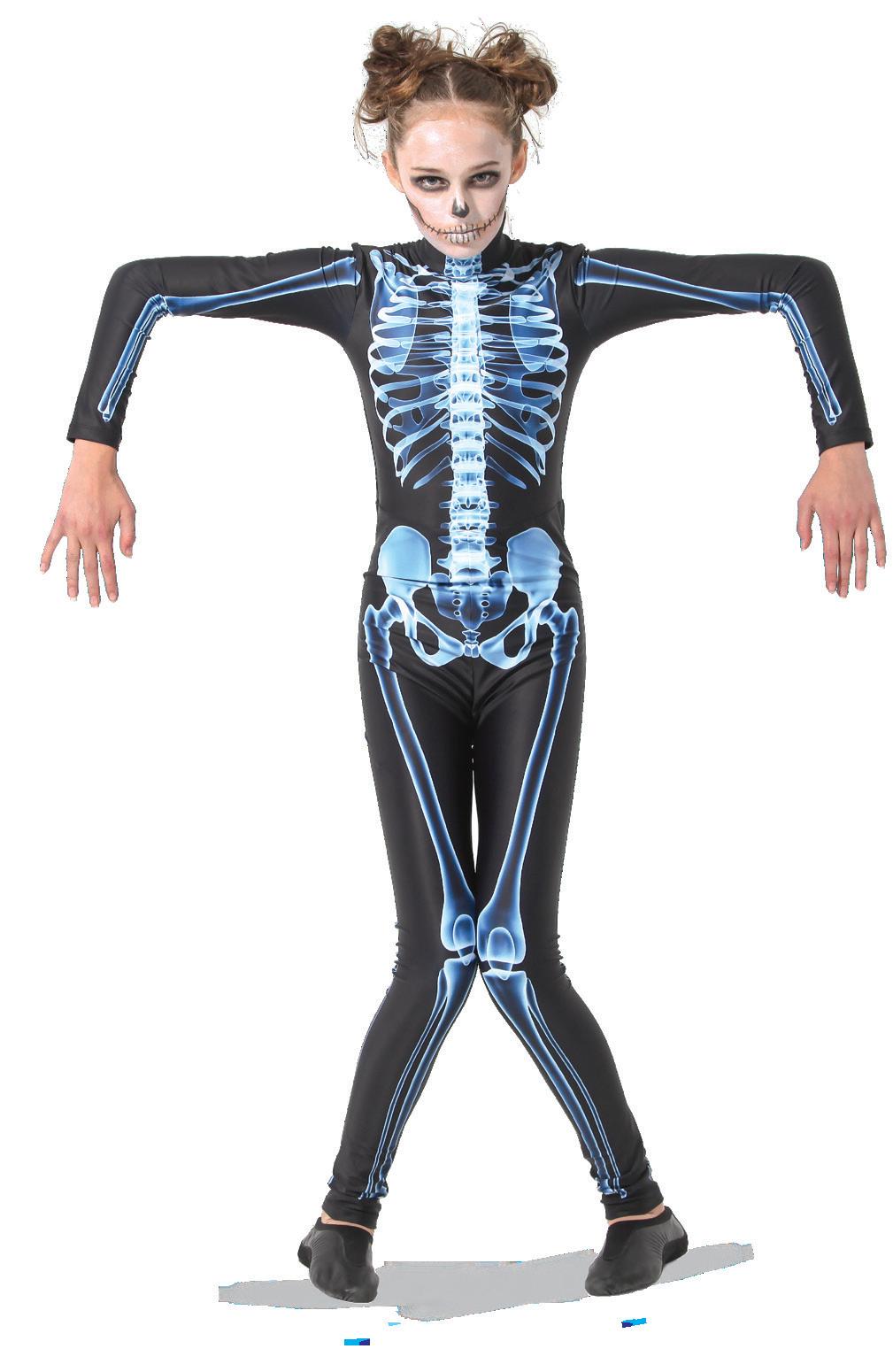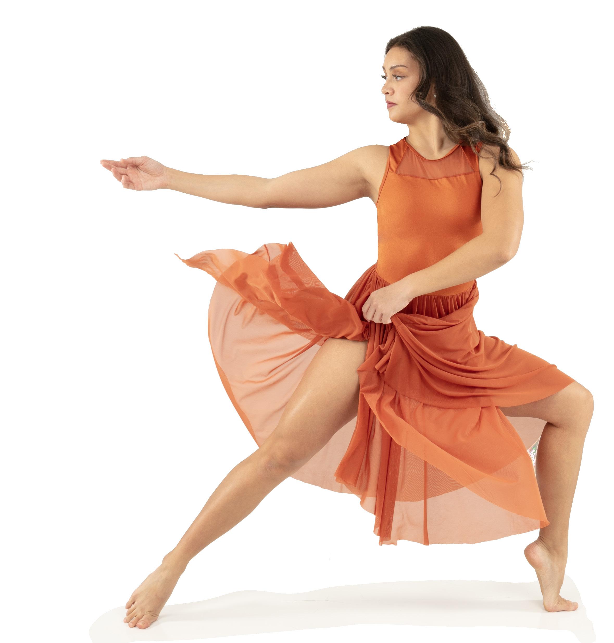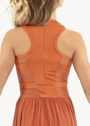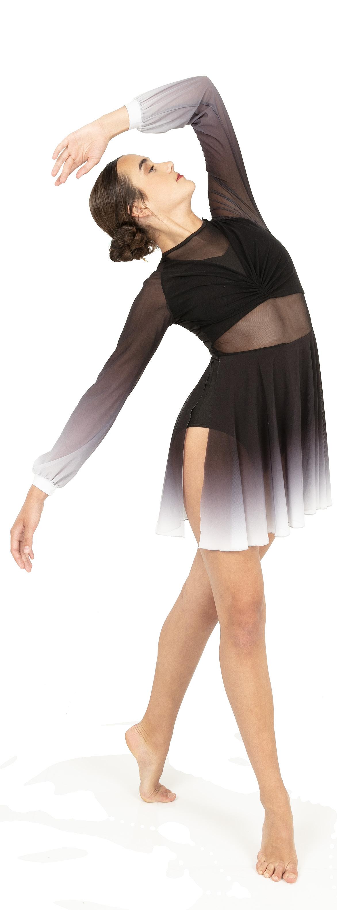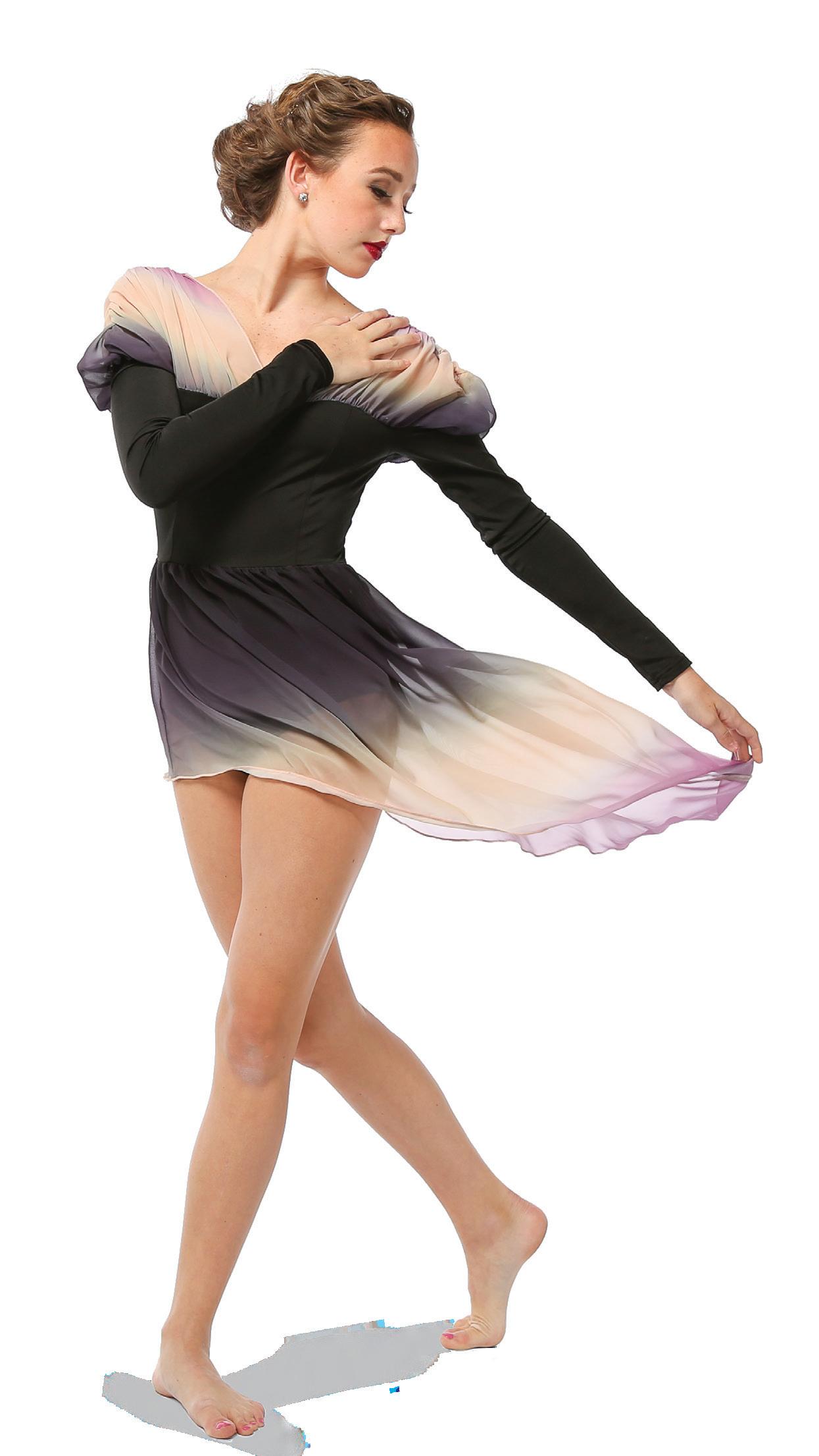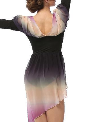 Alexandra. The ombre mesh sleeves, criss-cross ombre mesh panels, and waistband make this the perfect costume for all shapes and sizes. Circle neckline, front lined, and center back zipper closure. Polyester, Spandex.