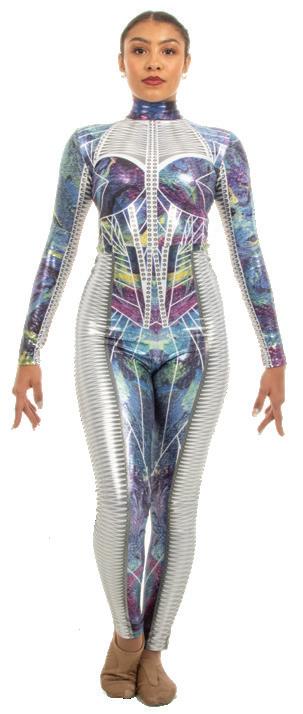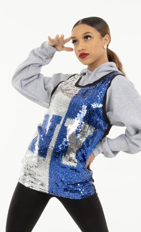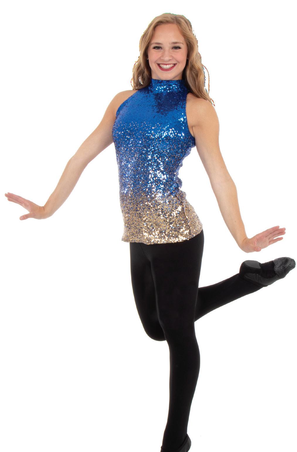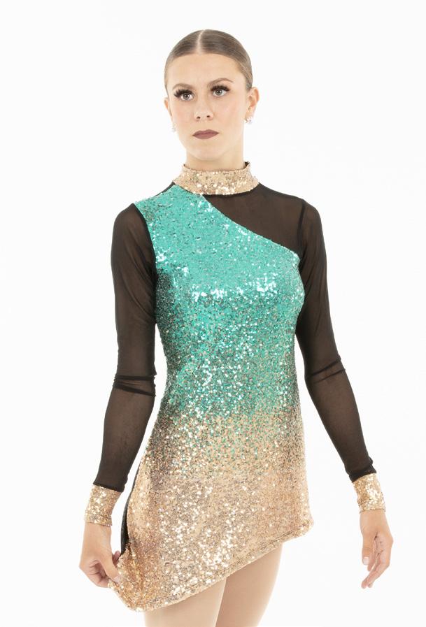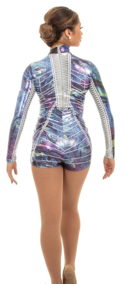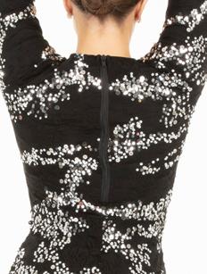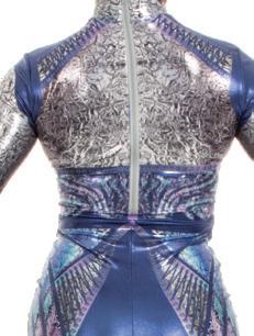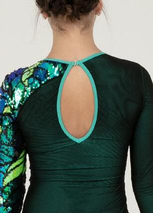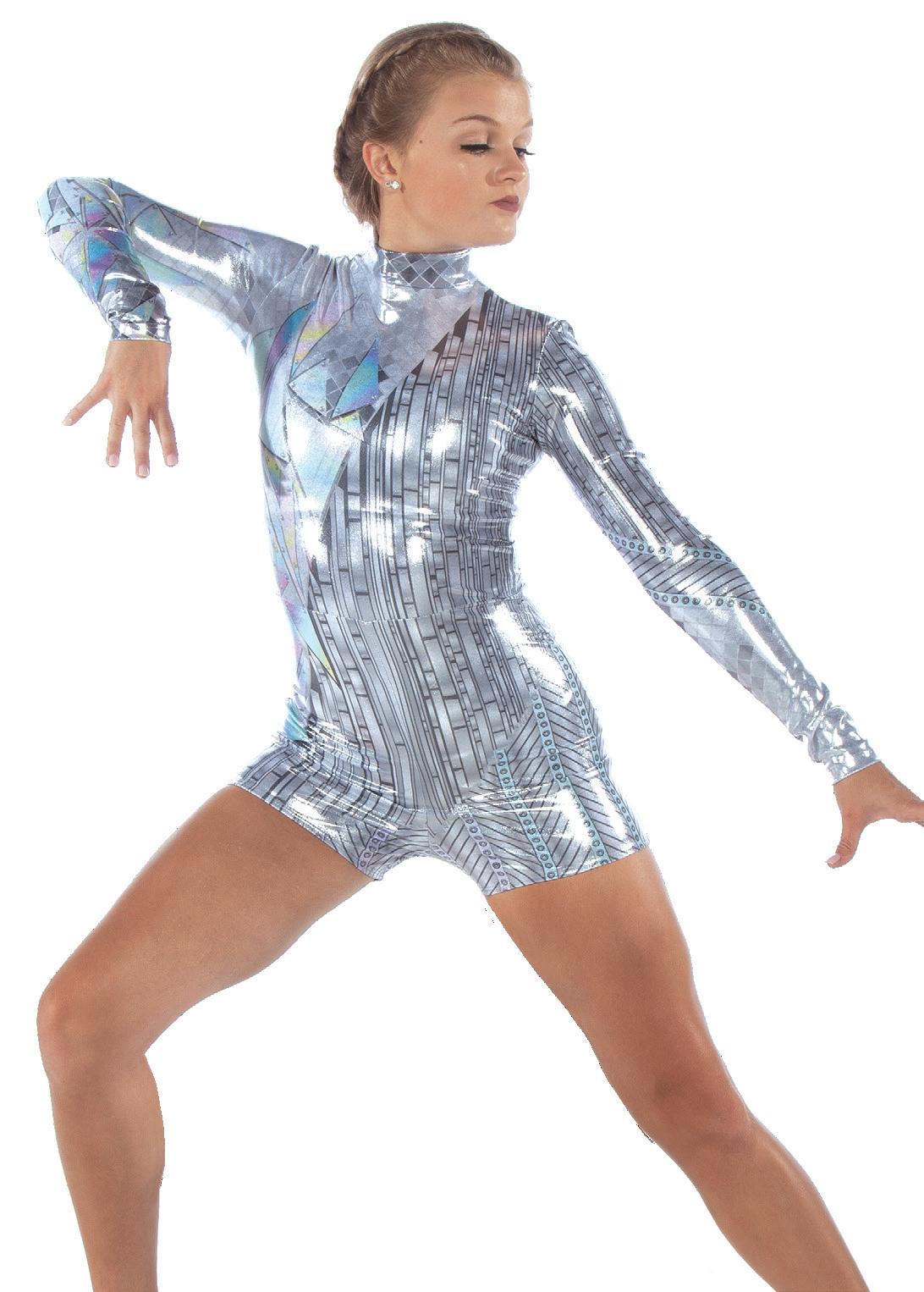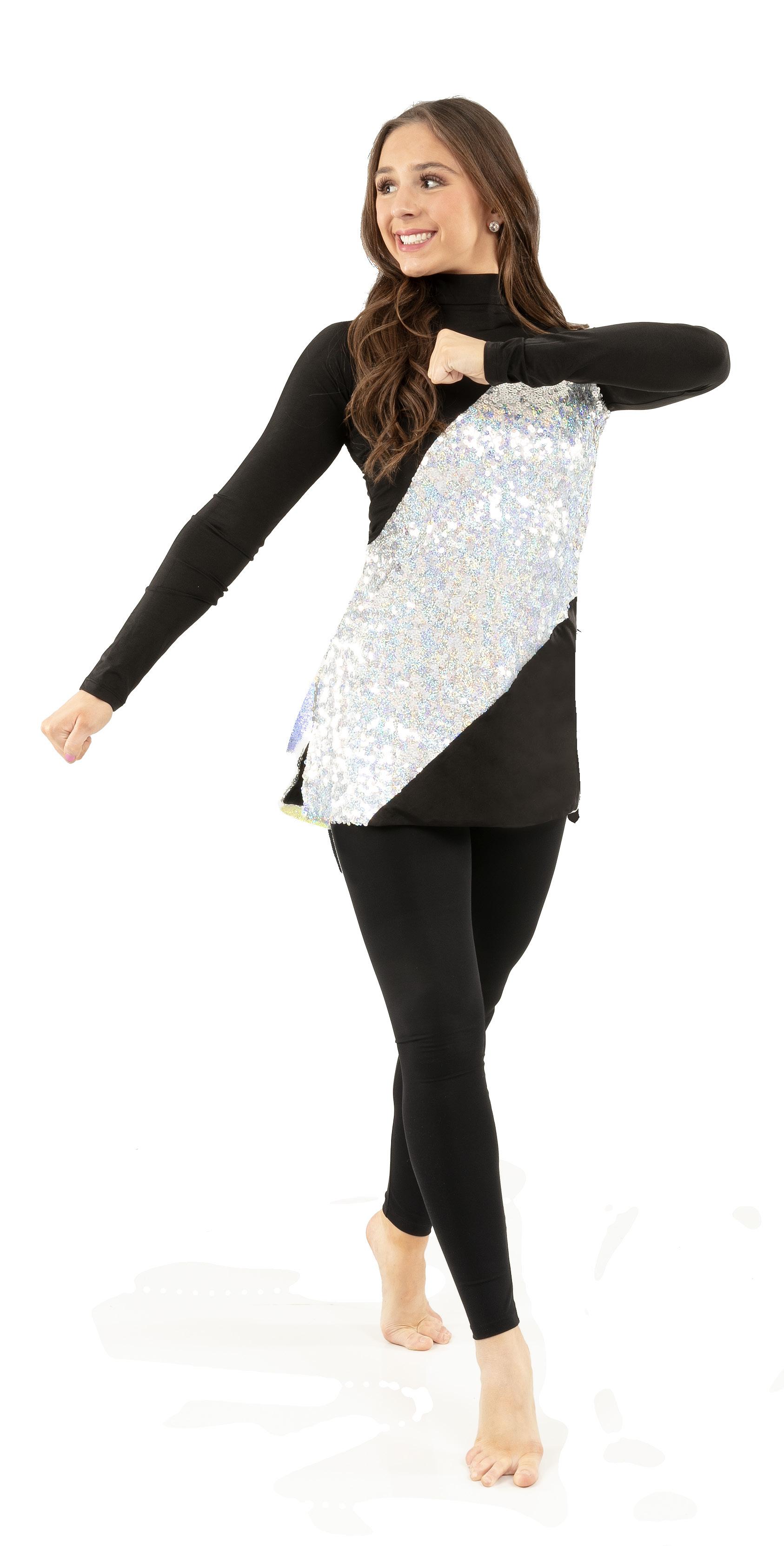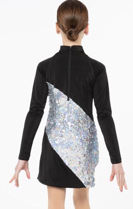 Alexandra. Light catching large holographic silver sequin fabric offset with asymmetrical back tricot panels is perfect for the whole team. Mock neckband and center back zipper closure. Long tricot sleeves. Lining under sequin panels for comfort.