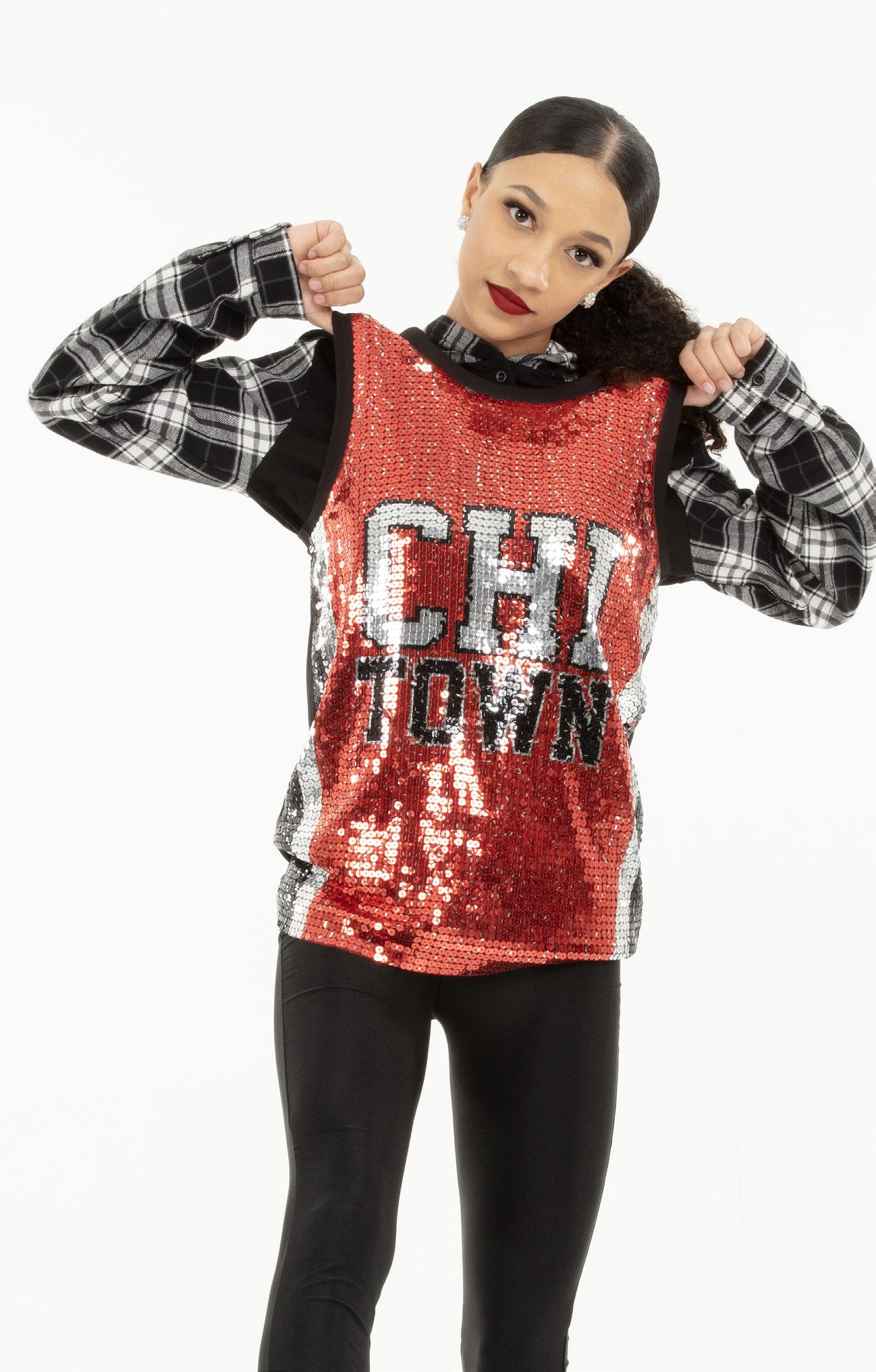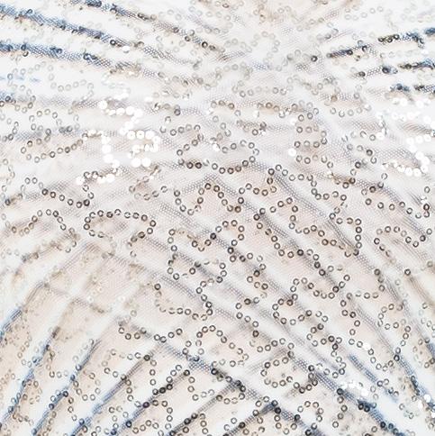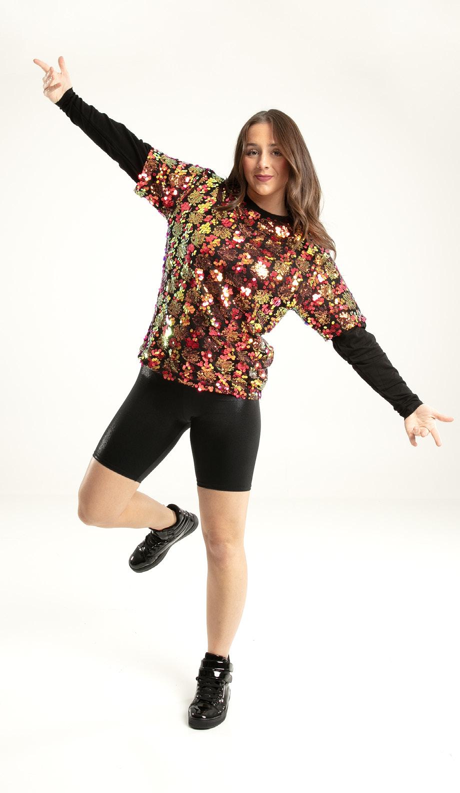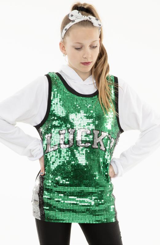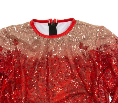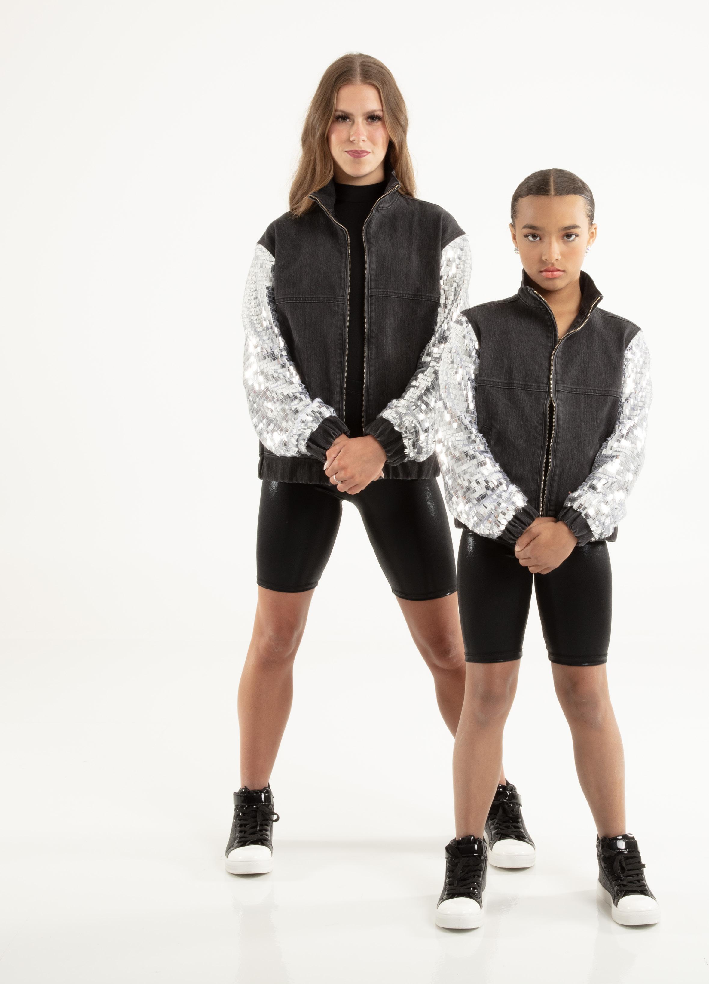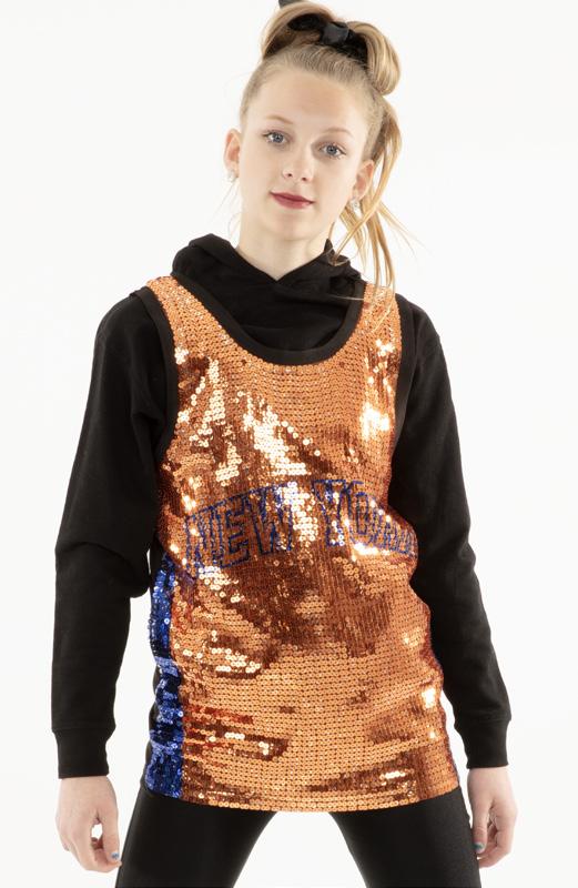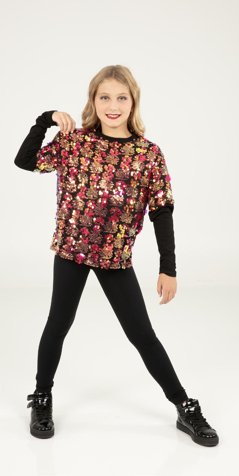 Alexandra. Light catching large holographic silver sequin fabric offset with asymmetrical back tricot panels is perfect for the whole team. Mock neckband and center back zipper closure. Long tricot sleeves. Lining under sequin panels for comfort.