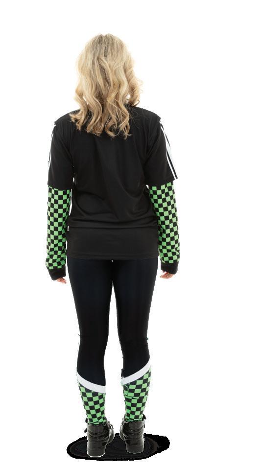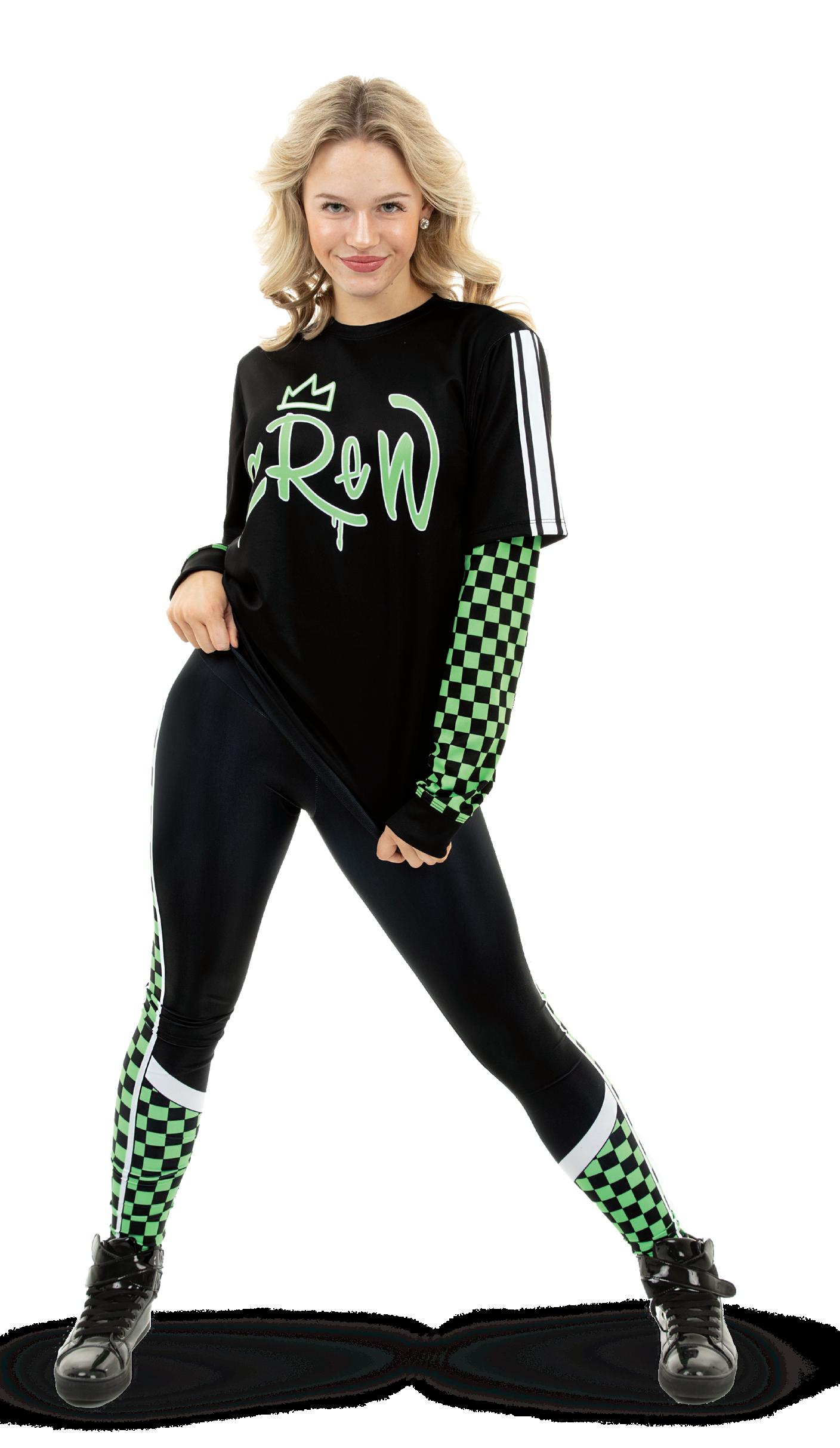 This shirt features a 2-1 short sleeve layered over a long sleeve and a neon lime green and black checkered pattern for the perfect look. ‘Crew’ on the front bodice, white stripes on the sleeve.