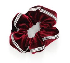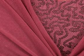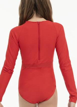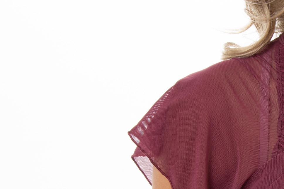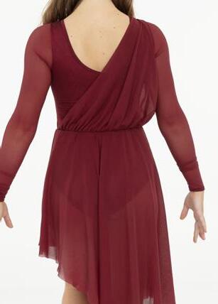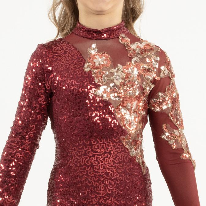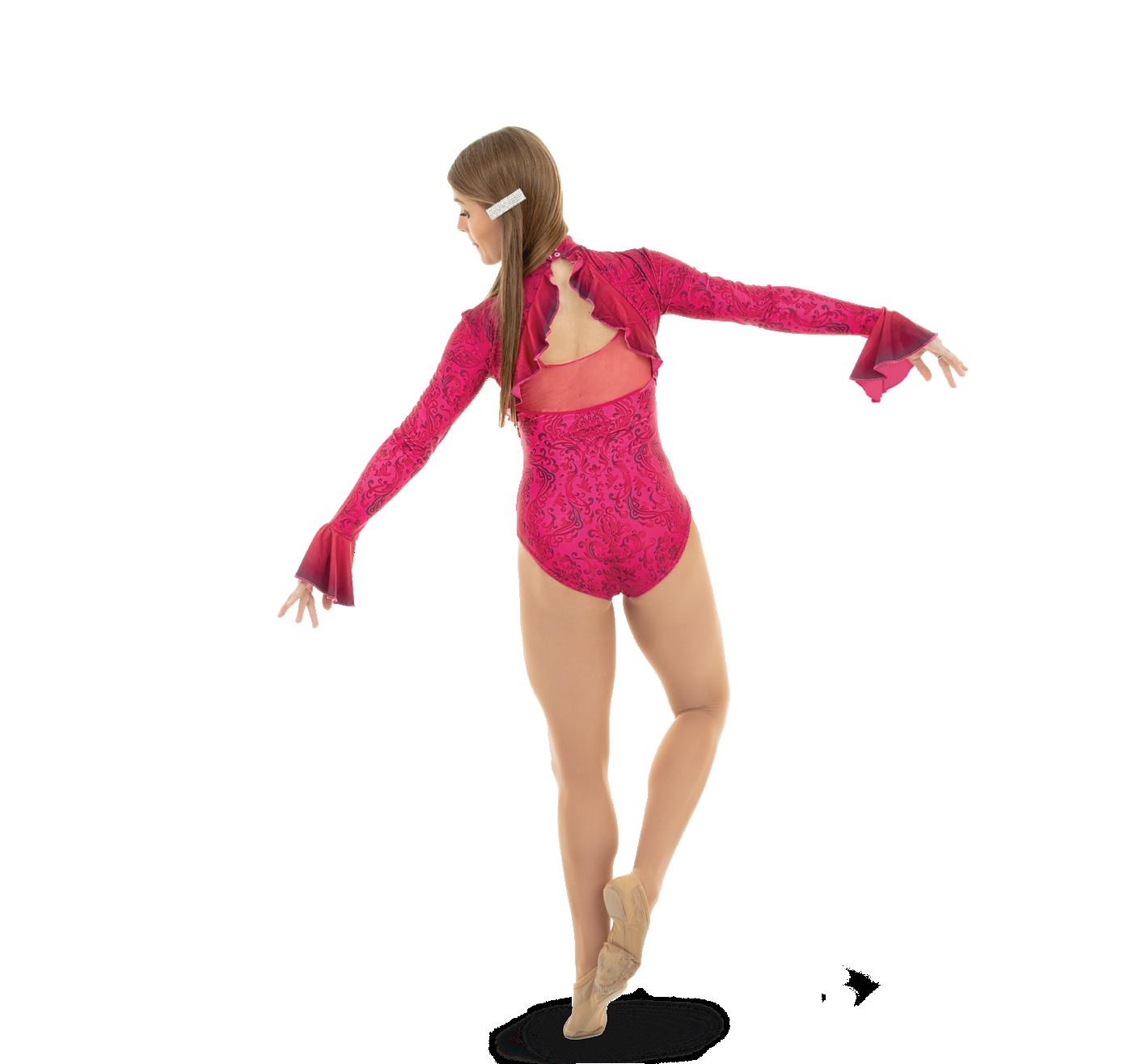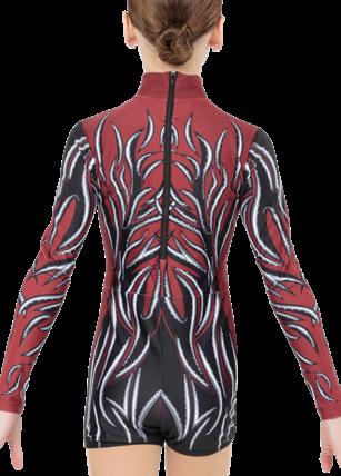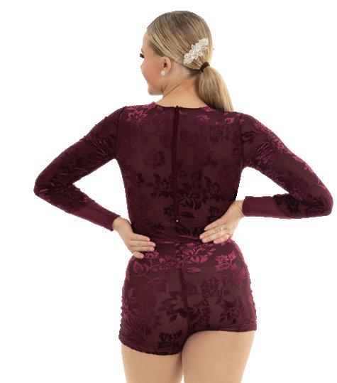 Alexandra. This burgundy burnout floral velvet biketard is accented with princess seams, velvet trim and a middle mesh panel. The long velvet sleeves are accented with asymmetrical mesh cuffs. Centerback zipper closure. Fully lined with stretch tricot for coverage and comfort. Nylon, Spandex.