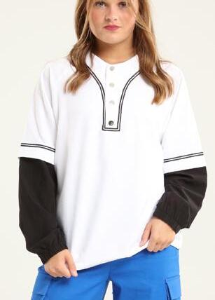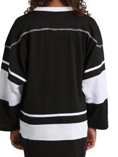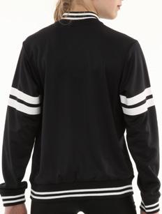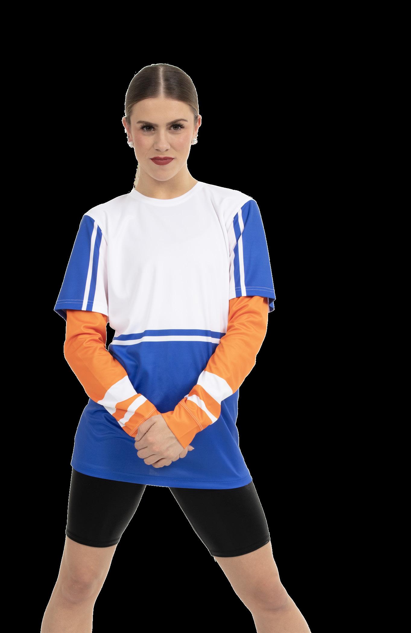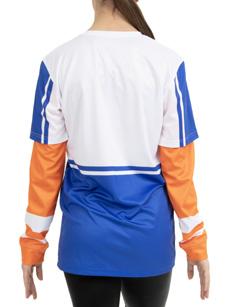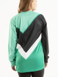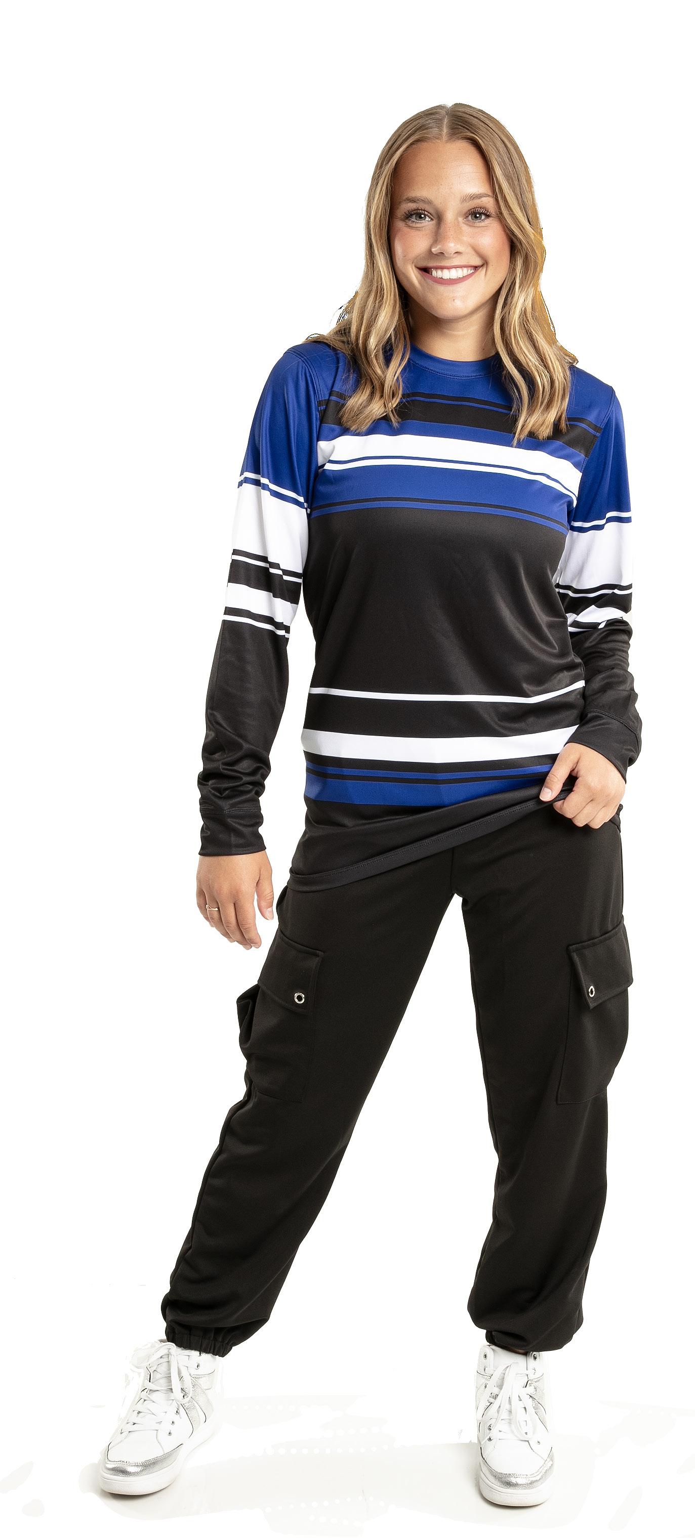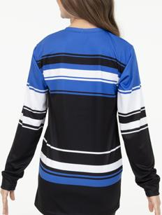 Alexandra. The long sleeve crew neck shirt features a dye-sublimation cross hatch pattern, black and white diagonal stripe panel with gold stars. Birds eye mesh fabric. Relax fit.