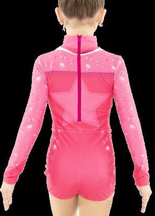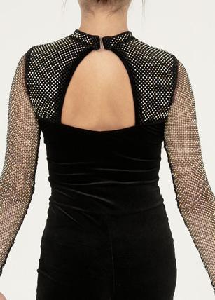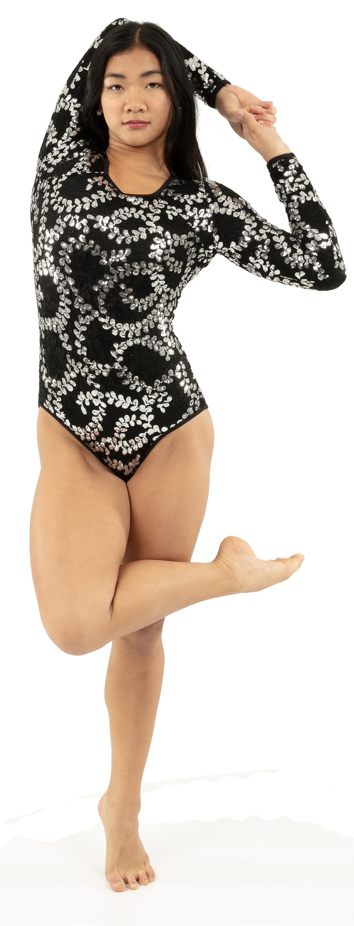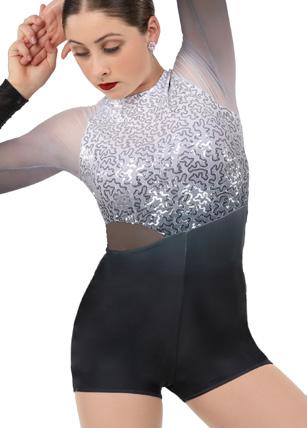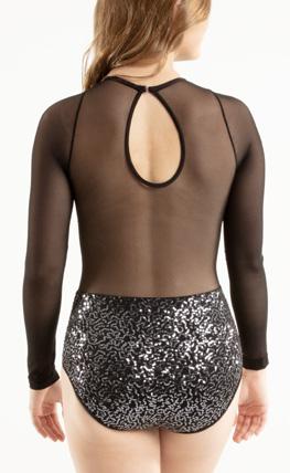 Alexandra. Illusion sequin bodice biketard features a rhinestone applique, long mesh sleeves, front and back upper mesh panel. The front and back upper mesh panels are tricot lined for full coverage. Center back zipper closure. Nylon, Spandex.