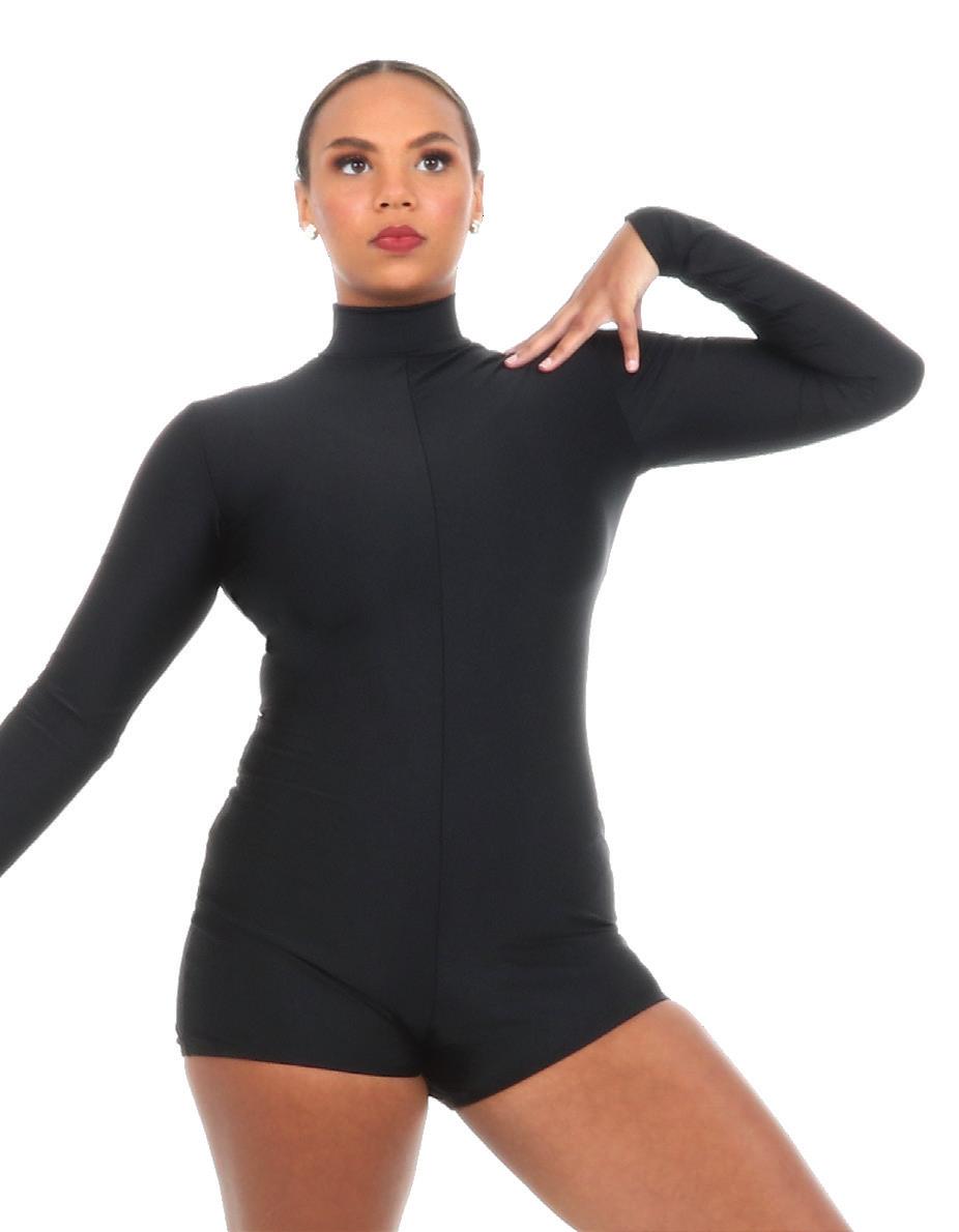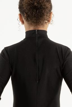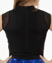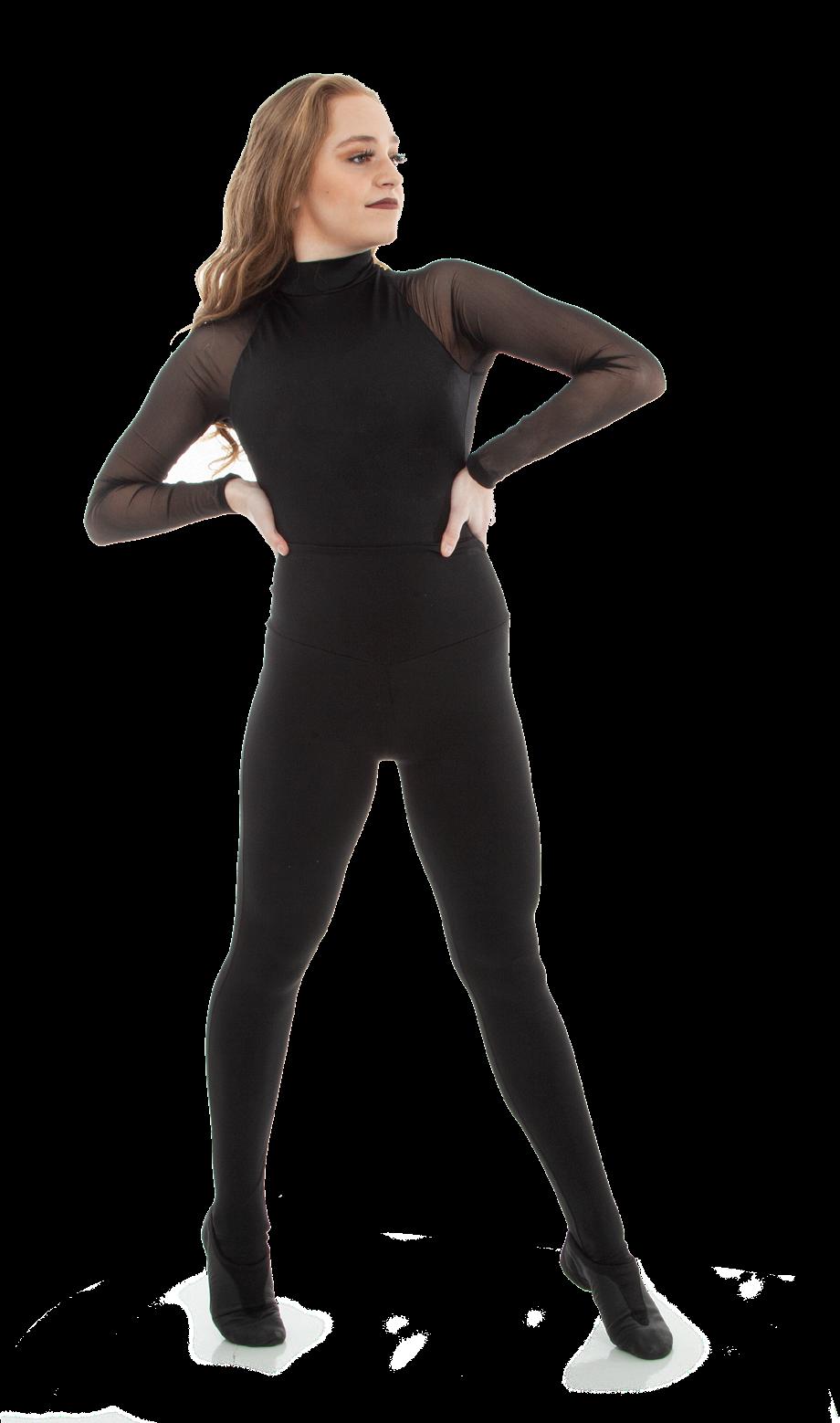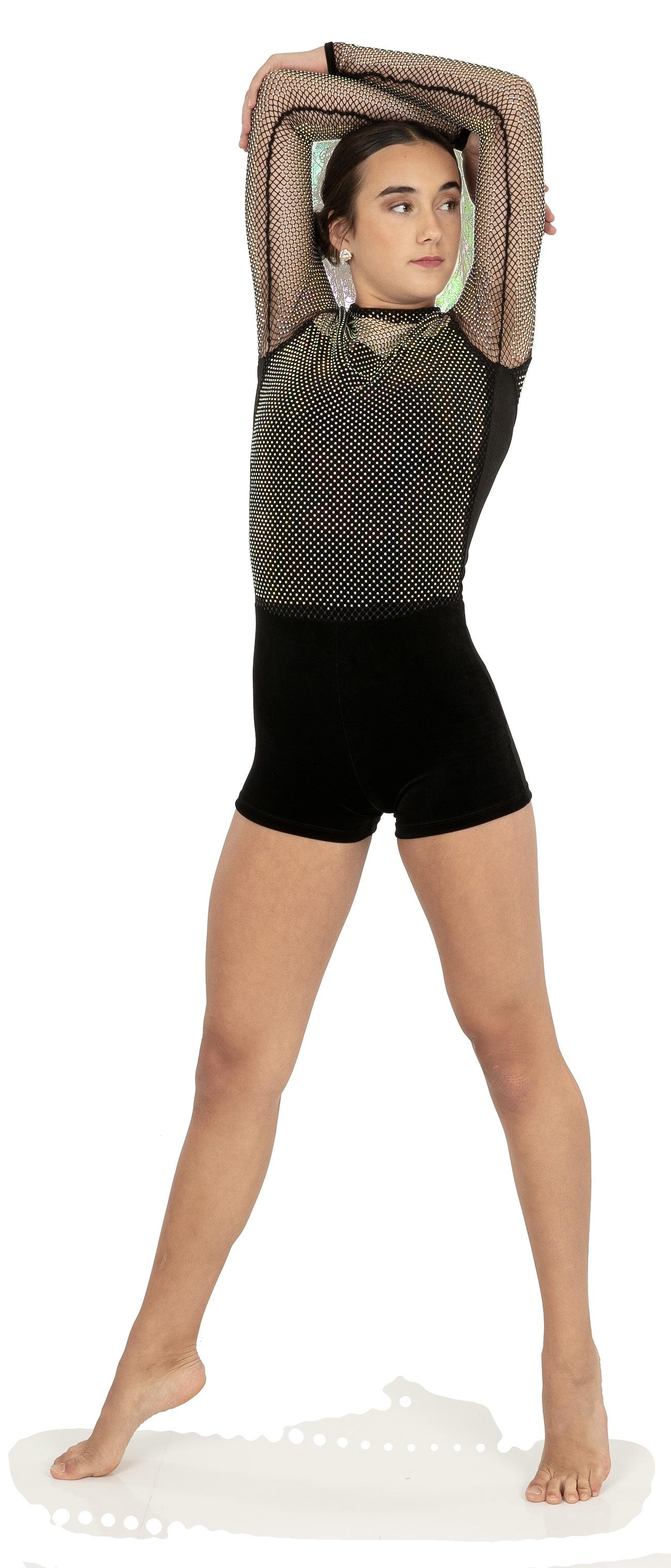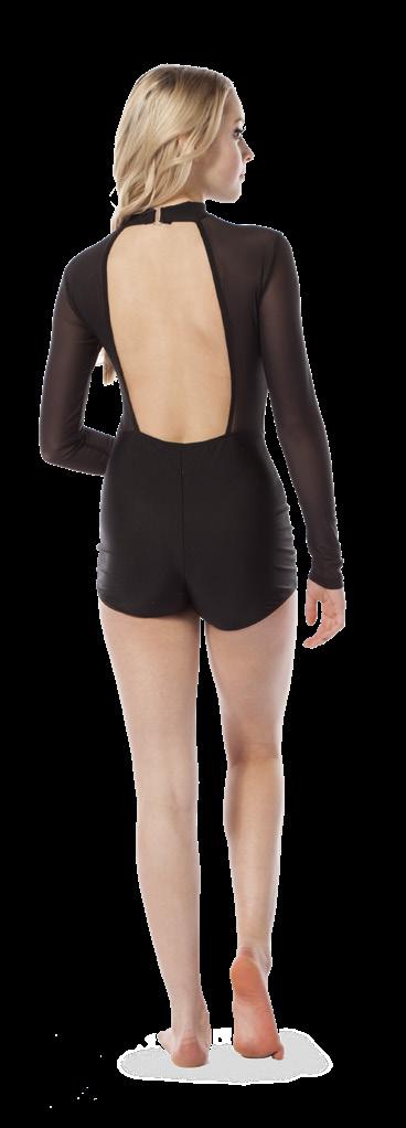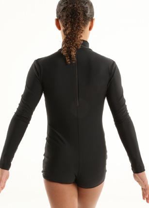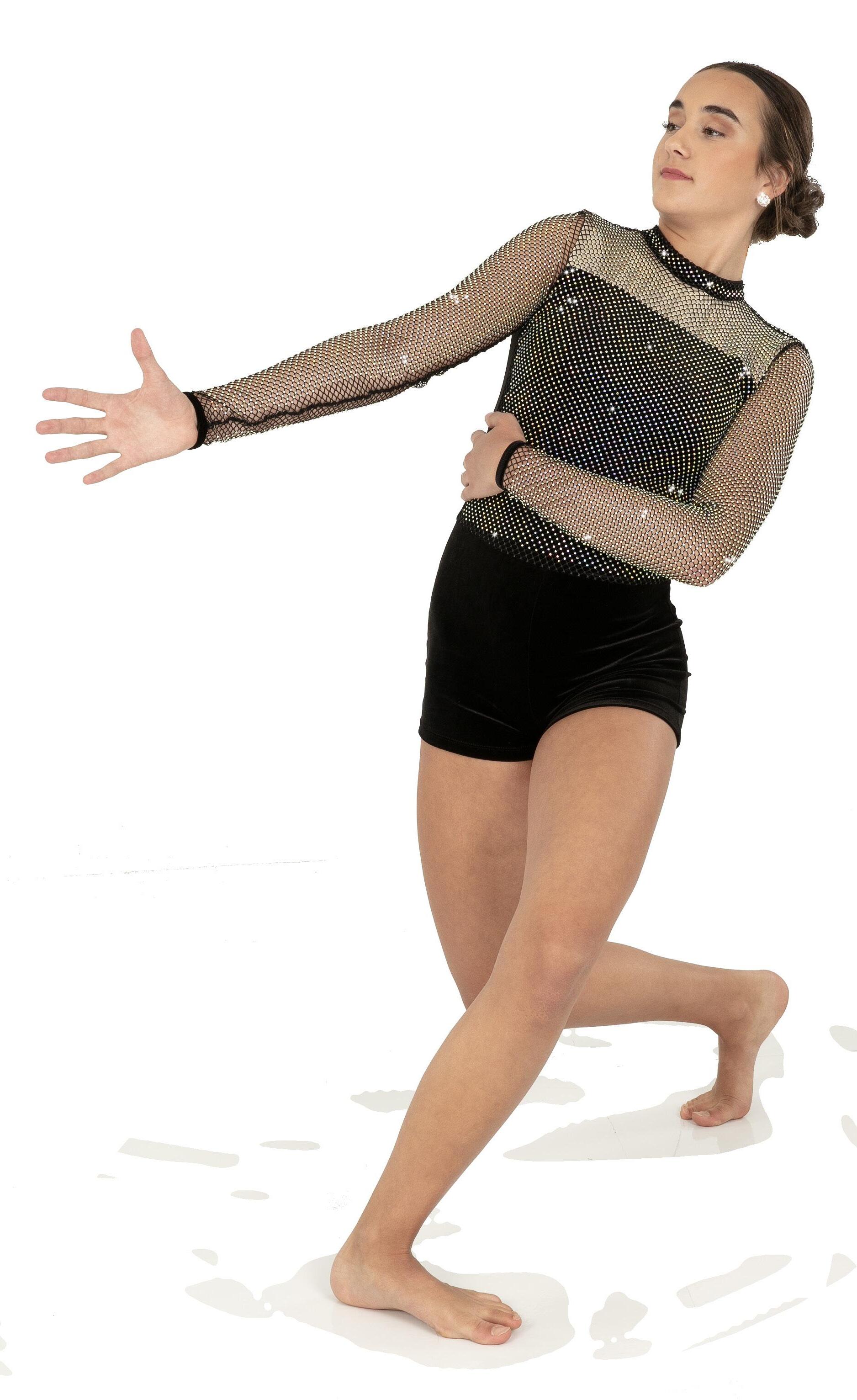 Alexandra. A mock neck leotard with black power stretch mesh sleeves. Wear it during practice, layer with a variety of bottoms, and add rhinestones for an extra sparkle during a performance. Polyester, Spandex.