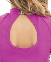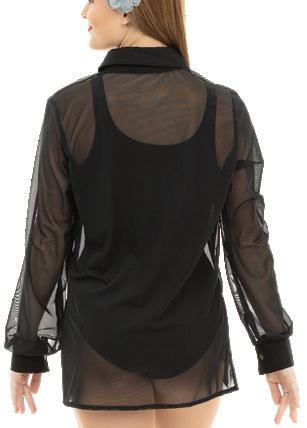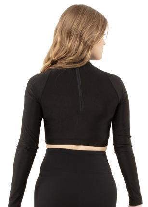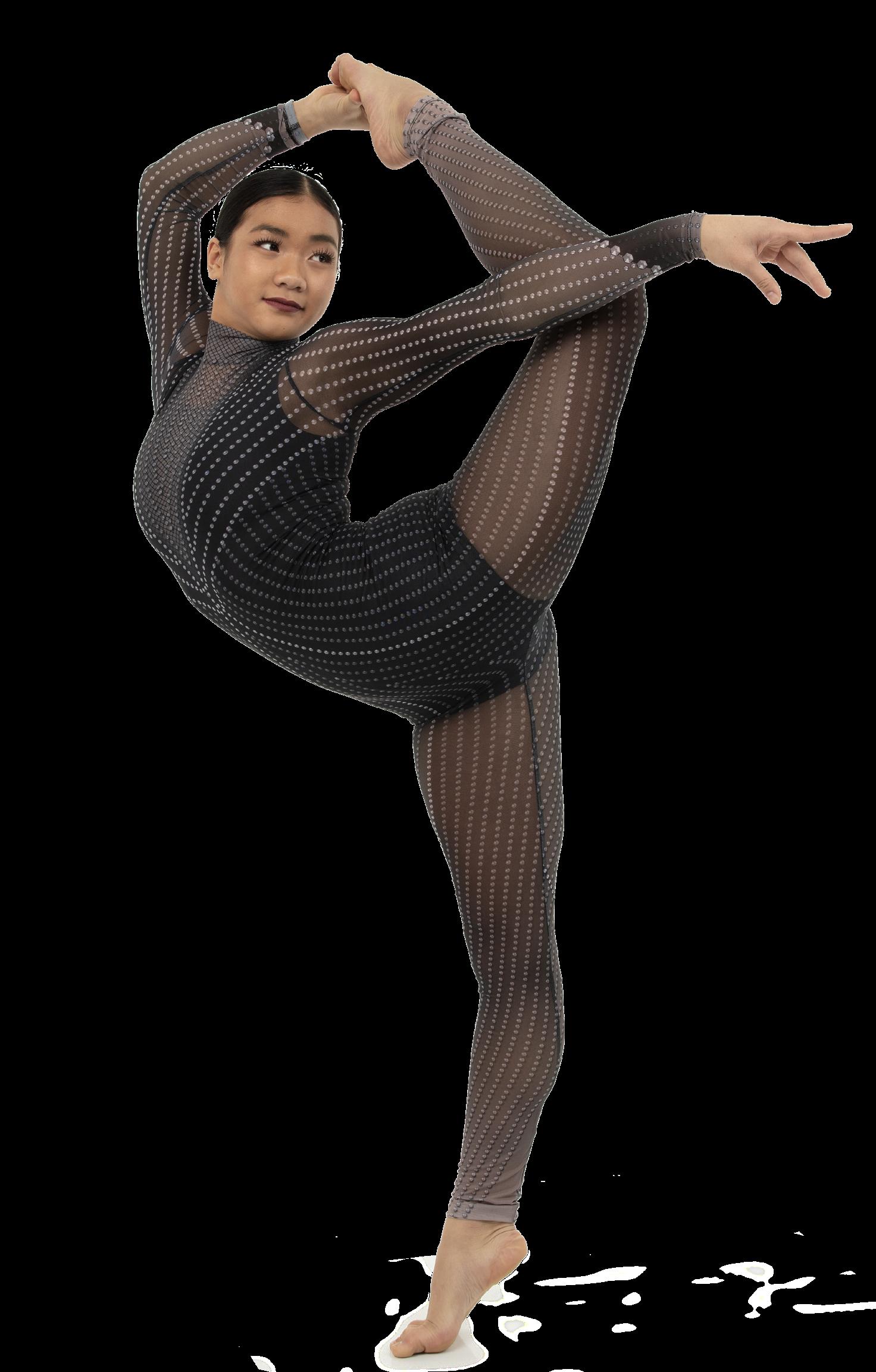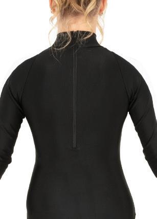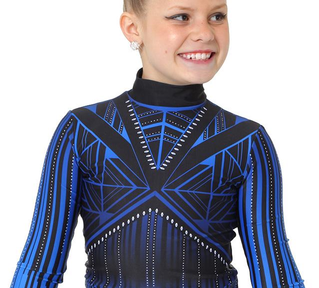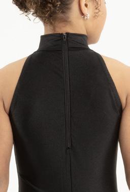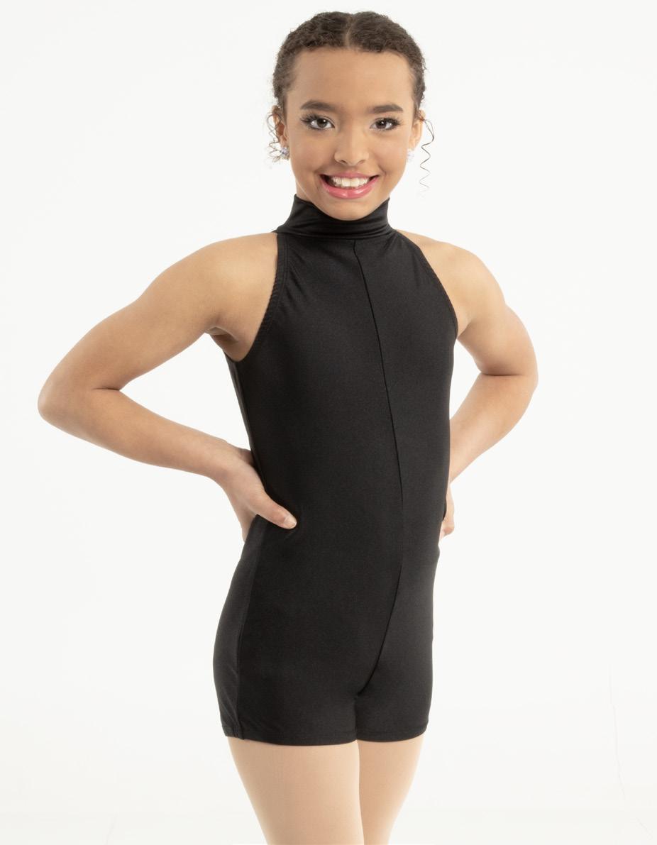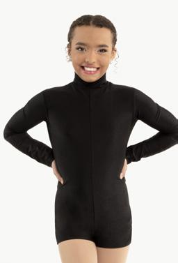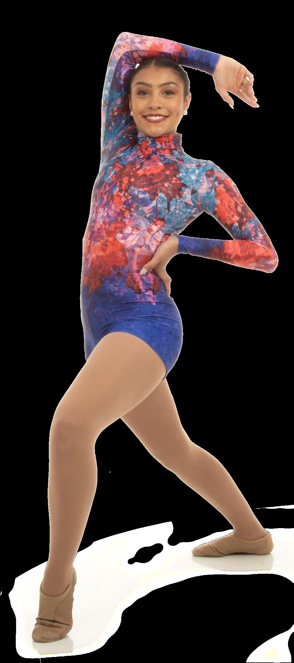Alexandra. A mock neck leotard with black power stretch mesh sleeves. Wear it during practice, layer with a variety of bottoms, and add rhinestones for an extra sparkle during a performance. Polyester, Spandex.