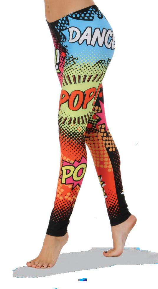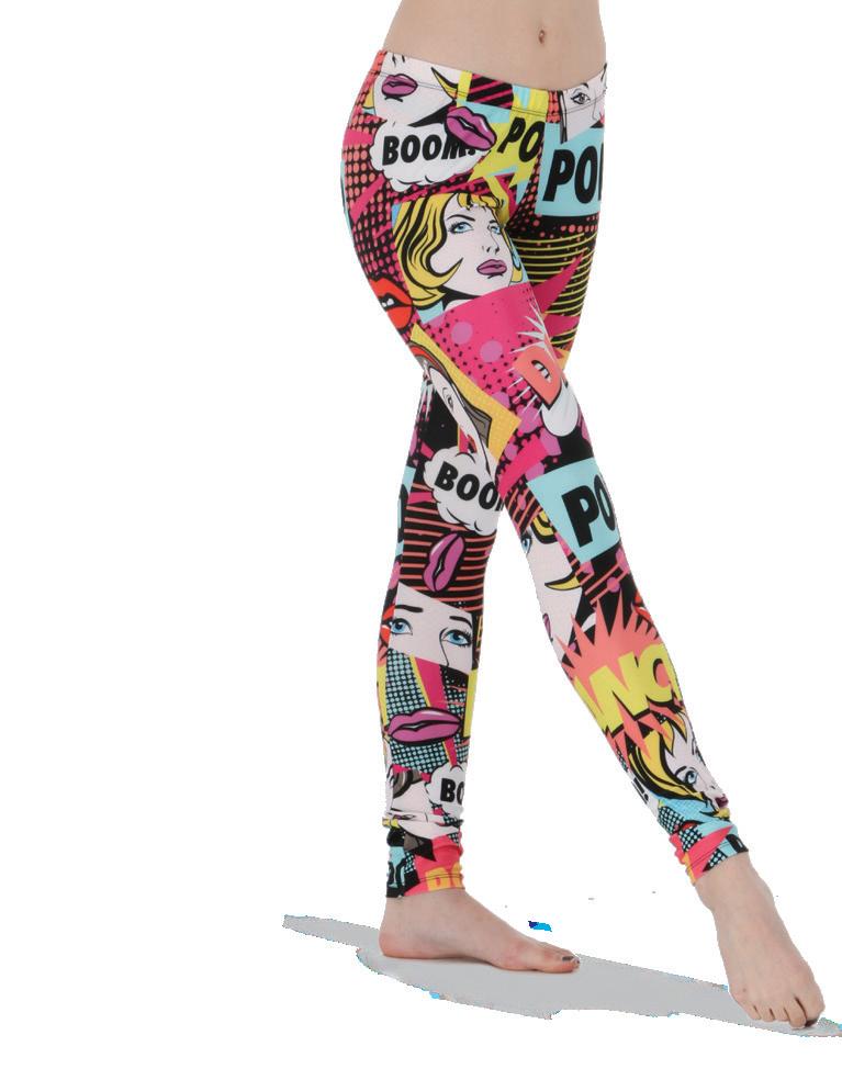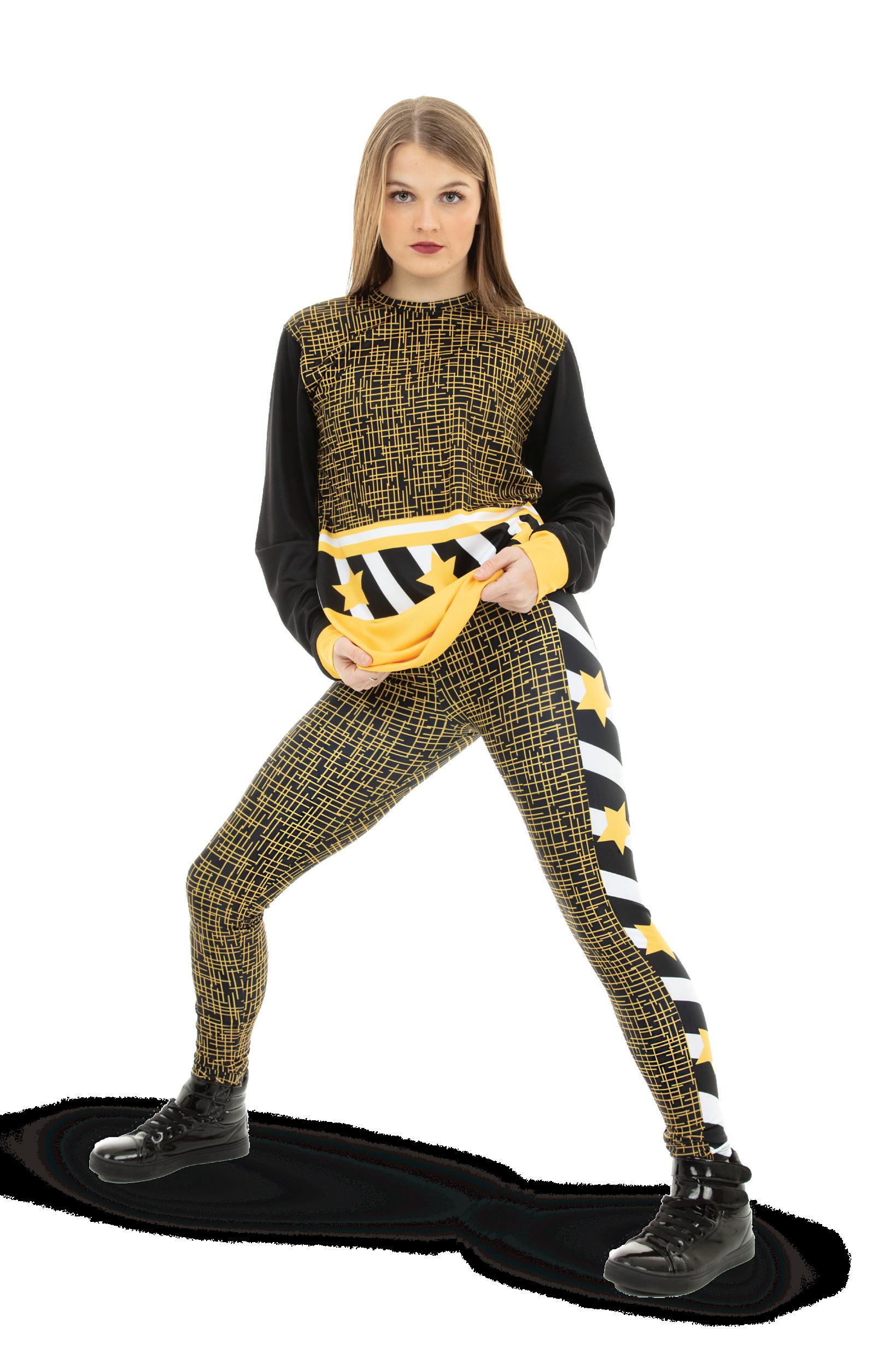 Alexandra. Dye-sublimation cross hatch pattern leggings with side panel consisting of black and white diagonal stripe panel with gold stars for the ultimate look. Mid-rise elastic waistline.