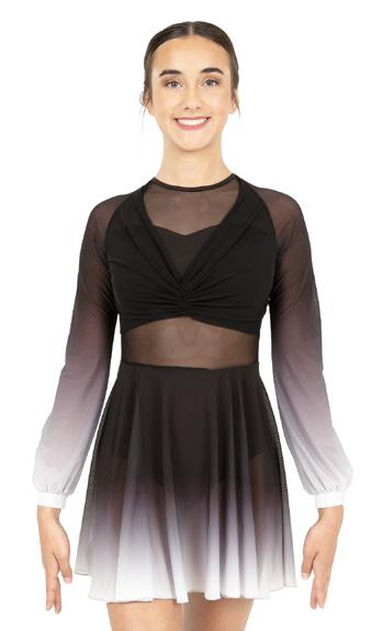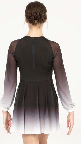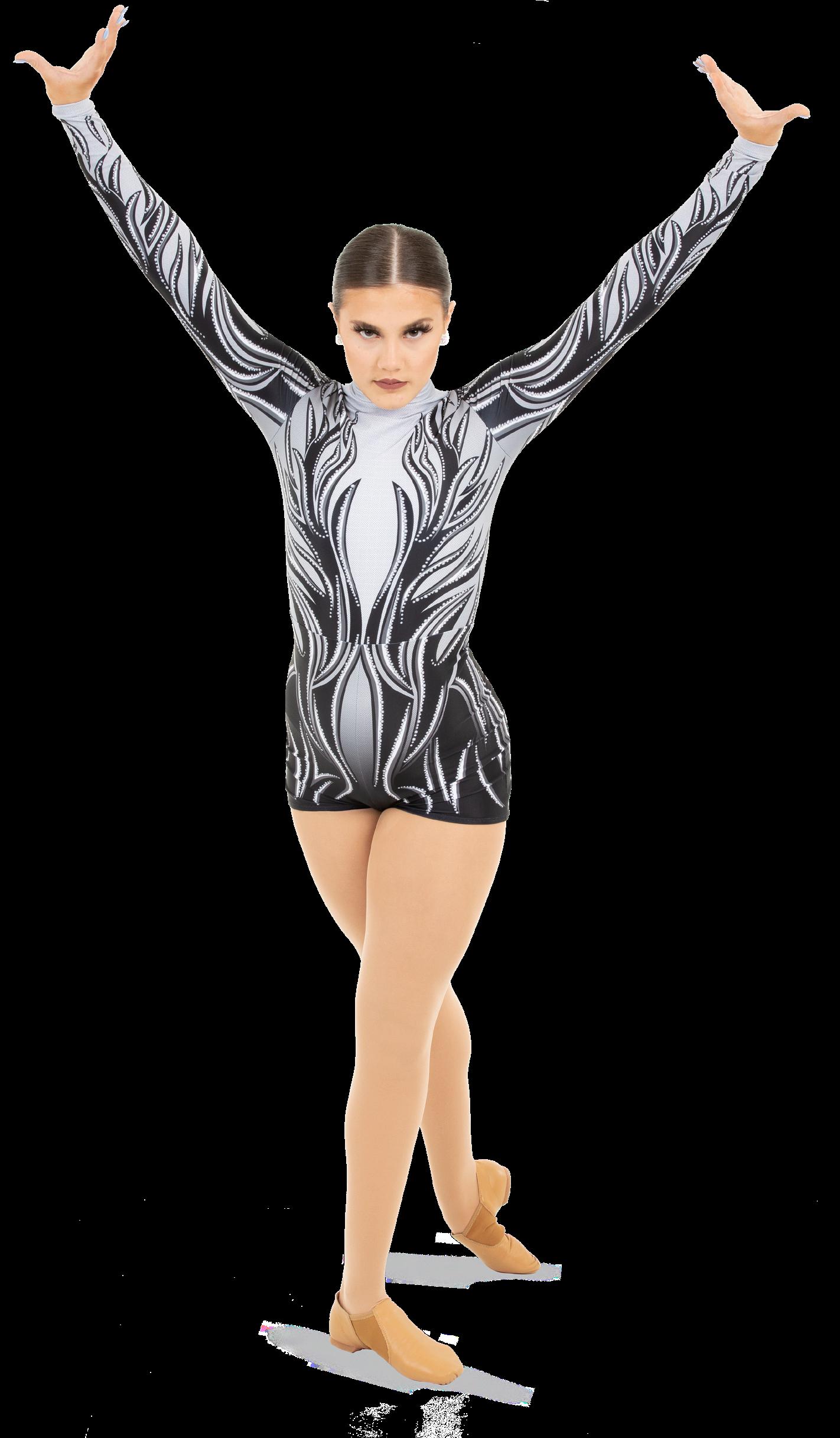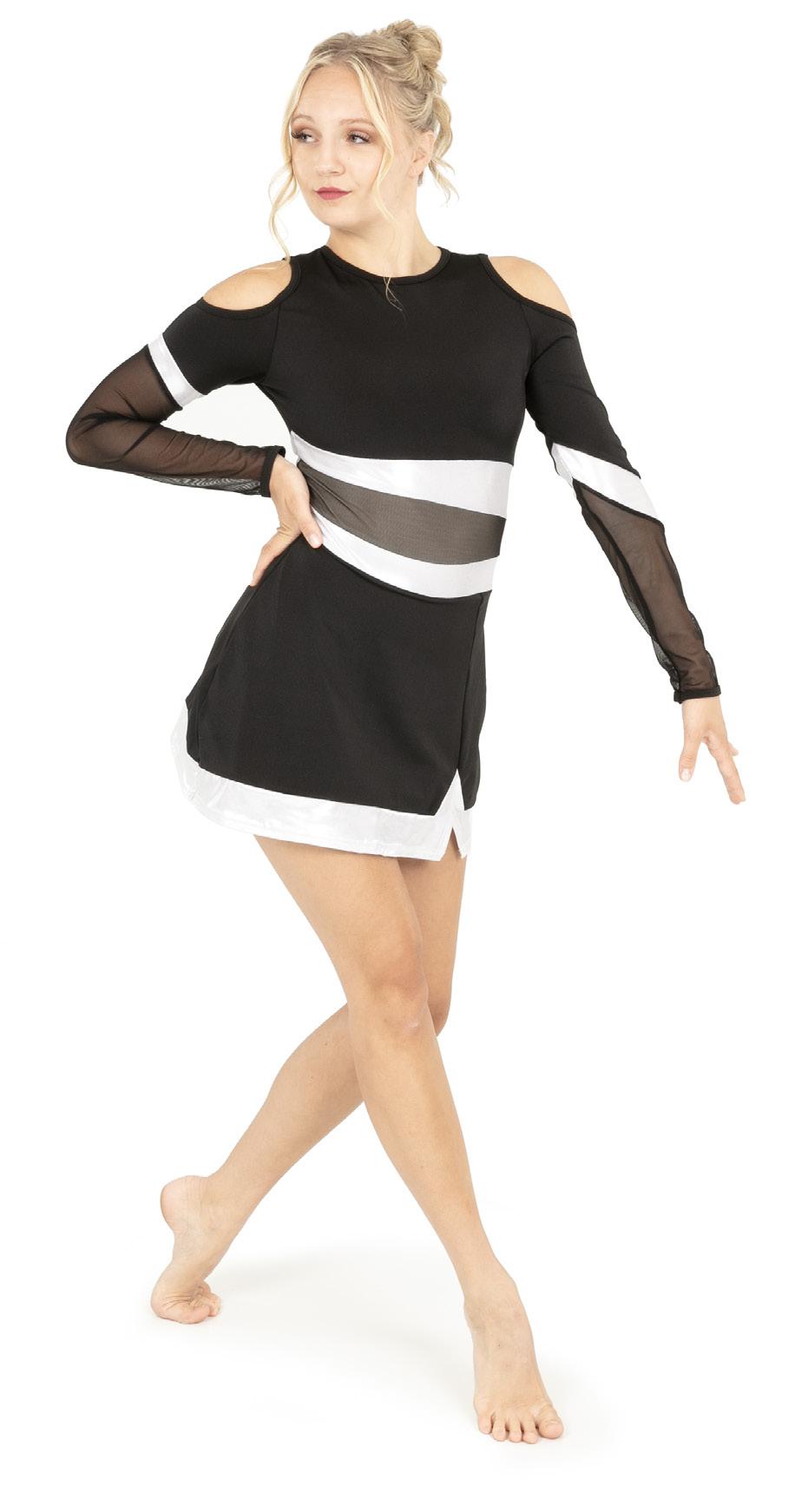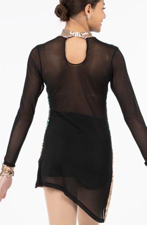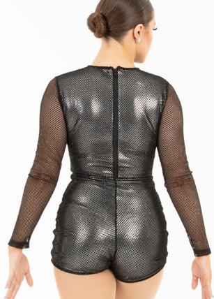 Alexandra. Asymmetrical dress with long sleeves consists of a cutout shoulder panel, asymmetrical silver foil, and black mesh panels. A tank shoulder and circle neckline bodice consists of asymmetrical silver foil and black mesh midriff panels. The midriff panel is lined. Attached skort with a foil hem panel to finish the look. Tricot leotard bottoms. Center back zipper closure.