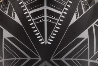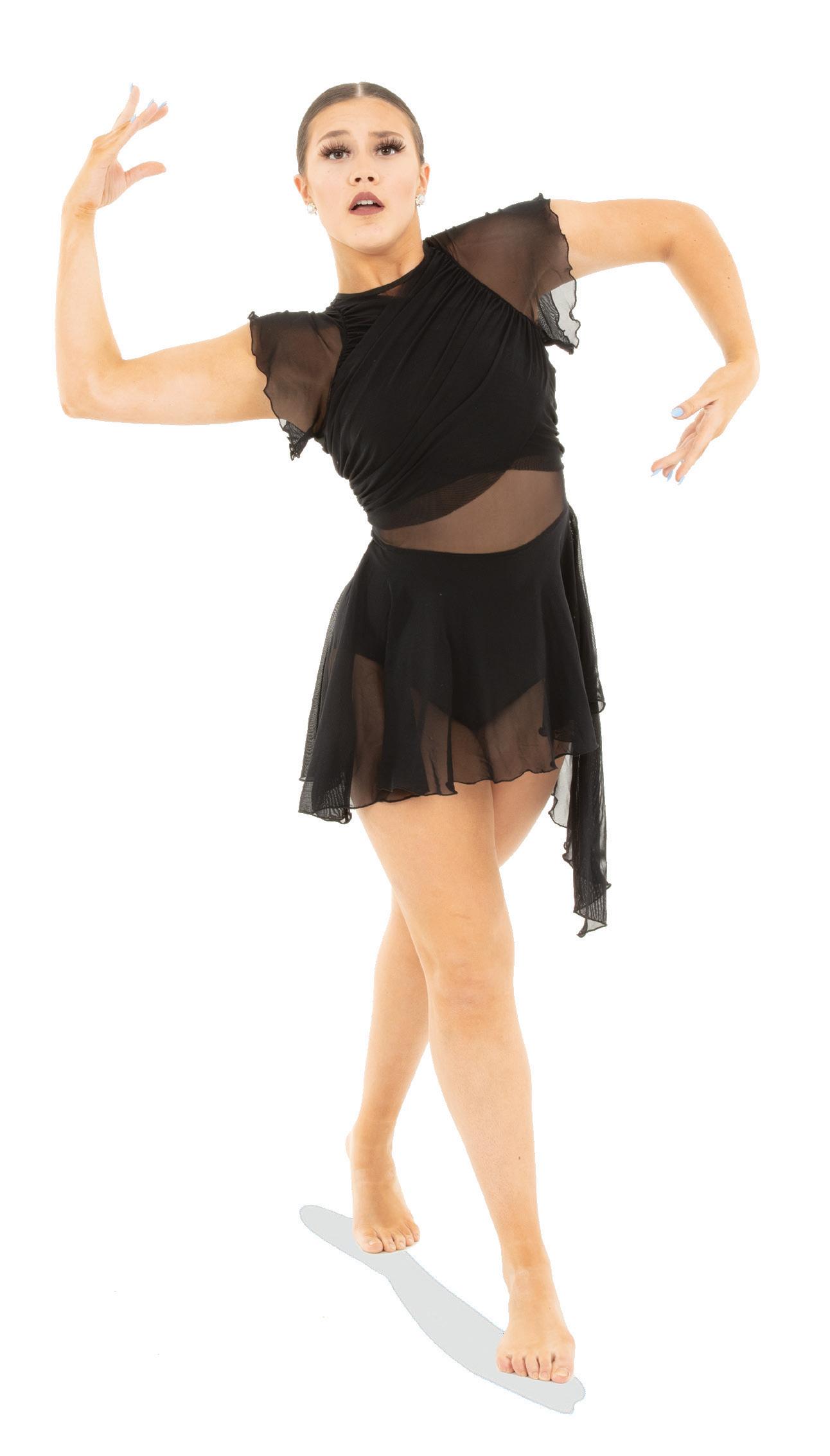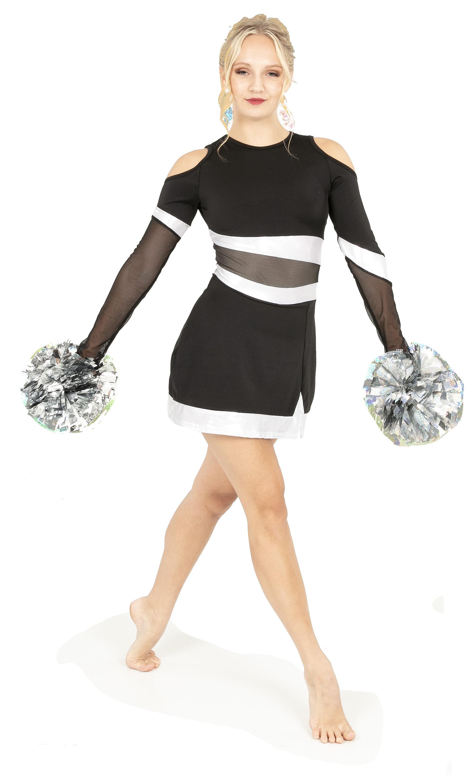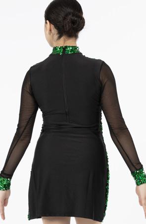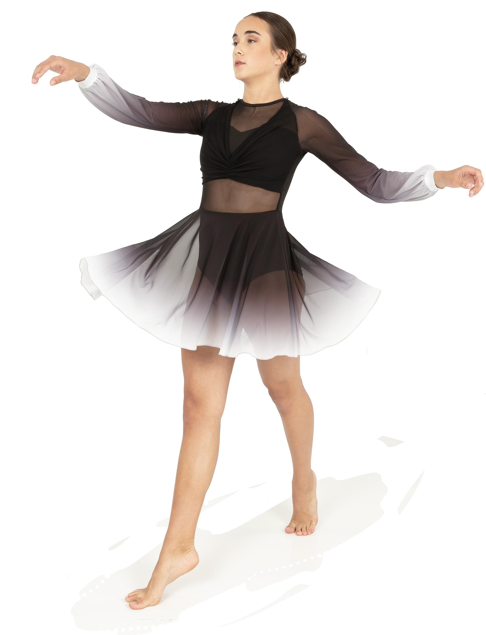 Alexandra. Asymmetrical dress with long sleeves consists of a cutout shoulder panel, asymmetrical silver foil, and black mesh panels. A tank shoulder and circle neckline bodice consists of asymmetrical silver foil and black mesh midriff panels. The midriff panel is lined. Attached skort with a foil hem panel to finish the look. Tricot leotard bottoms. Center back zipper closure.
