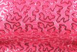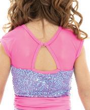 Alexandra. Full sequin tricot stretch biketard features iridescent sequins, upper neon pink mesh panel and cap sleeves. Binding along neckline and fully lined bodice. Gathered waistband and flower accents the waistline. The back features a upper mesh keyhole panel with g-hook closure. Enclosed elastic waistband. Nylon, Spandex.