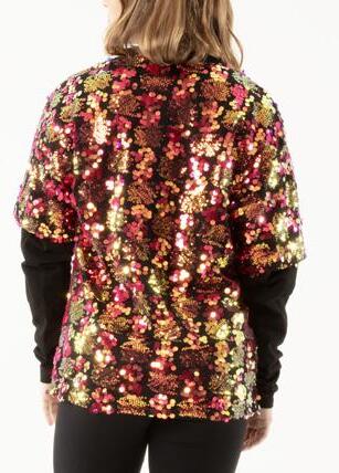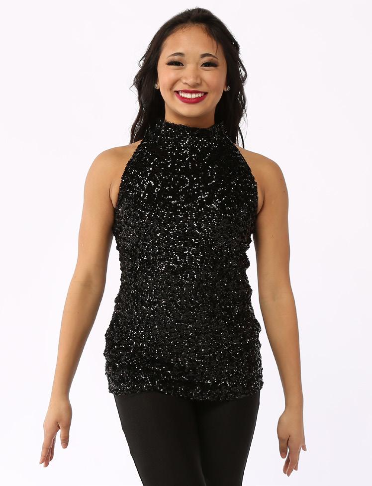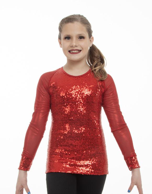 This performance sequin top features mocked raglan cut mesh sleeves with wider shoulder seams for undergarment coverage. The foiled sheen mesh and accented sequin panel cuffs on the sleeve add just the right amount of glamour. The back includes a matching color foil stretch fabric. Front lined, binding along the neckline for comfort. Polyester, Nylon.