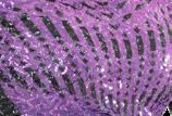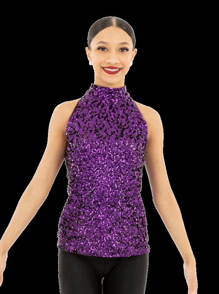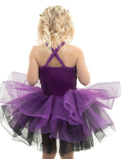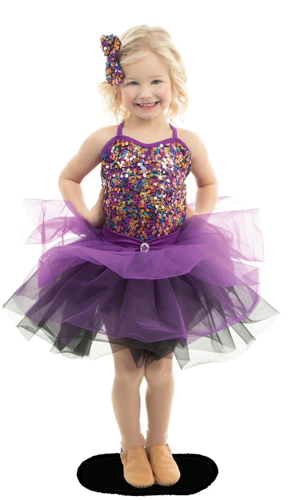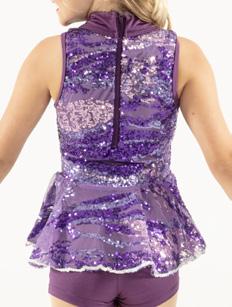 Purple multi-colored sequin skirted leotard with a sweetheart neckline bodice and criss cross adjustable straps, multi-layered tulle skirt in purple and black, accented gathered tricot waistband with a jewel brooch. Binding at neckline and armhole. Nylon, Spandex.