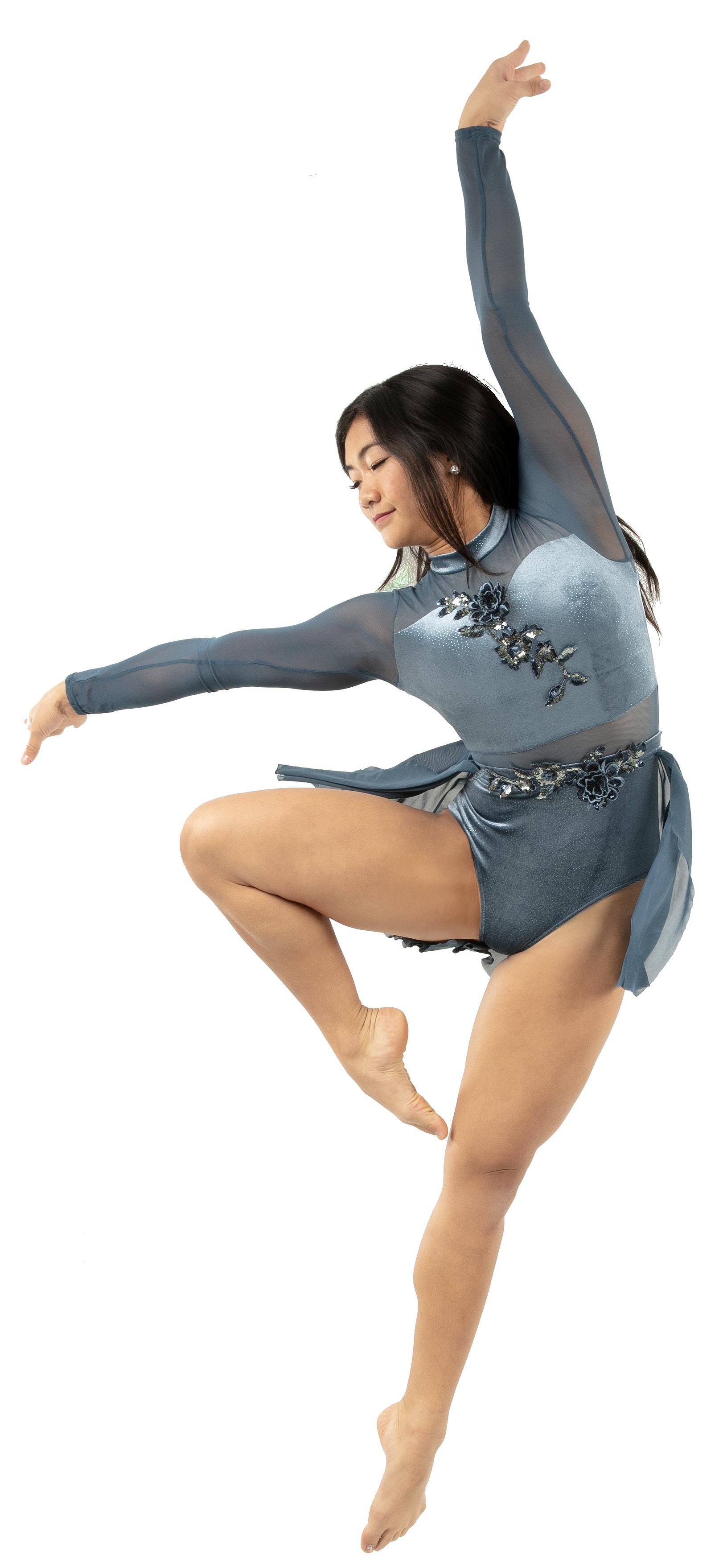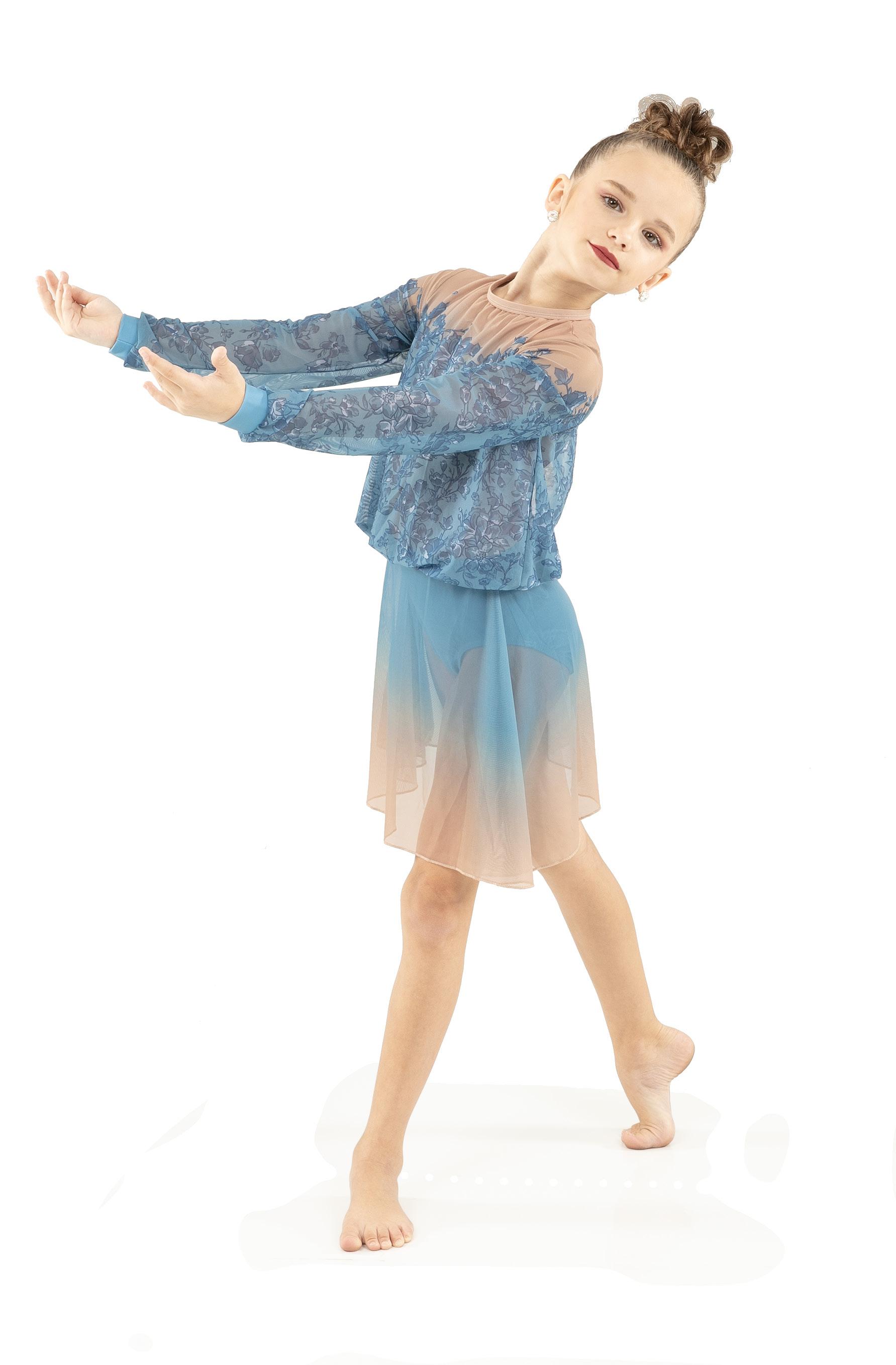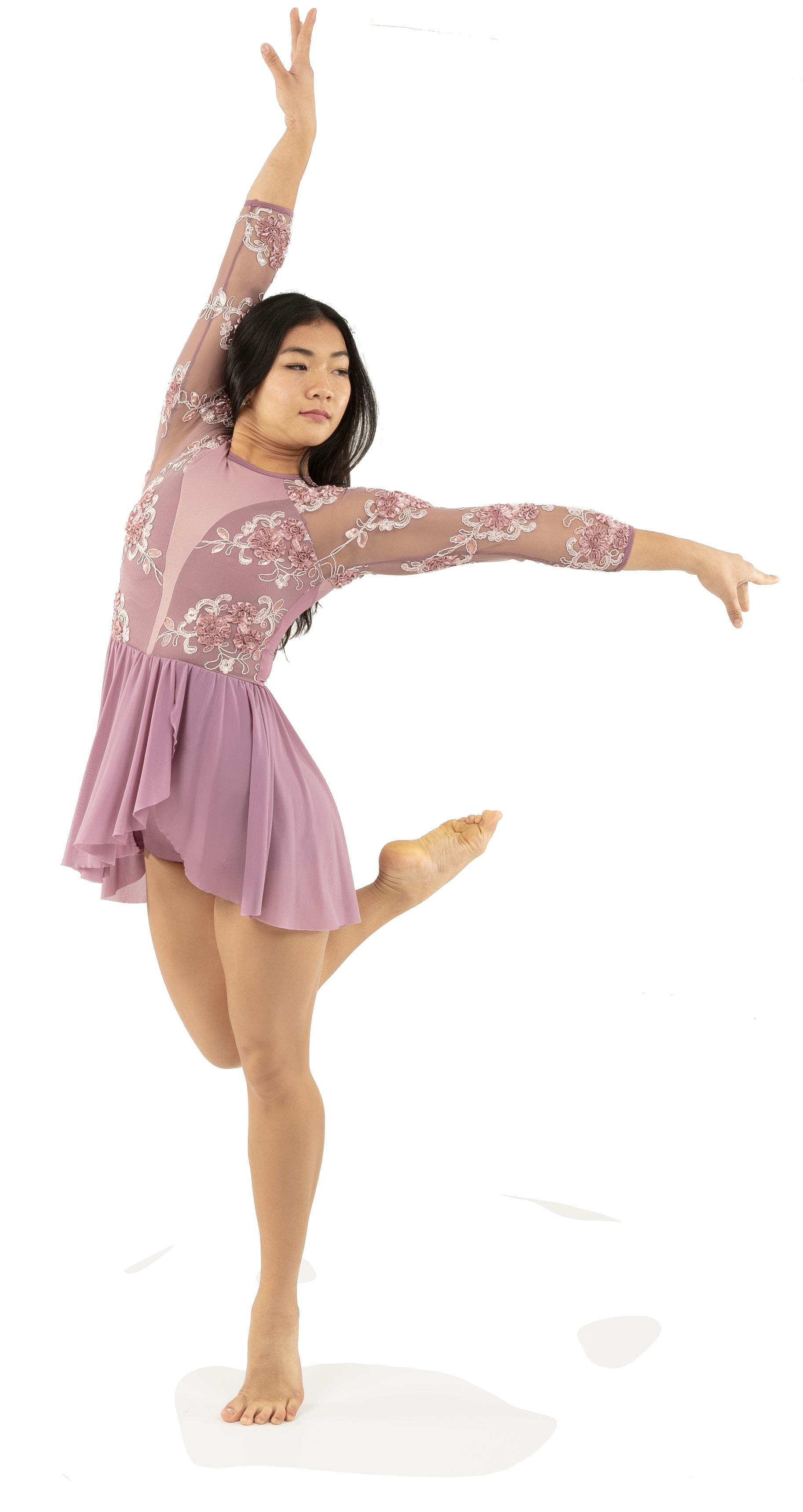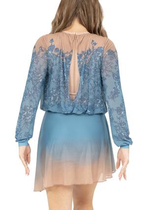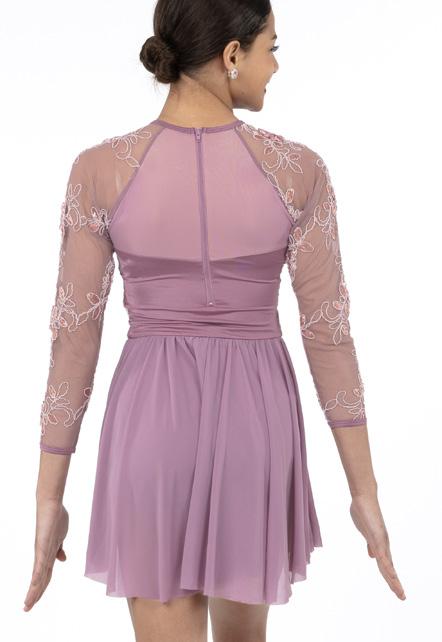 Alexandra. Romantic lyrical costume. The skirted long mesh sleeve leotard features gathered front panel, and a gathered skirt that is accented with romantic appliques. Fully lined front and back. Center back zipper closure. Nylon, Spandex.