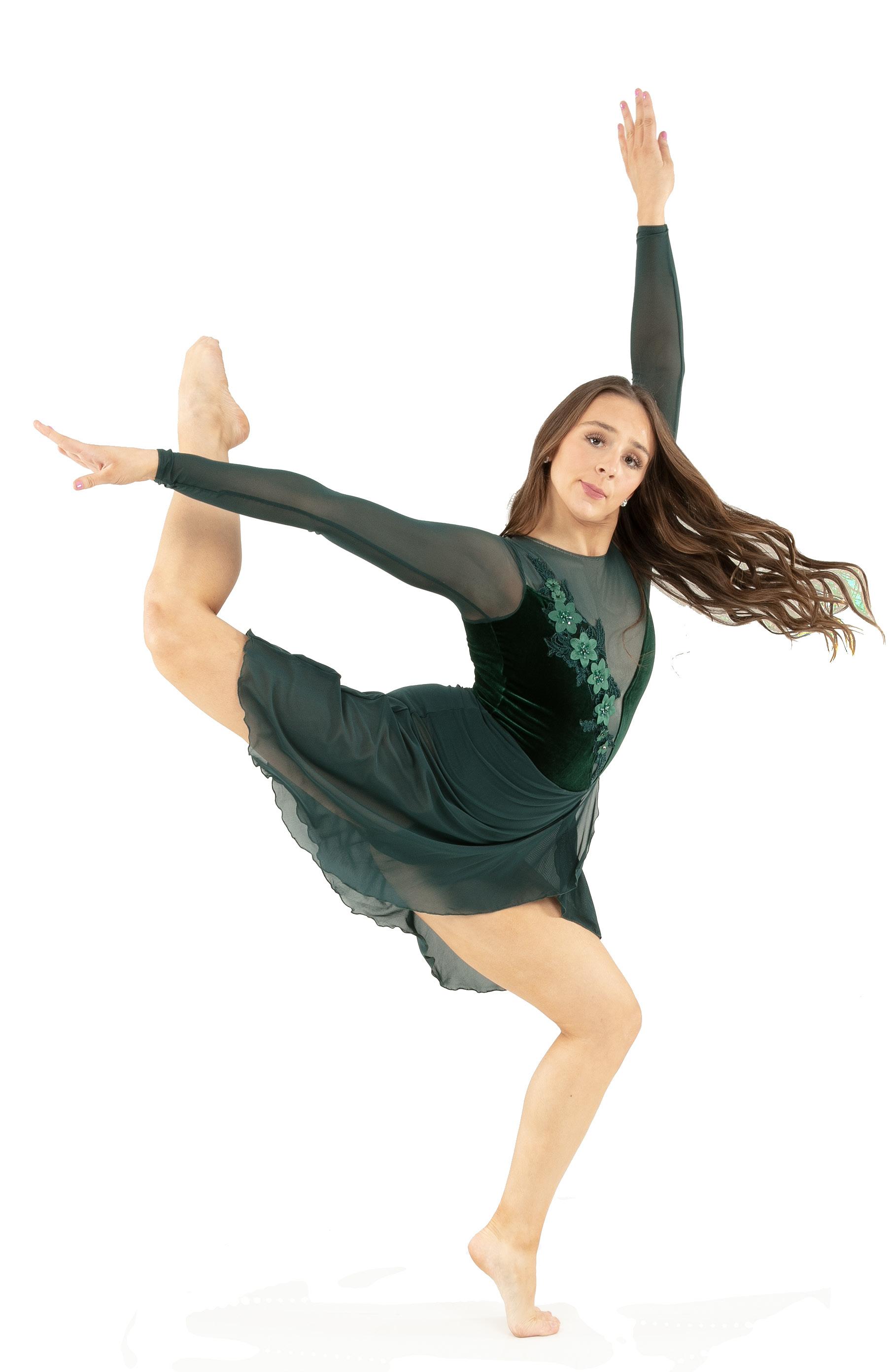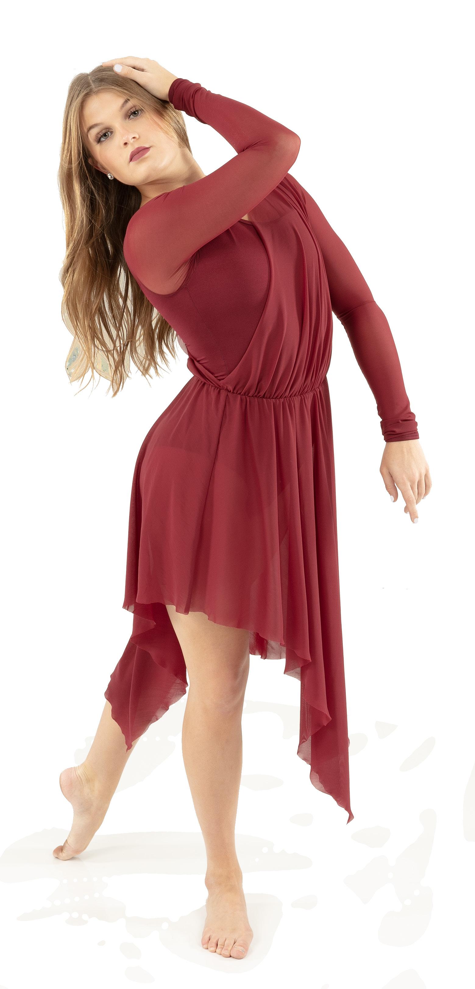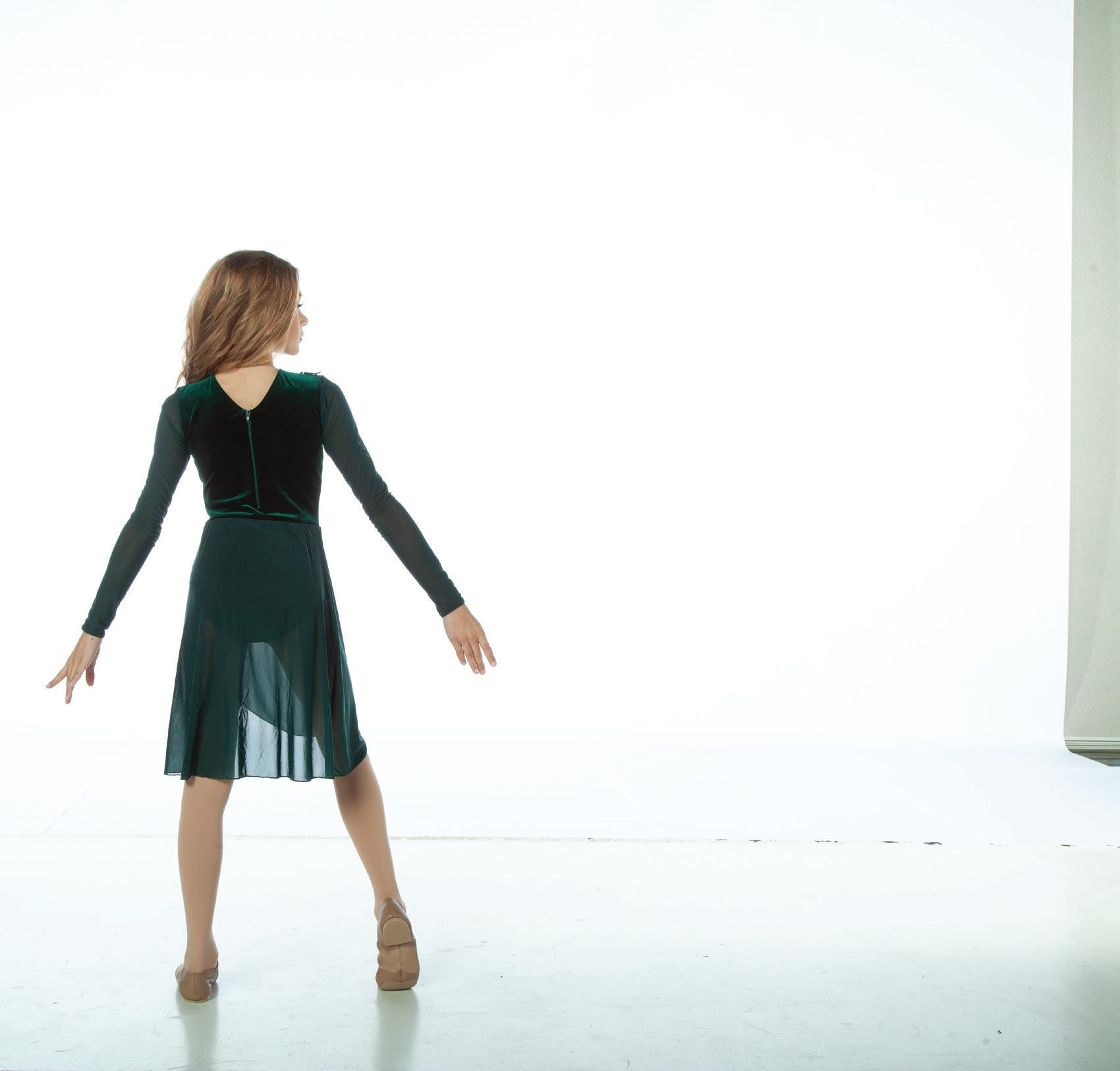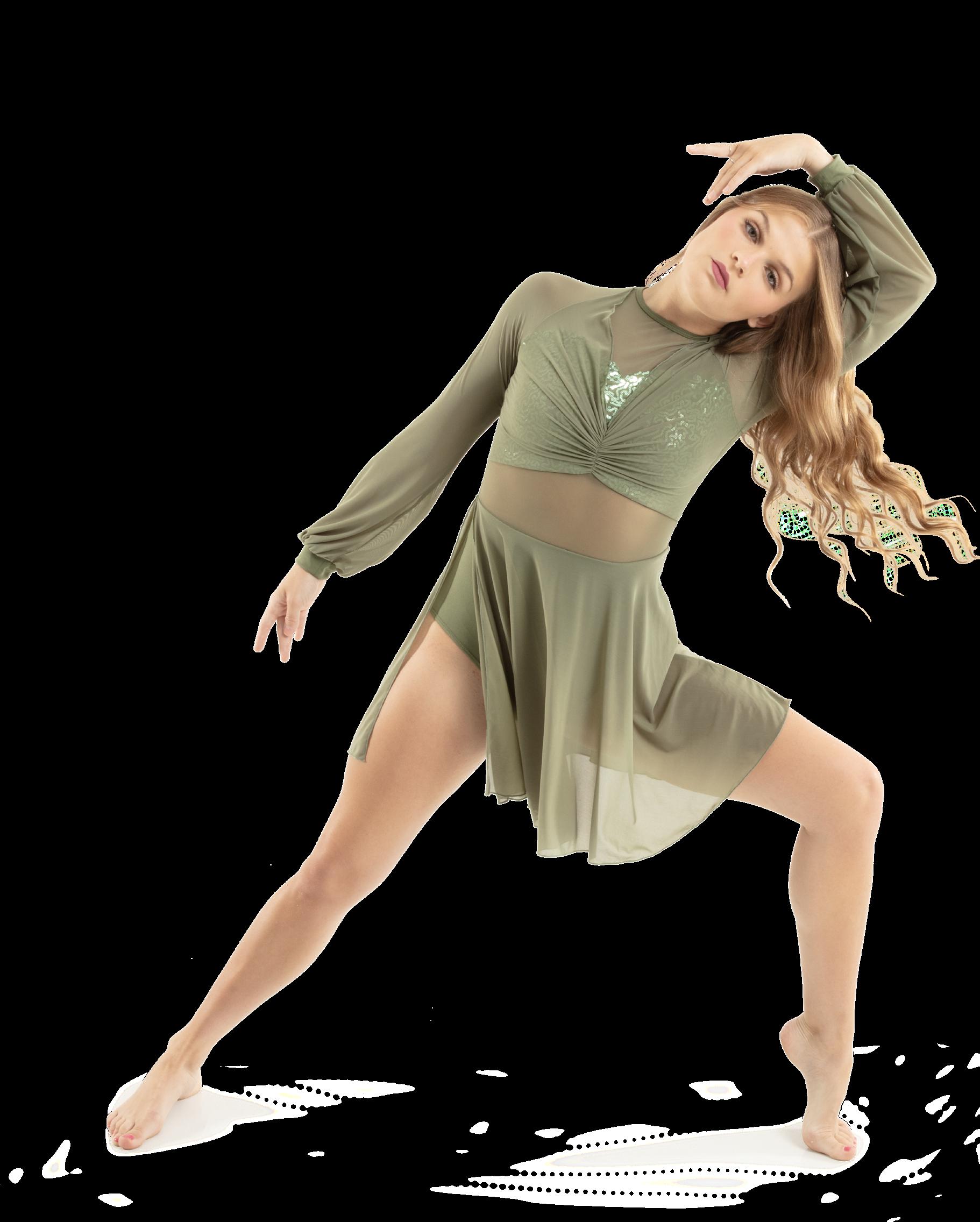Alexandra. Romantic lyrical costume. The skirted long mesh sleeve leotard features gathered front panel, and a gathered skirt that is accented with romantic appliques. Fully lined front and back. Center back zipper closure. Nylon, Spandex.