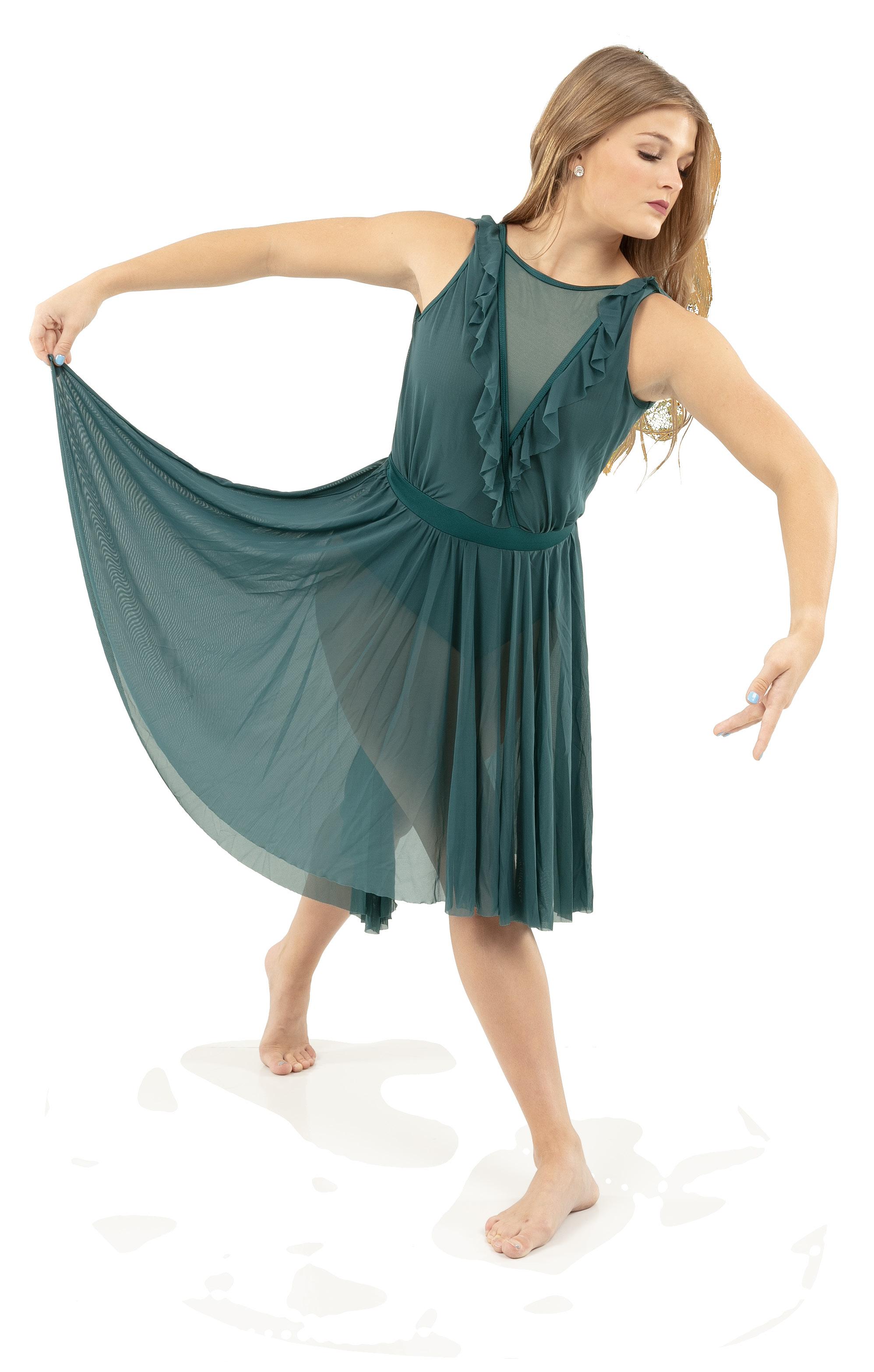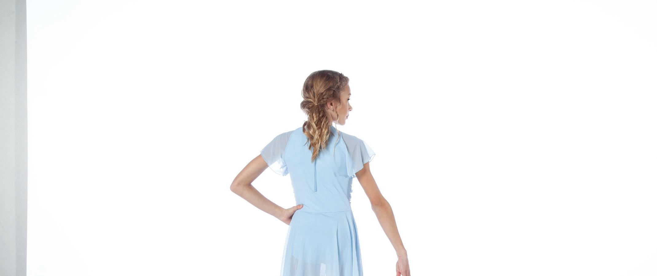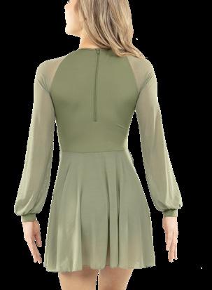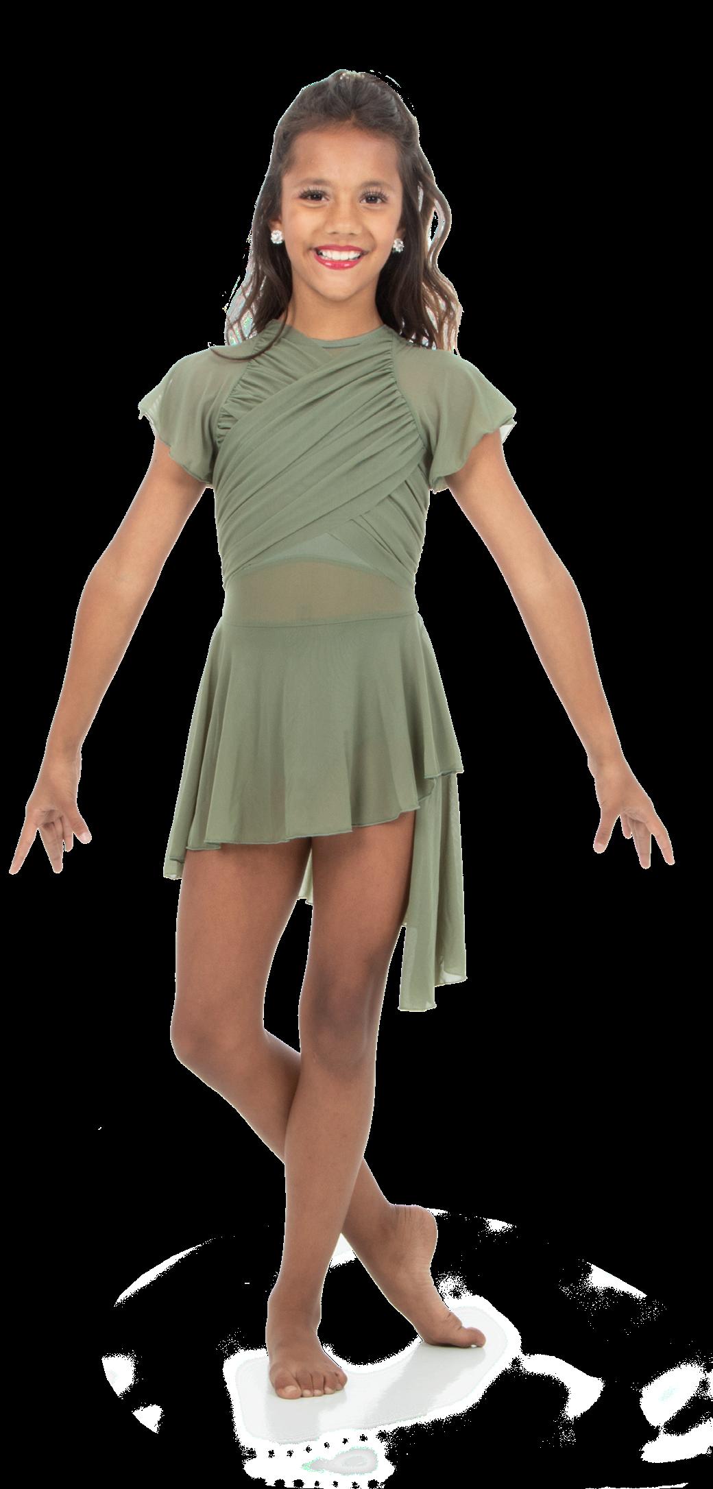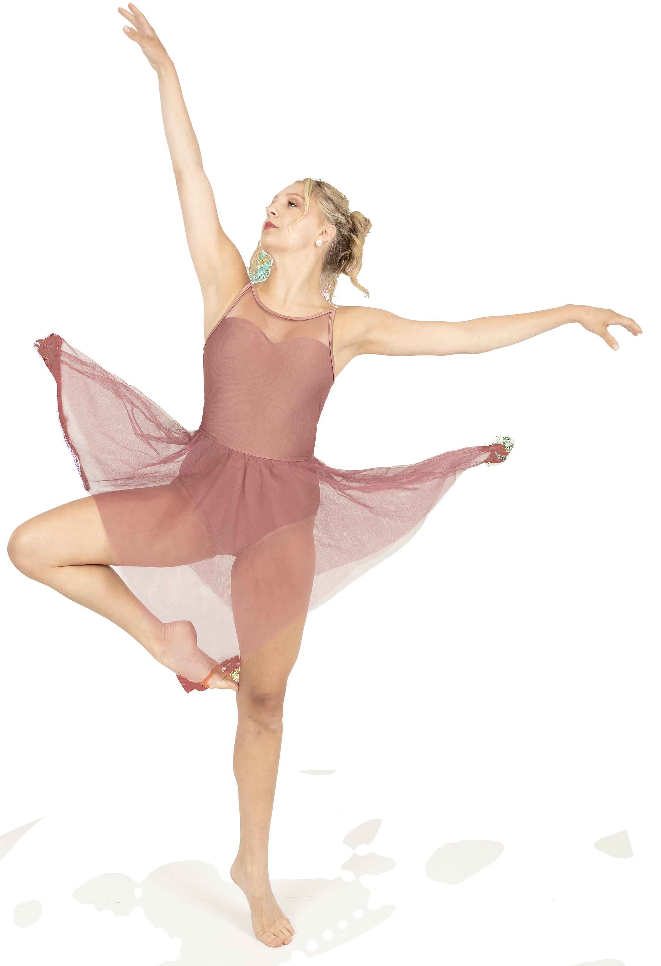 Alexandra. Romantic lyrical costume. The skirted long mesh sleeve leotard features gathered front panel, and a gathered skirt that is accented with romantic appliques. Fully lined front and back. Center back zipper closure. Nylon, Spandex.