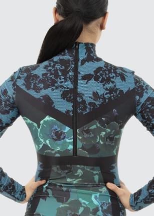 Alexandra. This dye sublimated damask inspired graphic design features long sleeve ruffle cuffs, gathered inverted waistline for slimming silhouette, open mesh back, and upper ruffle detail. Snap closure at the center back mock neckband. Fully Lined. Polyester, Spandex.