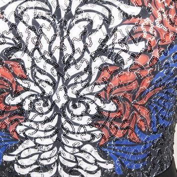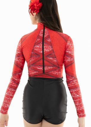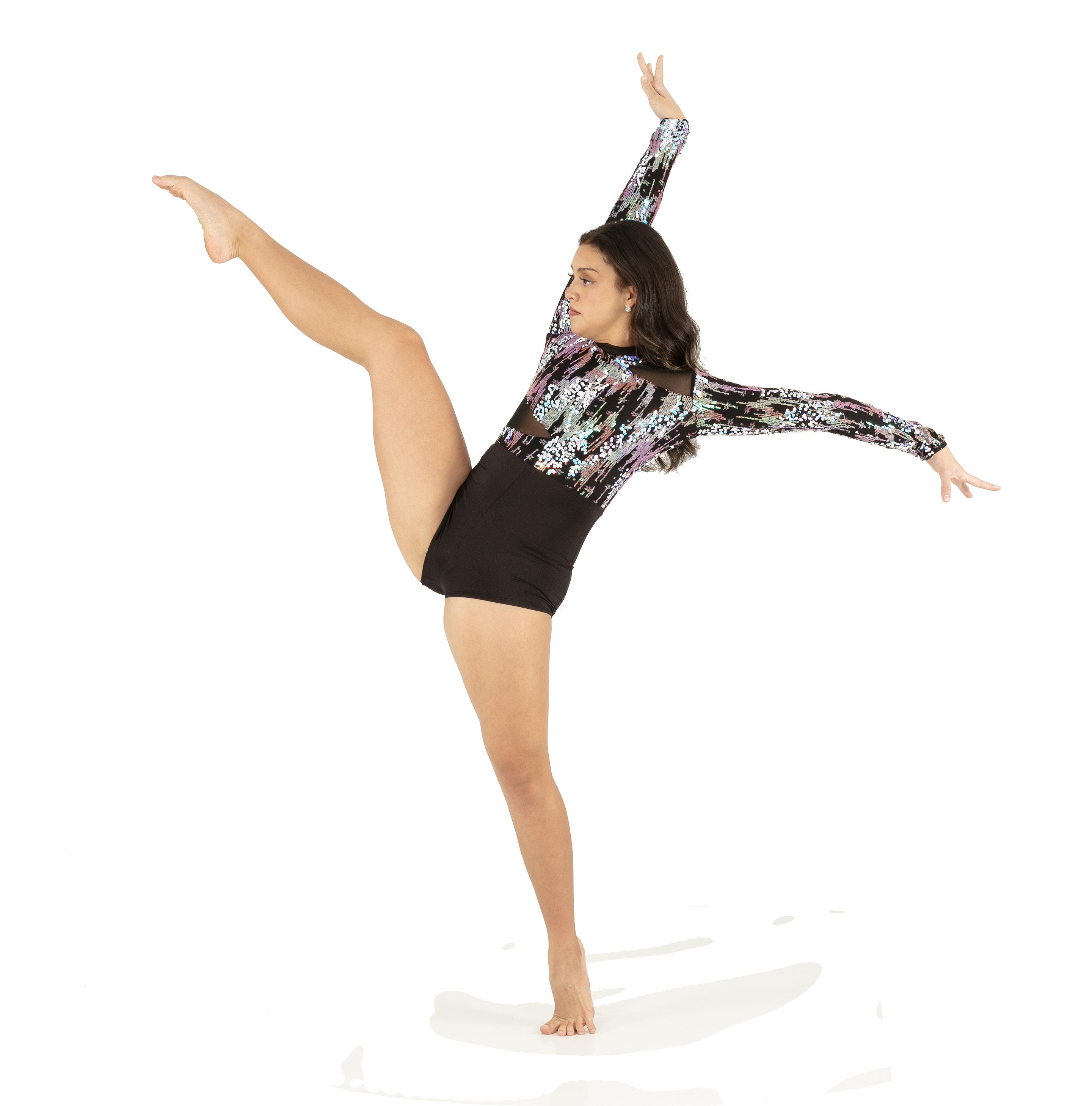 Alexandra. Sequin tricot leotard features a colorful graphic line design that works for any style of dance. A strategic line design accentuates body lines and offers a moderate leg opening with a full coverage bottom. Binding around leg opening and fully enclosed lining for extra comfort. Center back zipper closure. Polyester, Spandex.