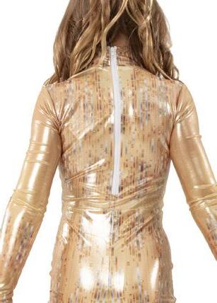Costume features a 3-layered glitter tulle tutu, sequin bodice and an open keyhole back with g-hook closure. Fully lined with binding around neckline and armhole. Polyester, Nylon.