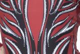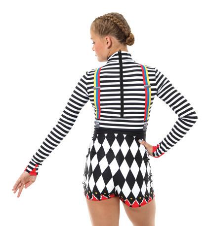 Alexandra. Colorful zig-zag sequin fabric and luxurious black velvet add elegance to this biketard. Layered cap and elongated half sleeve, diamond keyhole, and side sequin panel bottoms. G-hook closure. Velvet, Sequins, Nylon, Spandex.