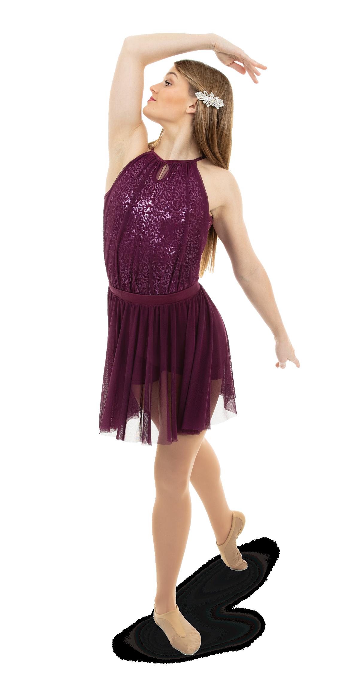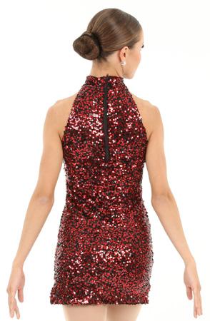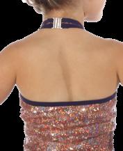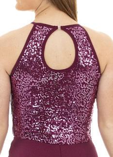 Alexandra. All over sequin performance halter dress. Mock neckband with a zip-up back. Two color sequin bodice with knit fabric lining for comfort. Side slits for full range motion.