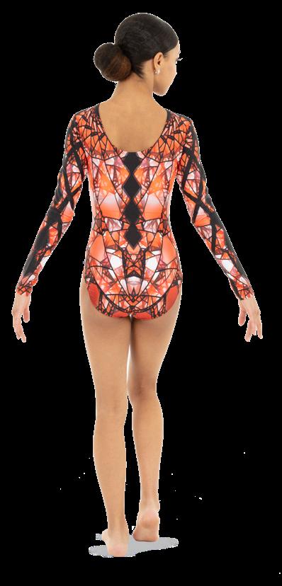 Alexandra. Dye-sublimated print that includes vivid bright colors, stained glass geometric shapes, and line design graphics. Long sleeve circle neck leotard. Fully lined. Polyester, Spandex.