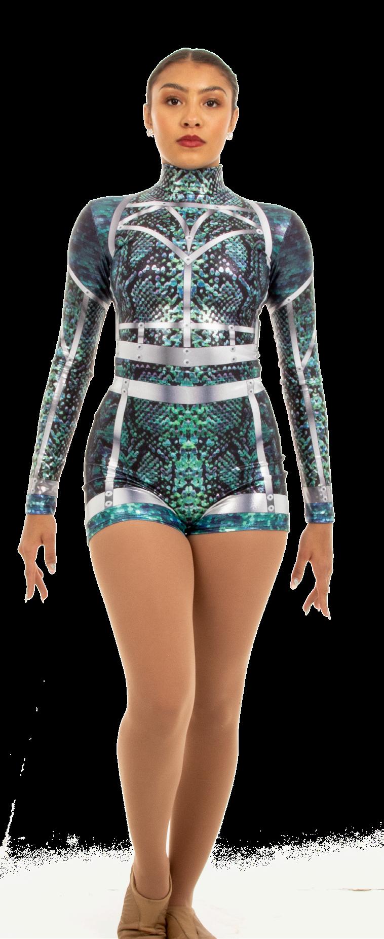 Alexandra. Elegant long sleeve biketard featuring a dye-sublimated jeweled and beaded design with an illusion sweetheart neckline. Fully Lined. Center back zipper. Polyester, Spandex.