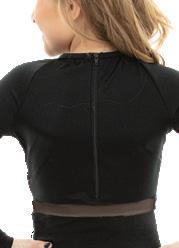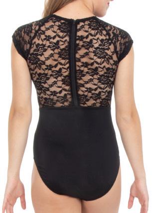 Illusion sweetheart neckline with upper front and side mesh panels that extend to the back. No lining behind mesh panel. Black tricot foundation leotard and sleeves add a slimming silhouette. Center back zipper and front lining. Nylon, Spandex.