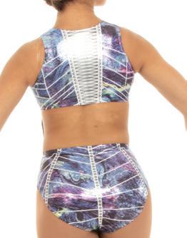 Alexandra. Sparkling biketard featuring a high neck sequin tricot bodice with a keyhole, a gathered overlay mesh panel. Sequin tricot back bodice with keyhole and g-hook closure. Binding around armhole and neckline for comfort. Nylon, Spandex.