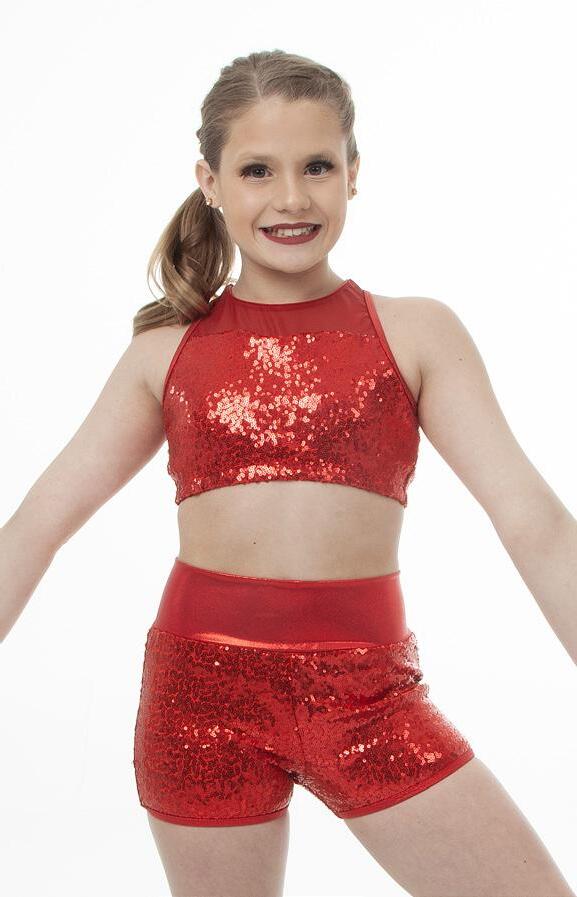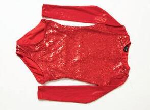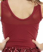 Alexandra. Sequin biketard features a peplum sequin skirt, sequin v-neck bodice with an upper mesh panel and a bow accented at the waistline. The back includes a scoop neckline upper mesh panel and Tricot back. Burgundy tricot shorts. Pull on costume, fully lined with binding along neckline and armholes for comfort. Pair with a tiered tulle skirt to make this the perfect look. The tutu has an enclosed elastic waistband. Nylon, Spandex.