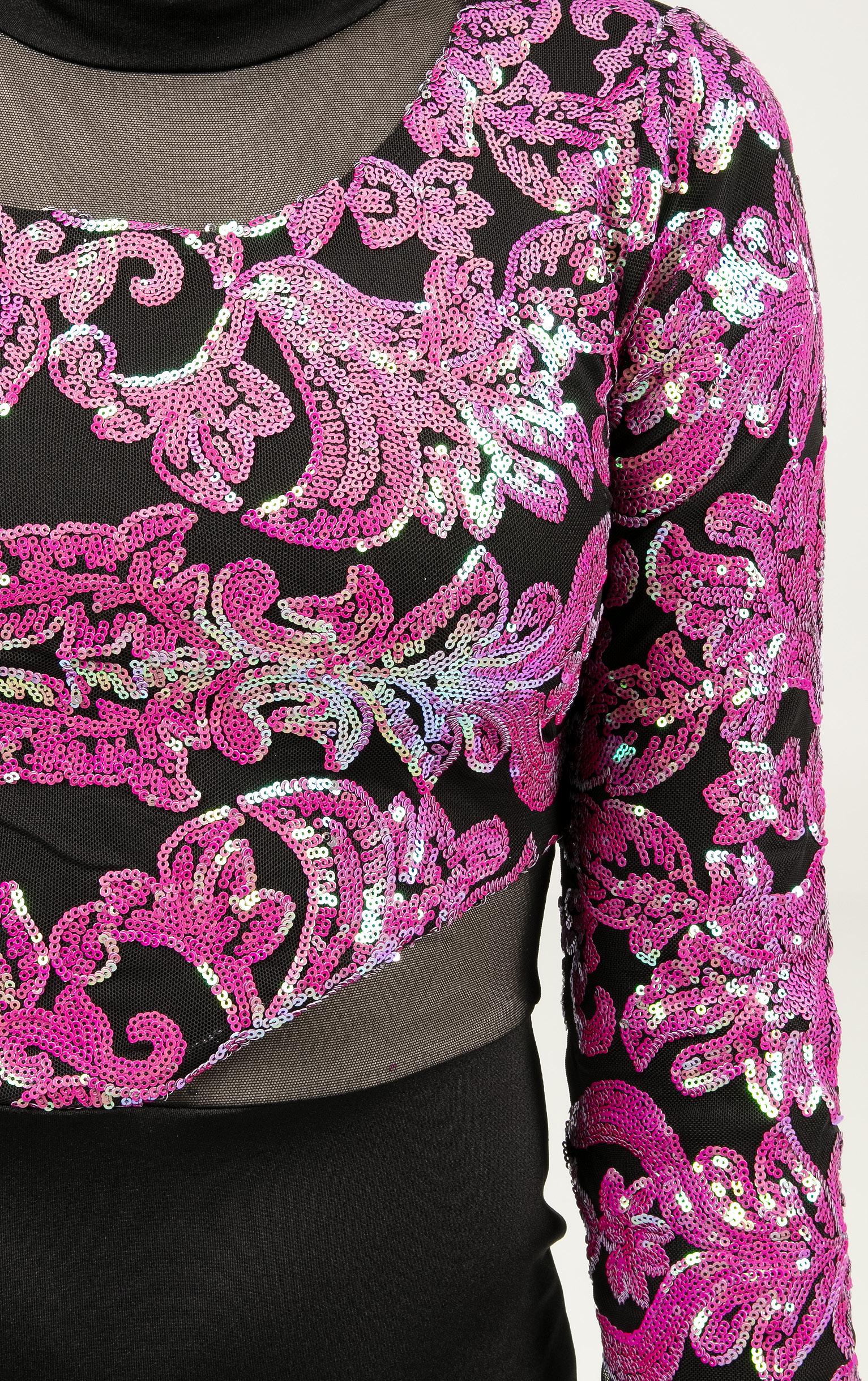 Alexandra. Long sleeve sequin tunic top front consists of sparkling sequins, black tricot back, black power mesh sleeves, with sequin cuffs. Fully lined on the front bodice, neckband, cuffs for comfort. Tunic dress length for extra coverage. Center back zipper. Nylon, Spandex.
