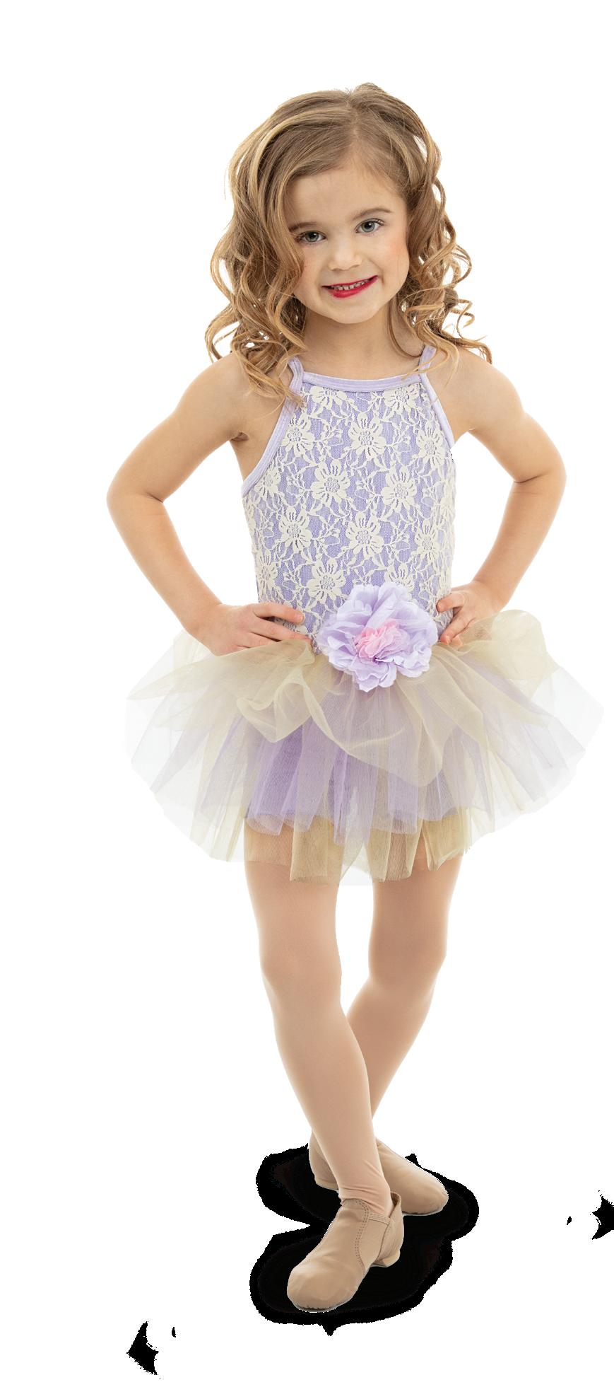 Alexandra. Lilac velvet and cream floral lace skirted biketard. Scoop neckline bodice with spaghetti straps, multi-layer glittered tulle skirt in purple and cream. The waistline is accented with a purple and pink flower. Binding at neckline and armhole for comfort. Nylon, Spandex.