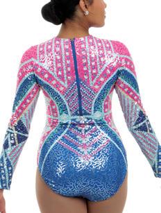 Alexandra. Biketard with a diamond pattern sequin bodice along with long mesh sleeves and sequin cuffs. Keyhole back with a g-hook closure. Side tricot bodice panels. Nylon, Spandex. Sizes: XS-4XL (adult) 8,10,12,14 (youth)