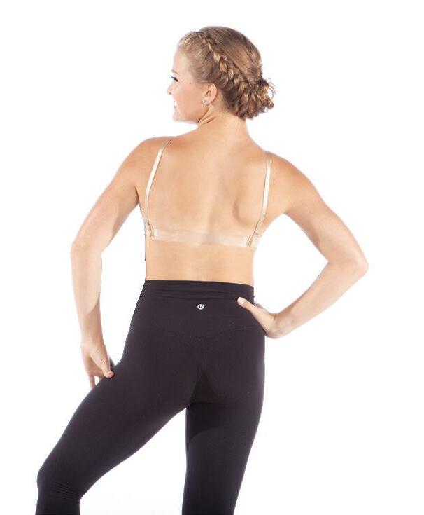 Capezio. Double layered. Detachable back clear strap, adjustable nude and clear shoulder straps included. Clear back strap. Nylon, Spandex.