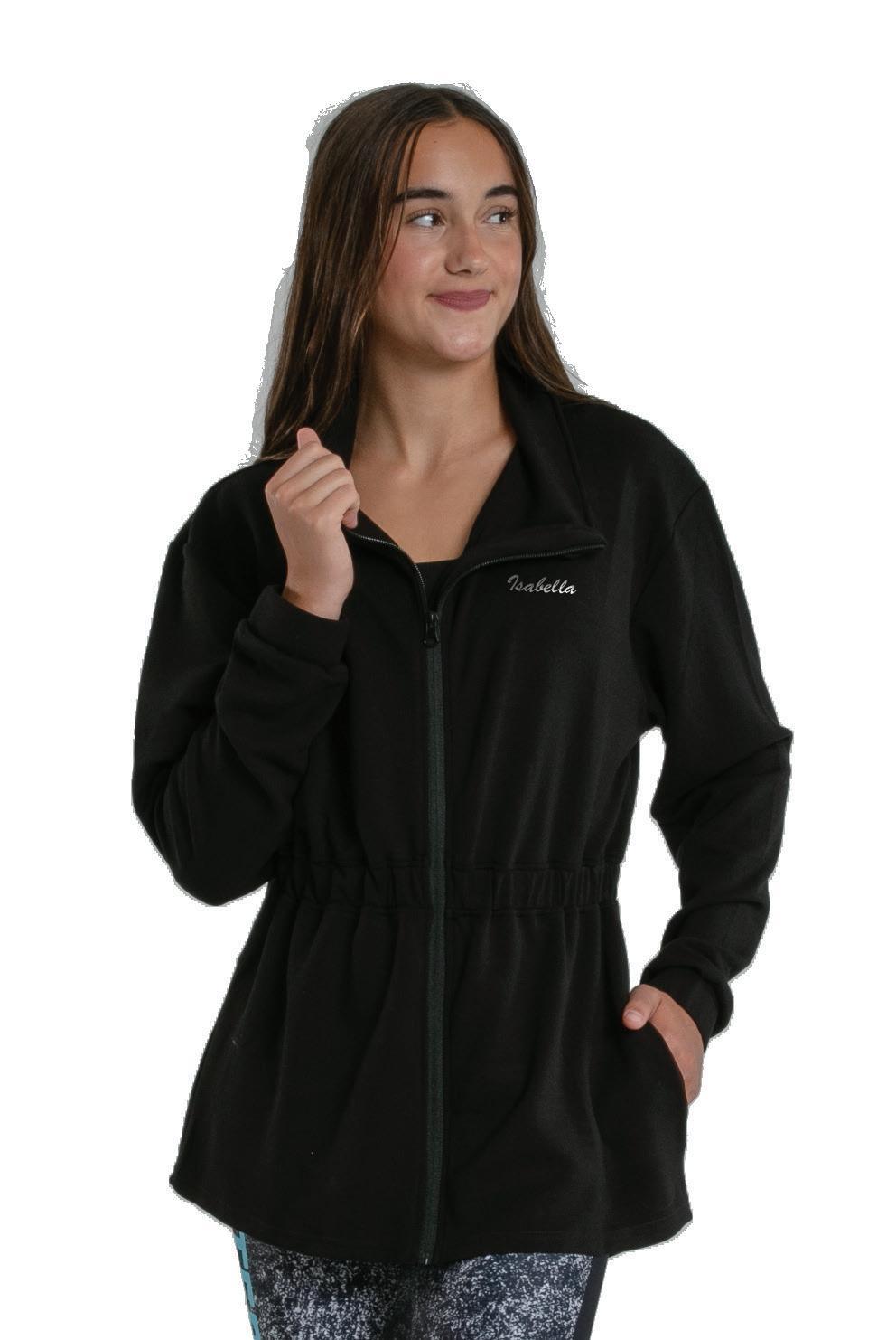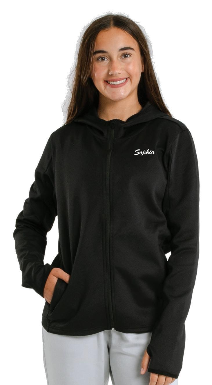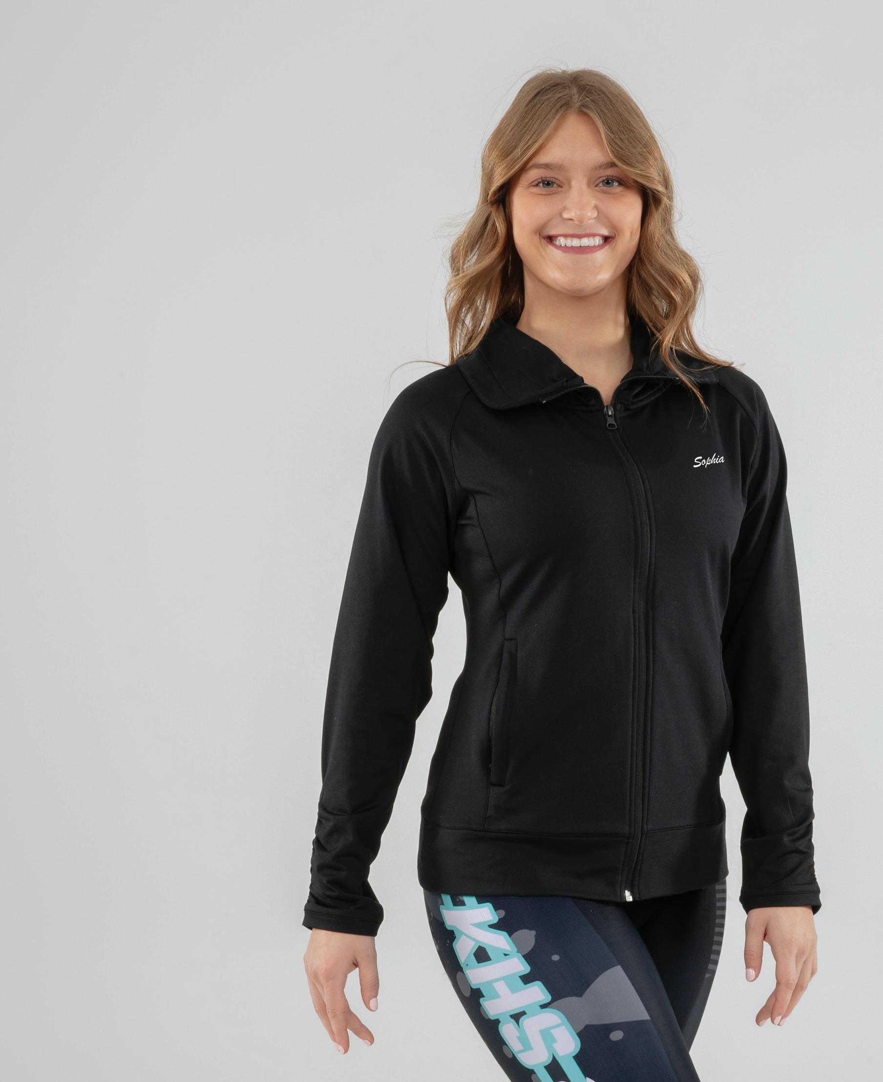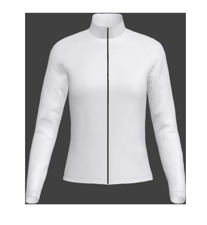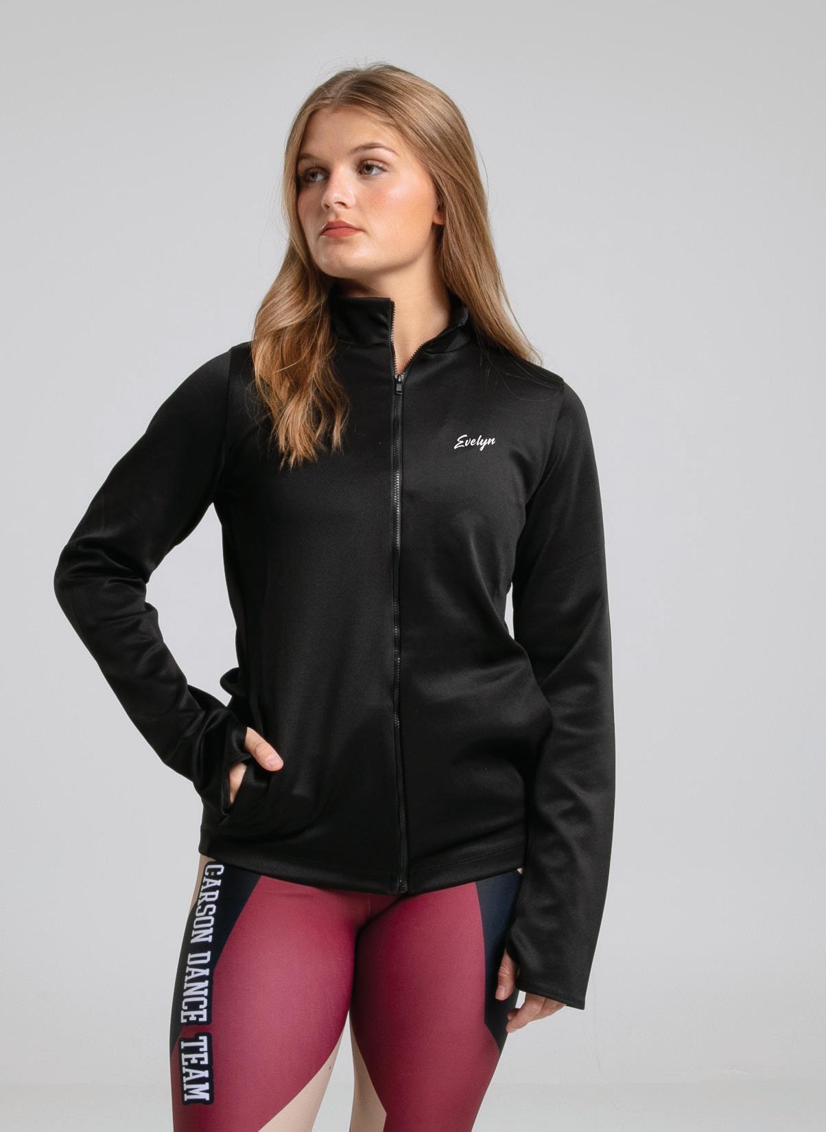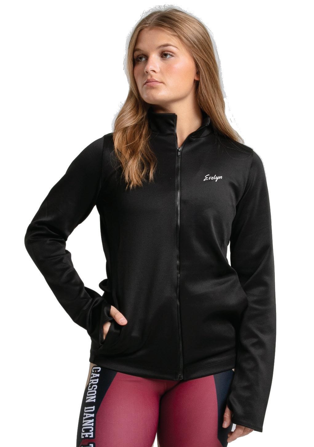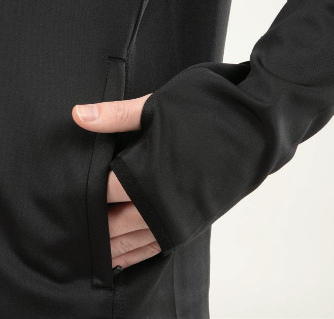 This is a must in every closet. The full zip warm-up jacket has a higher neck with a chin guard around the zipper. Long sleeves with thumbholes, black binding along edges for a clean, finished look. Zippered seam pockets. A curved back hemline for coverage. Stretch technical cool wicking fabric. Relaxed, unisex fit, hip length.