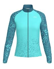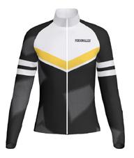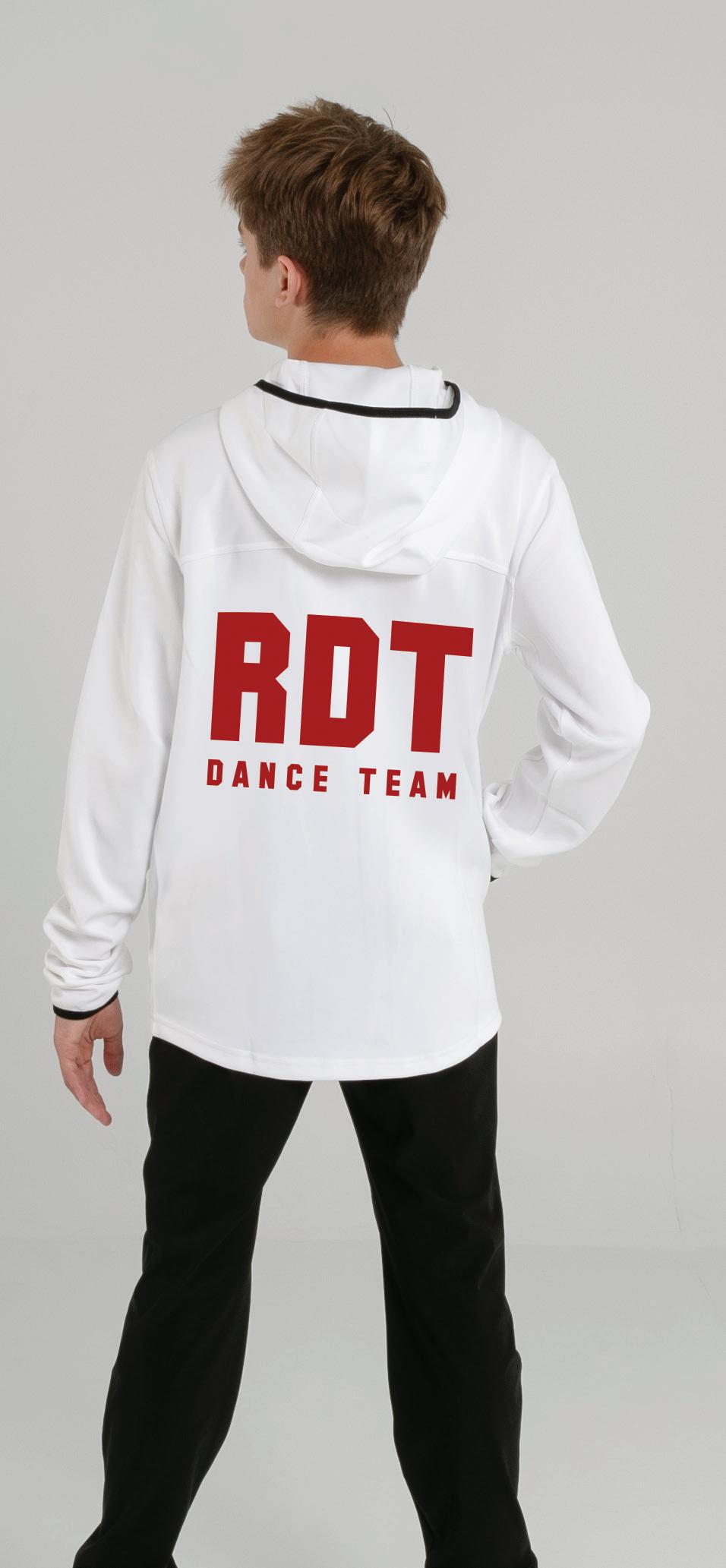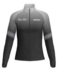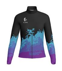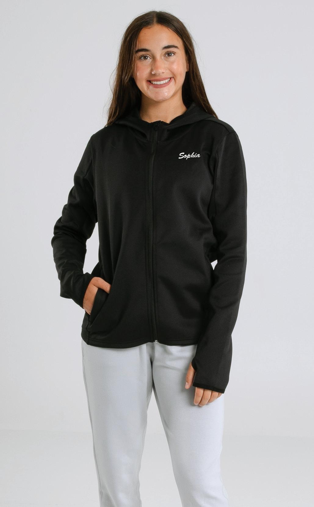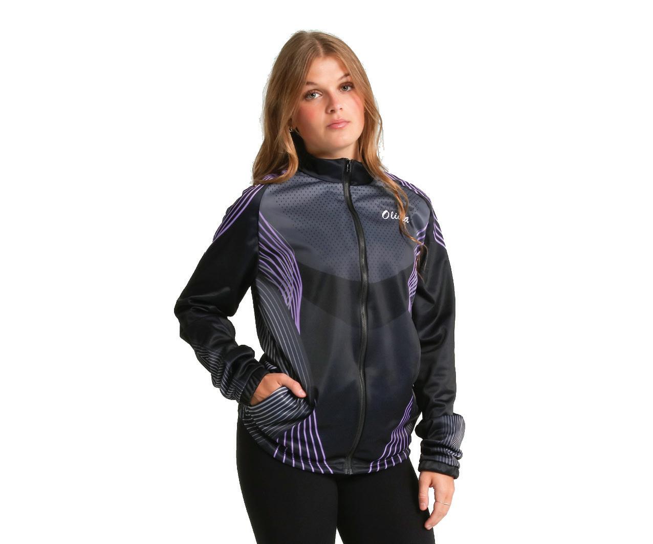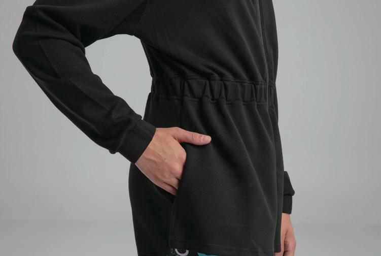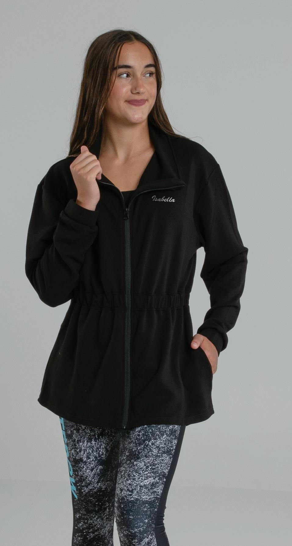 This is a must in every closet. The full zip warm-up jacket has a higher neck with a chin guard around the zipper. Long sleeves with thumbholes, black binding along edges for a clean, finished look. Zippered seam pockets. A curved back hemline for coverage. Stretch technical cool wicking fabric. Relaxed, unisex fit, hip length.