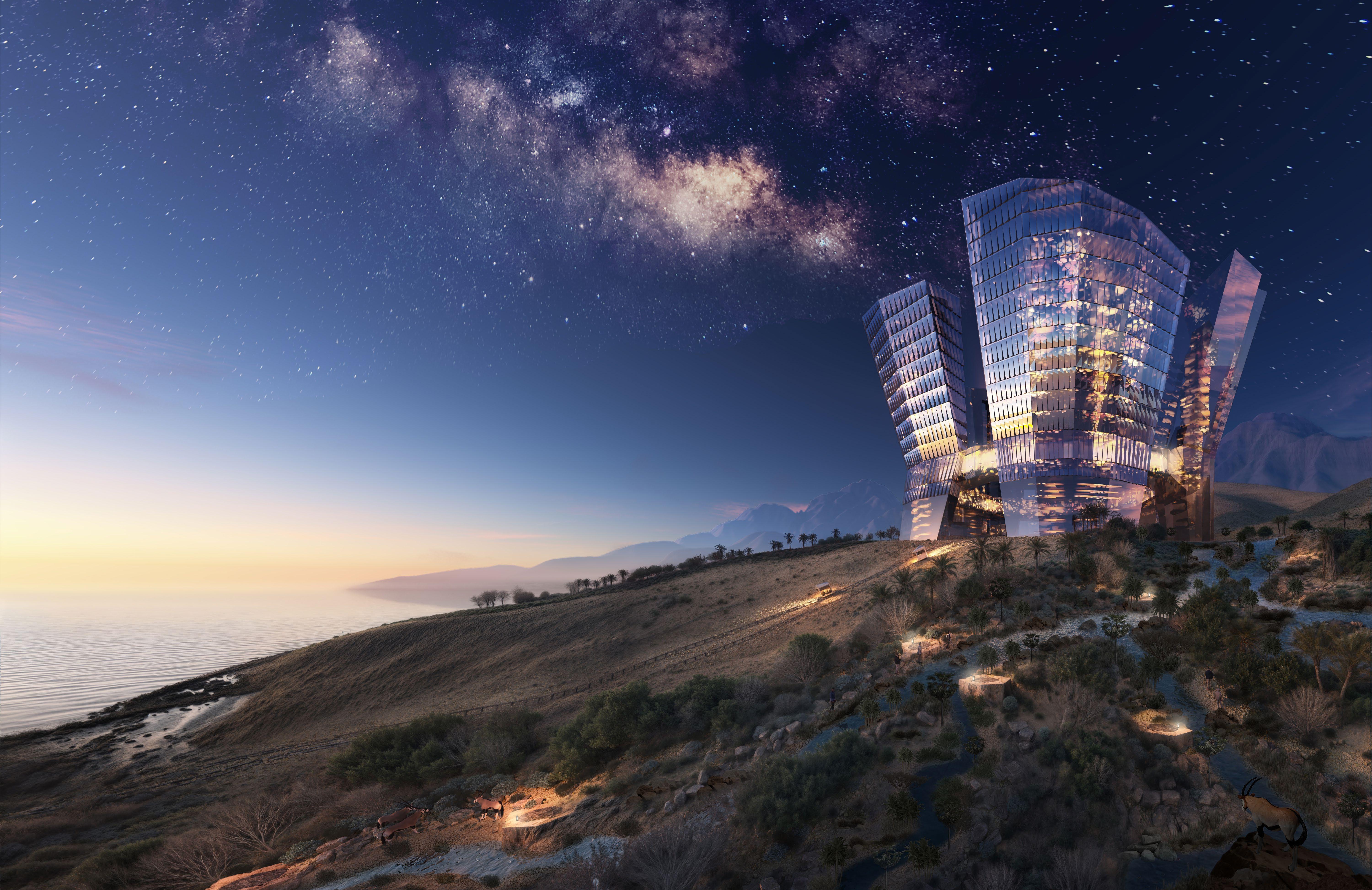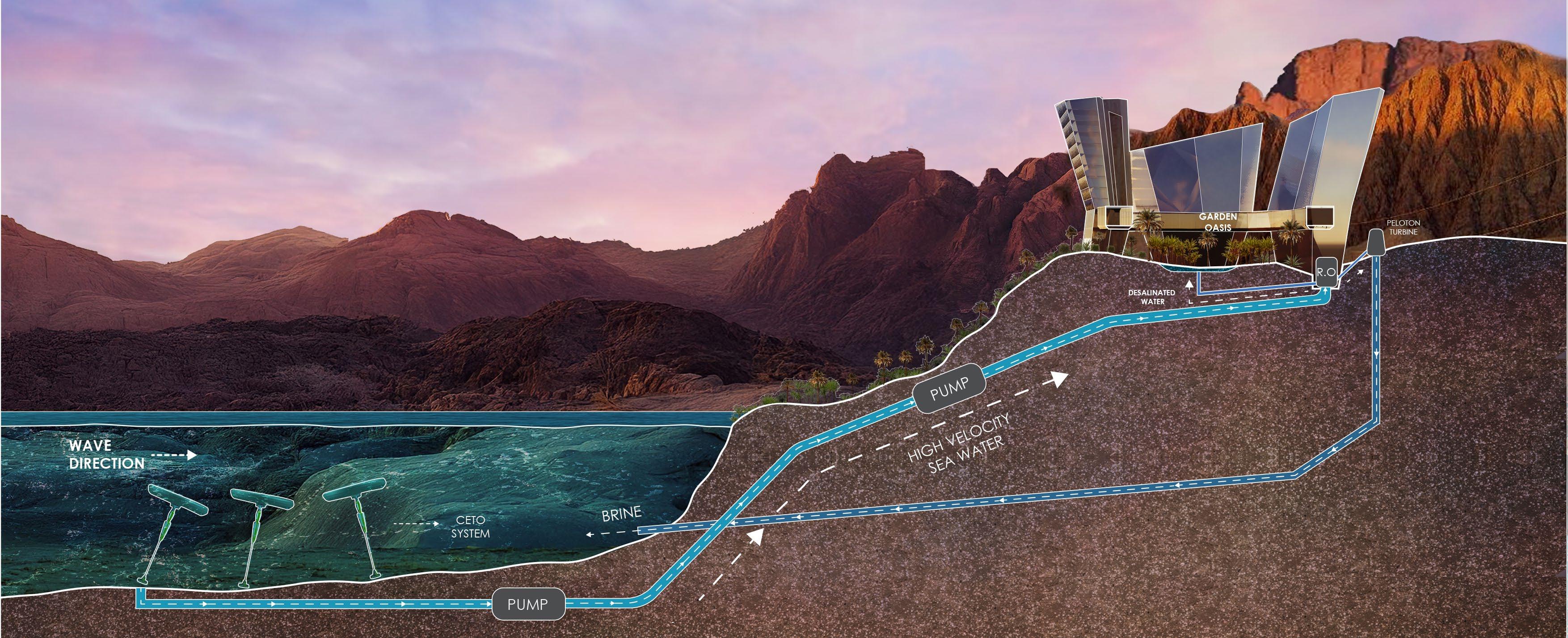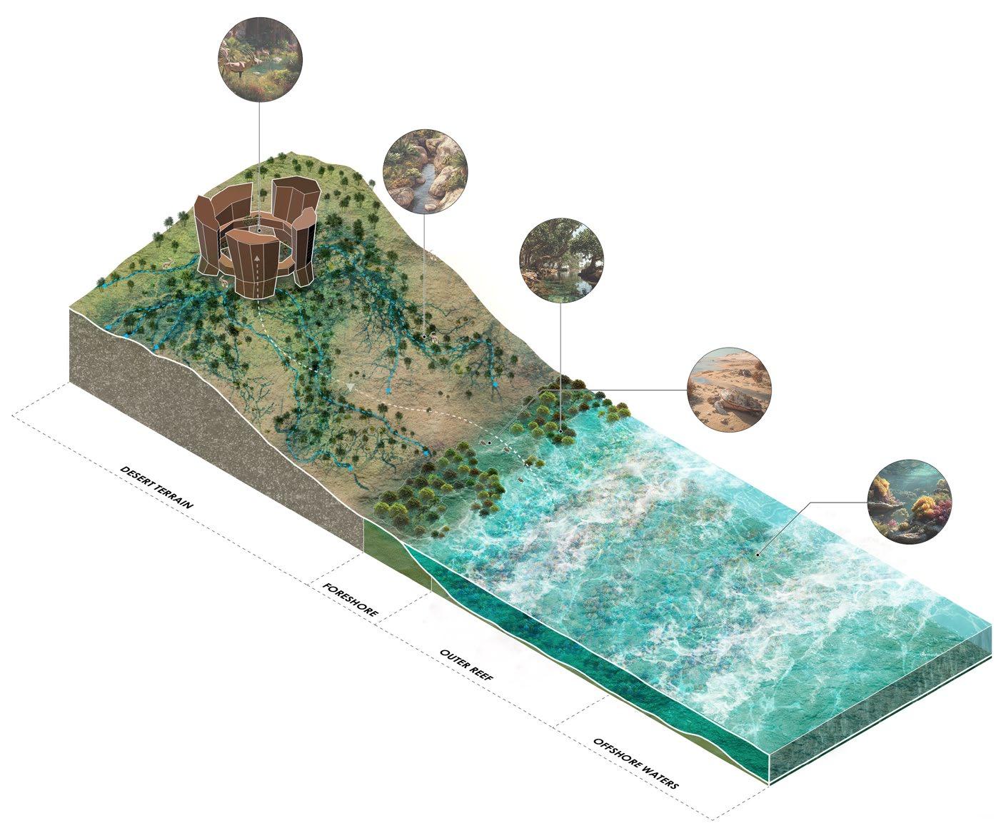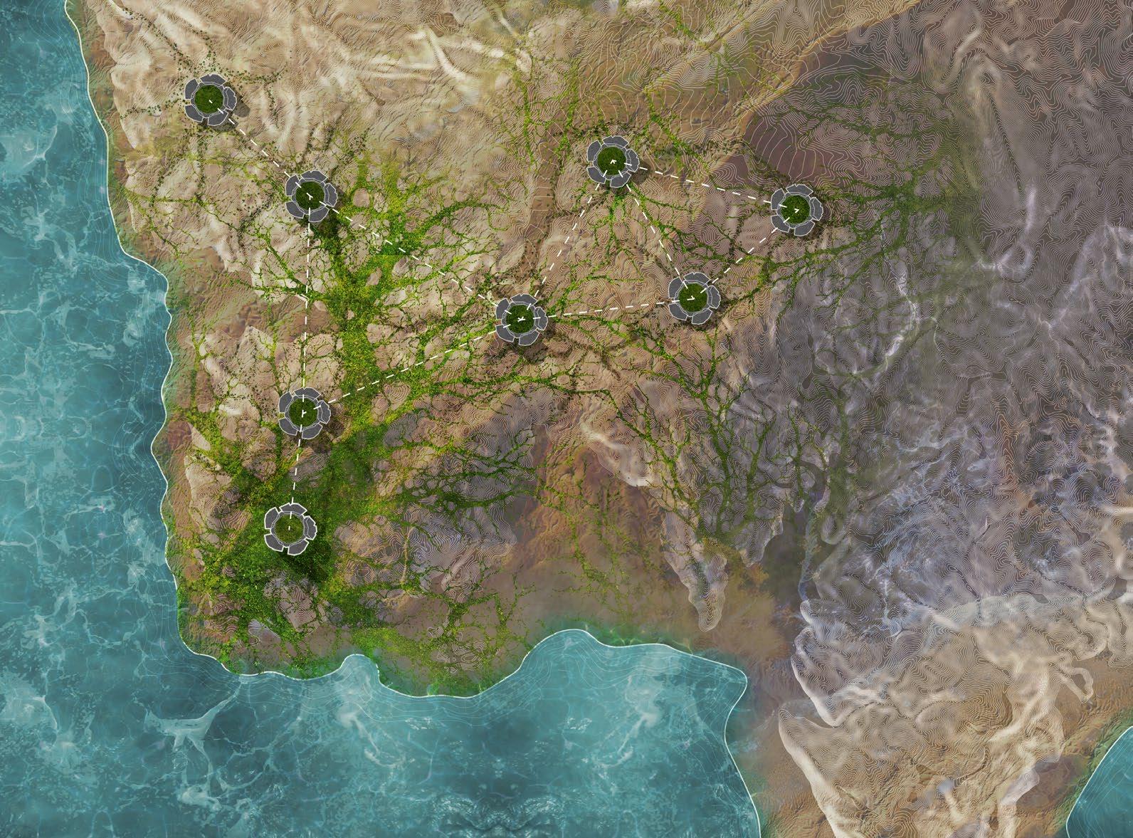 Desert Rose Regenerative Community is a project for regenerating the Red Sea’s coastal deserts by creating a sustainable, climate-adaptive communities designed for long-term habitation. Rooted in the region’s prehistoric ecology, the concept draws on human ingenuity and the growing shift toward remote, nature-based lifestyles - making such communities both viable and essential in the broader effort to reverse climate impacts. The project begins as a node on a regenerative network of recycled seawater and harvested atmospheric water that, through human-led ecological engineering, initiates a localized hillside spring. Streams cascaded from the source create and sustain a microclimate, allowing life to thrive in the crevices of an otherwise dry, rocky landscape. Each Desert Rose connects into a network, fostering continuous growth through positive human contributions that enrich the land.