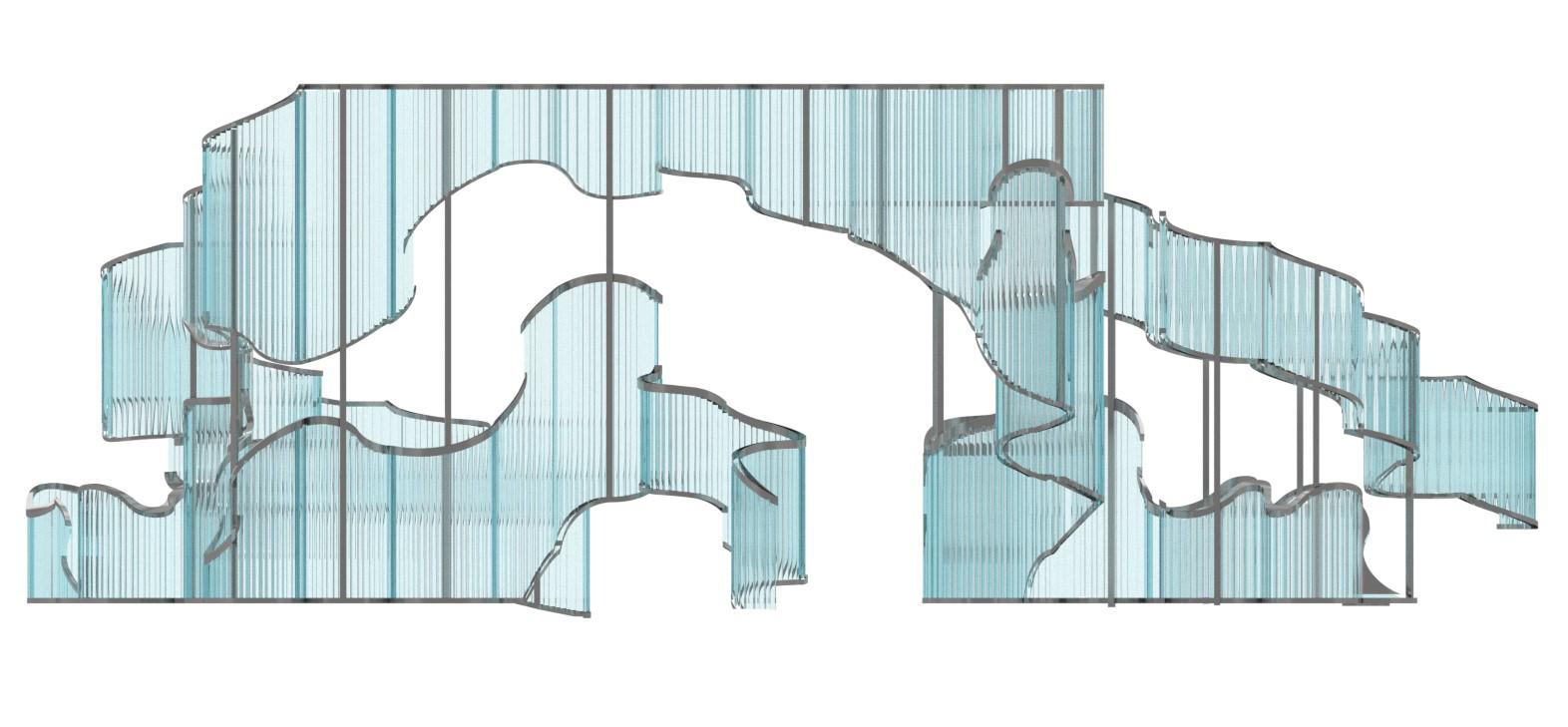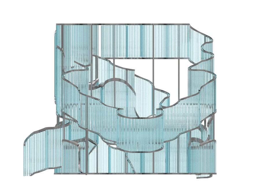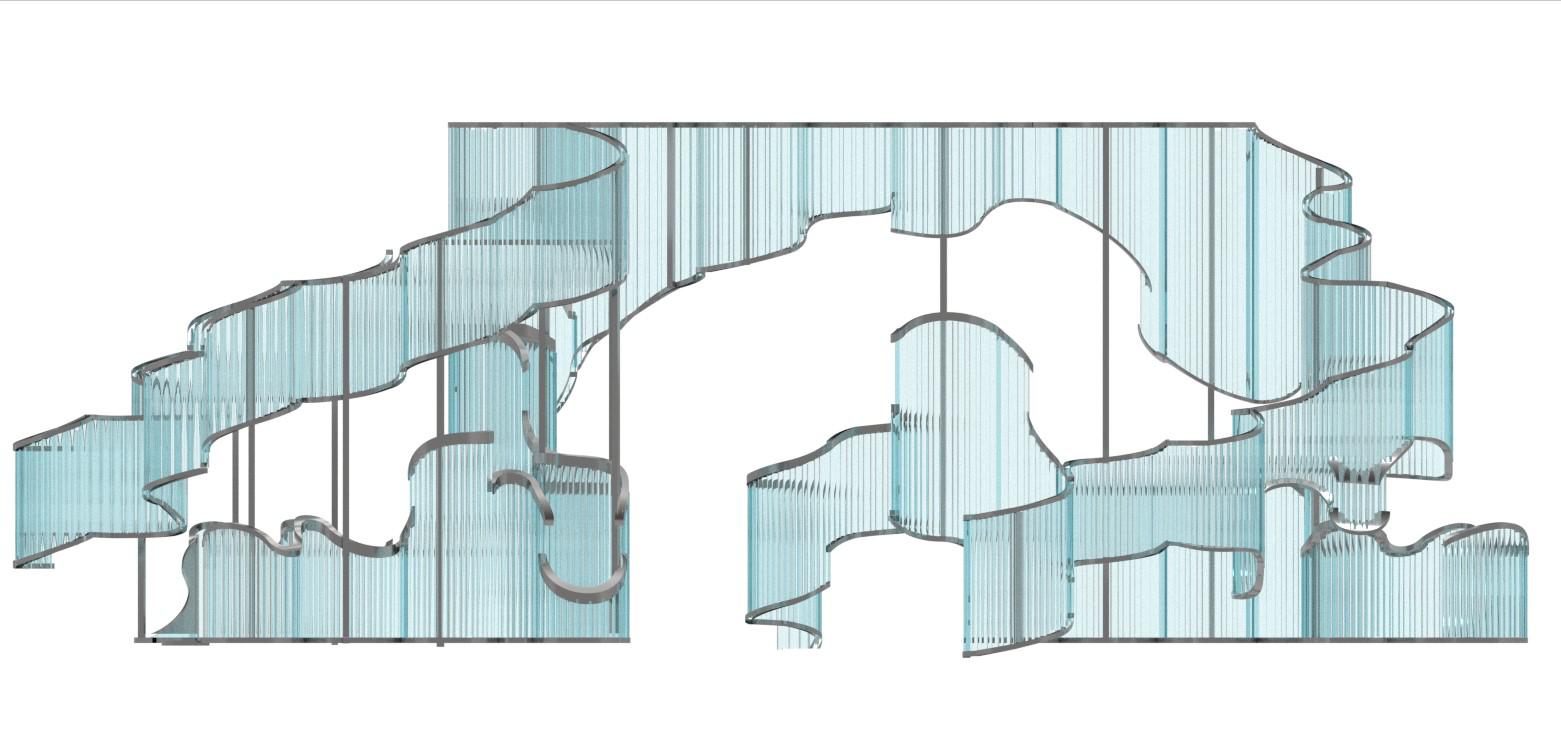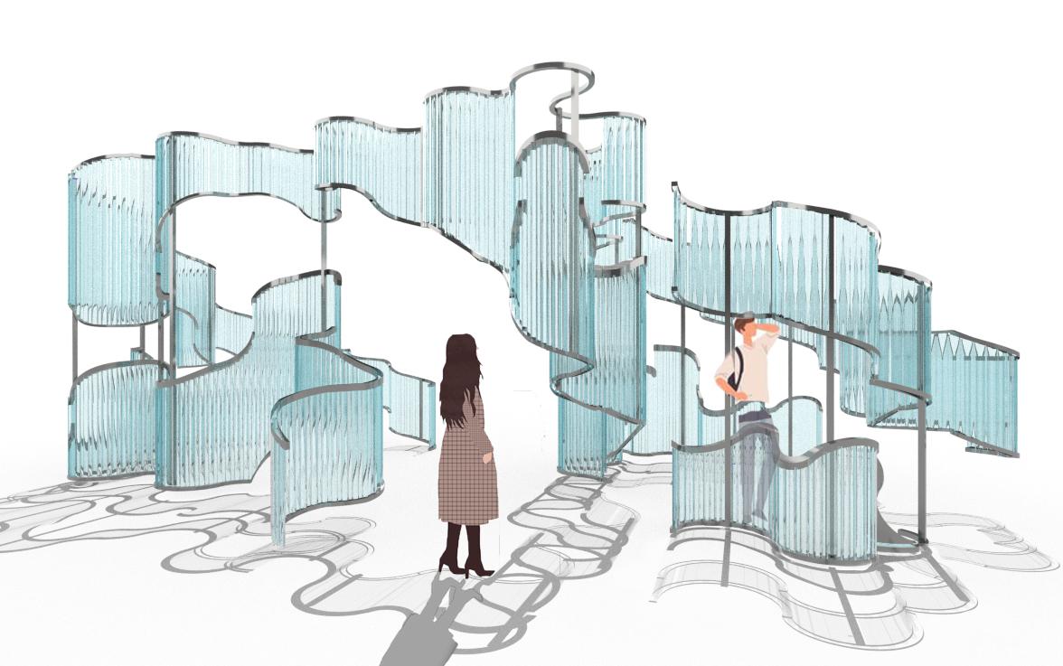 “Undulating Ribbon” is a structure inspired by the fluid movement of a ribbon. This structure combines different perspectives to elicit multiple emotions depending on position with the piece. The design uses easily accessible materials such as polycarbonate and C-channel bars to create complex form. While the project itself is a freeform structure, the polycarbonate aspect juxaposes the open concept through subtle distortion.