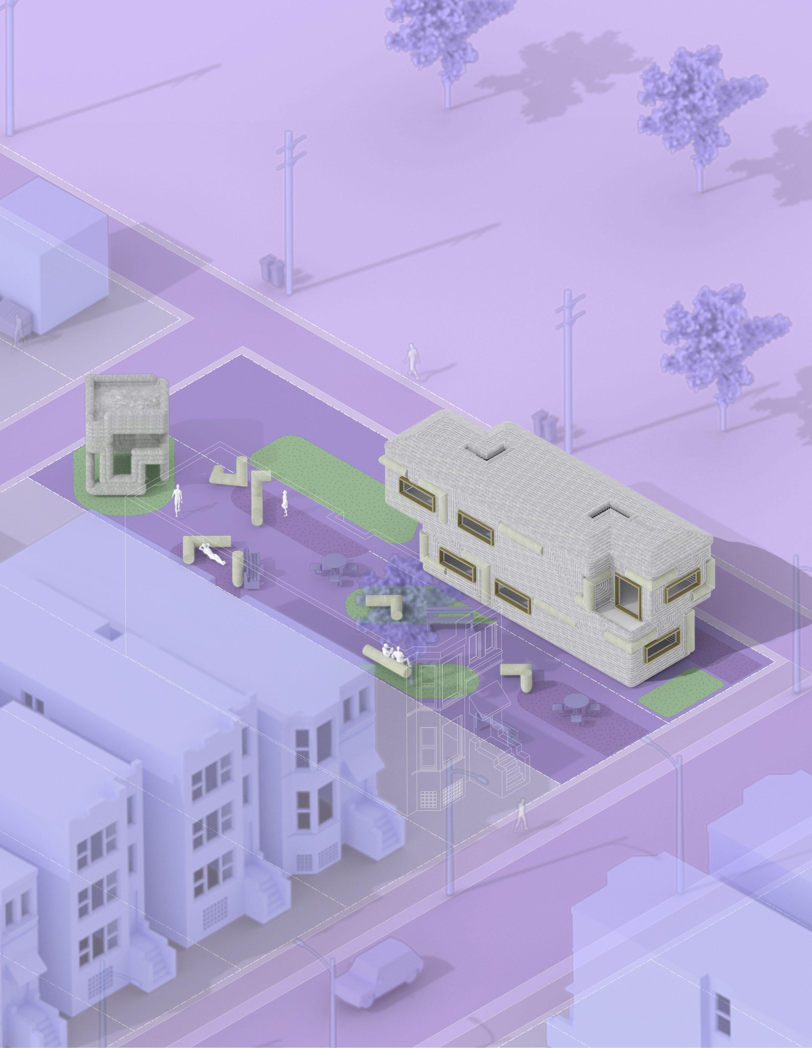 This project explores the different opportunities within on-site and off-site 3-D printing. Foam is printed from recycled materials and utilized to create a formwork. The intentional geometry of the formwork is optimized to endure strength and to conserves up to 70% of concrete. Doing so significantly lessens the overall weight of the concrete slab and cuts down costs on the project. Once the foam formwork is completed, concrete is poured in to fill the gaps in between. The process pauses periodically for the insertion of the primitives and resumes after it is situated. The foam is a great form in insulation and can be removed, recycled, and reused for more 3D printing projects.