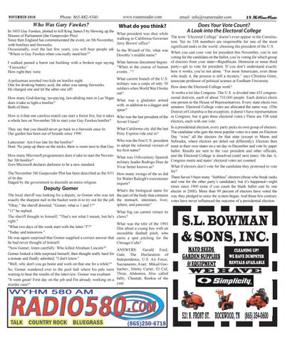 What president was shot while walking to California Governor The term “Electoral College” doesn’t even appear in the Constitution. Yet its 538 members are responsible for one of the most Jerry Brown' office? significant tasks in the world: choosing the president of the U.S. In the Wizard of Oz, what was When you cast your vote for president this November, you’re not Dorothy’s middle name? voting for the candidate on the ballot, you’re voting for which group What famous document begins: of electors from your state—Republican, Democrat or some third "When in the course of human party—get to vote for president. If you don’t understand exactly how it works, you’re not alone. “For most Americans, even those events..."? who study it, the process is still a mystery,” says Christina Greer, What current branch of the U.S. associate professor of political science at Fordham University. military was a corps of only 50 soldiers when World War I broke How does the Electoral College work? It works a lot like Congress: The U.S. is divided into 435 congresout? sional districts, each of about 710,000 people. Each district elects What was a gladiator armed one person to the House of Representatives. Every state elects two with, in addition to a dagger and senators. Electoral College votes are allocated the same way. (The spear? District of Columbia is the exception; it doesn’t have representation Who was the last president of the in Congress, but it gets three electoral votes.) There are 538 total electors, each with one vote. Soviet Union? What California city did the last In a presidential election, every party picks its own group of electors. The candidate who gets the most popular votes in a state on Election Pony Express ride end in? Day “wins” all the electors for that state (except in Maine and Who was the first U.S. president Nebraska, where electors are doled out differently). Electors then to adopt the informal version of meet in their own states on a set day in December and vote by paper his first name? ballot. Results are sent to the vice president and other officials, What was 11th-century Spanish and the Electoral College is dissolved (until next time). On Jan. 6, military leader Rodrigo Diaz de Congress meets and states’ electoral votes are counted. What if electors don’t vote for the candidate they promised to vote Vivar better known as? for? How many swings of the ax did Sir Walter Raleigh's executioner There haven’t been many “faithless” electors (those who break ranks and vote for the other party’s candidate), but it’s happened—eight require? times since 1900 (nine if you count the blank ballot cast by one What's the biological name for elector in 2000). More than 99 percent of electors have voted the the part of the body that contains way they pledged to since the system began. And those few contrary the stomach, intestines, liver, votes have never influenced the outcome of a presidential election. spleen, and pancreas? What big cat cannot retract its claws? What was the title of the 1993 film about a young boy with an incredible fastball pitch, who earns a spot pitching for the Chicago Cubs? ANSWERS: Gerald Ford; Gale; The Declaration of Independence; U.S. Air Force; Sacramento; A net; Mikail Gorbachev; Jimmy Carter; El Cid; Three; Abdomen, Also called belly; Cheetah; Rookie of the year.