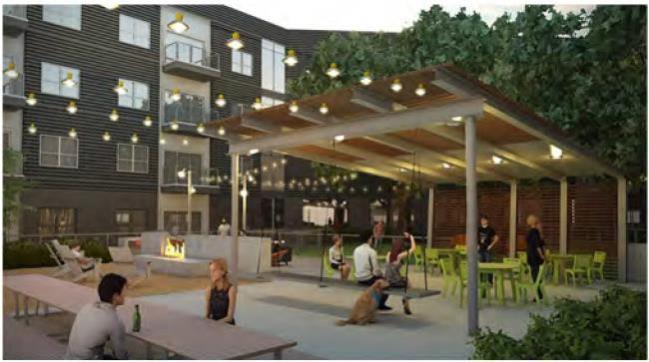 Adjacent to the leasing center, a 22,000 SF central outdoor amenity space has been developed. This modern oasis includes a 2,975 SF pool with lounge shelf, pool side water features, multiple BBQ grilling areas, a bocce ball court, and a repurposed 40’ long shipping container that has been turned in to a poolside cabana. Other featured amenity areas include a 8,000 SF tree covered dog park and gathering area, a 3,000 SF resident community garden with raised corrugated planters, and a tree lined streetscape with minimum 10’ wide sidewalks that provide connectivity to the adjacent neighborhood.