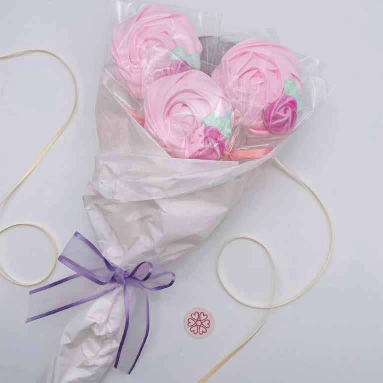 Ramo de flores de merengues 3 unidades color rosado, envuelto en papel seda y cinta.