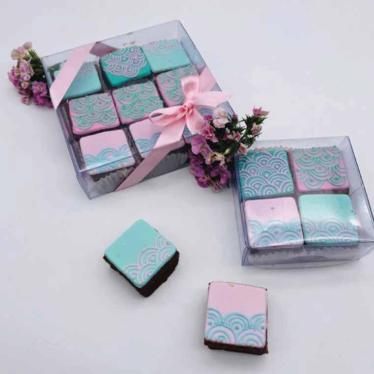 Mini brownie en caja de acetato y cinta en decoración colores pasteles.