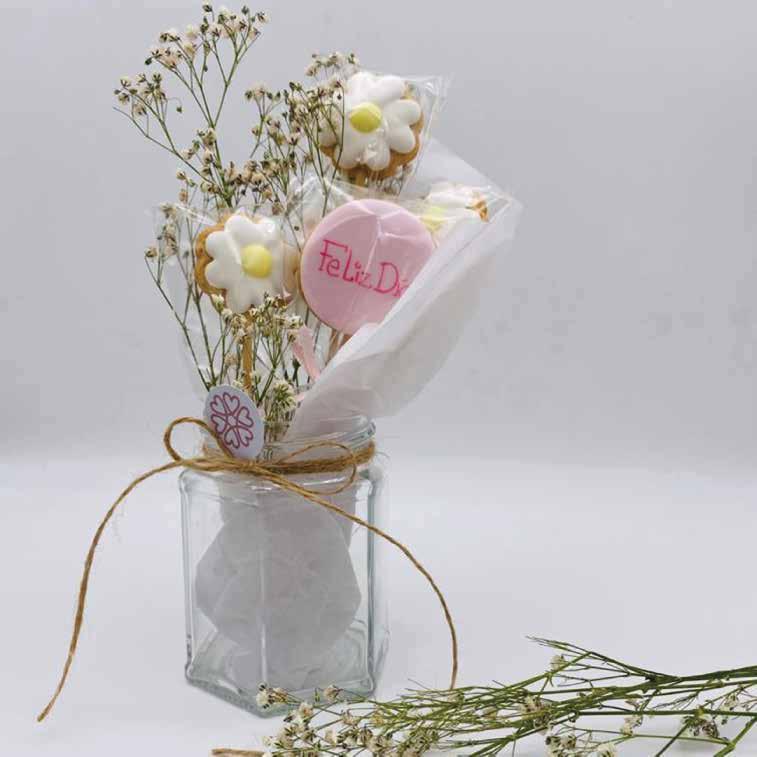 Ramo de flores elaboradas en mini galleta cada una de 3 cm., y decoradas con colores pasteles, combinadas con flores secas, envueltas en papel seda y moño de lazo.