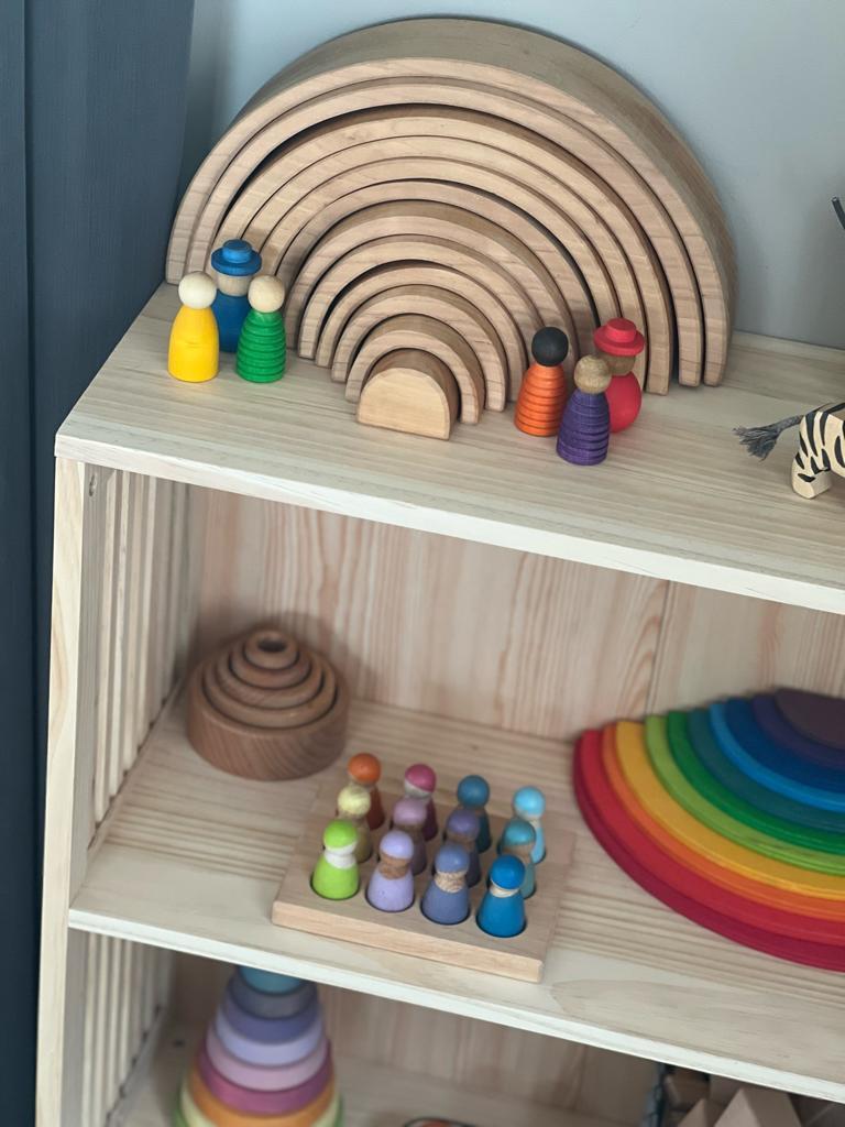 Een bekend product voor velen en onmisbaar binnen kinderopvanggroepen is de houten regenboog. Bij uitstek hét voorbeeld van open einde speelgoed. De spelmaterialen van Grimm's zijn vaak beschikbaar in drie verschillende kleurstellingen. De regenboog- en cirkelvormige-elementen prikkelen de fantasie van kinderen en biedt ze oneindig veel spelmogelijkheden. De vormen kunnen niets én alles zijn; een brug, toren, hek, huis, stal of een ballenbaan, race parcours enzovoort. Ook Loose Parts Play materialen zijn heel goed te combineren met deze houten regenbogen en halve cirkels.