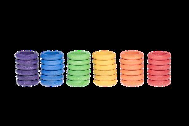 Deze ringen en munten zijn een voorbeeld van open einde speelgoed. Het stimuleert de fantasie van kinderen doordat zij vrij zijn om het doel van het speelelement te bepalen. Naast het open einde spel zijn de ringen en munten ook te gebruiken in het spel met de Loose Parts materialen zoals bijvoorbeeld in een sensory speelbak, sorteerbak of in verschillende mandjes.