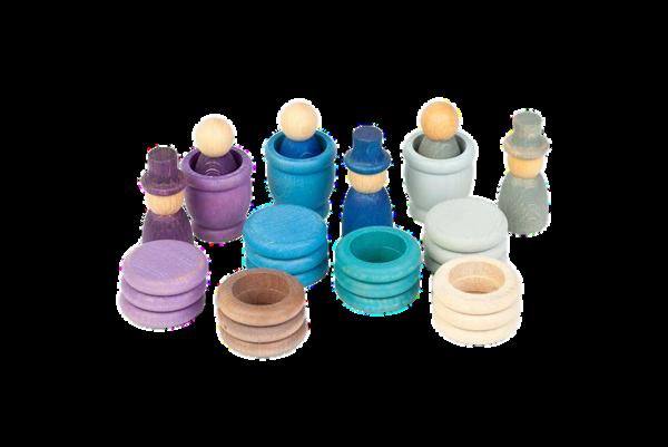 Een set gekleurde Nins met verschillende hoofddeksels. De vrolijk gekleurde hoeden passen op de verschillende houten poppetjes. Alle combinaties zijn mogelijk.