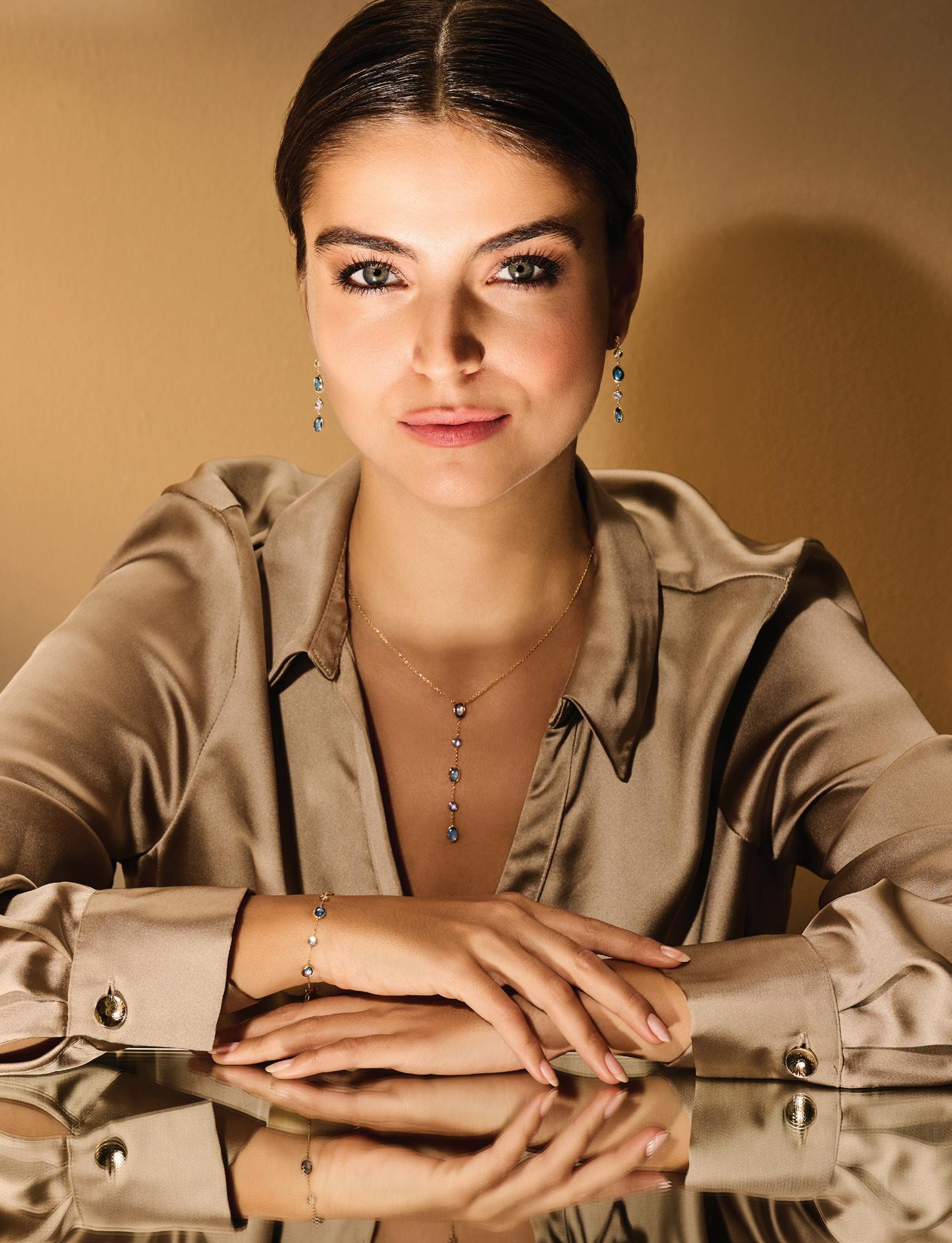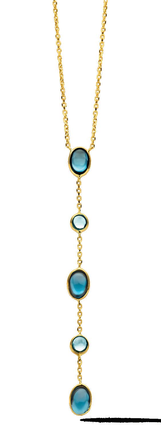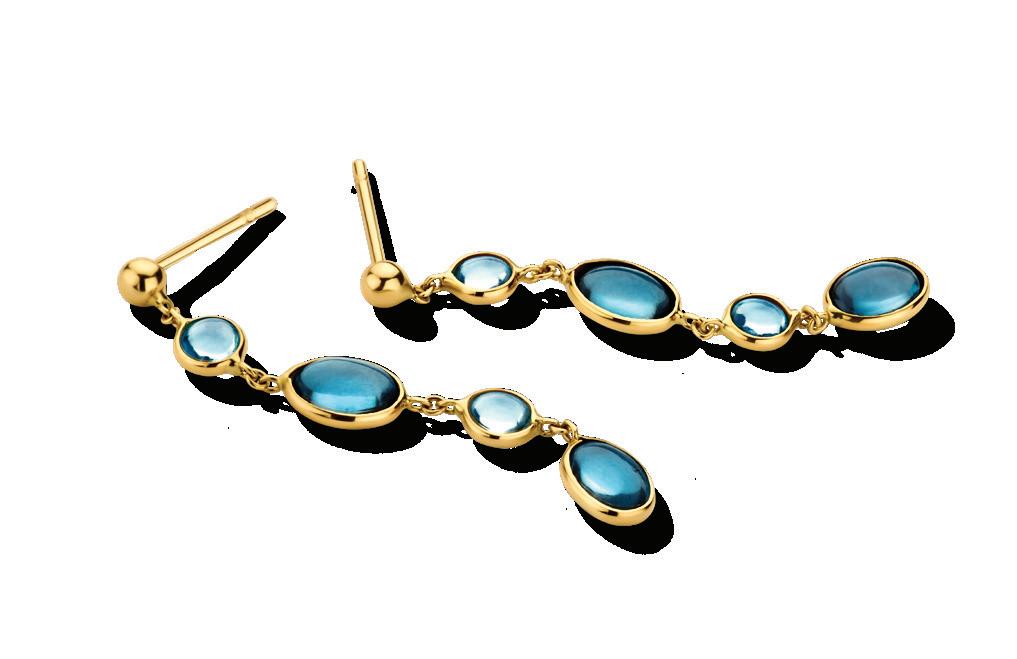 Geelgouden set met blauw topaas: 5. T025 Y-collier 45+2cm 499,- 6. T015 Collier 41+2+2cm 479,7. T014 Oorhangers 289,- 8. T009 Oorhangers 499,9. T024 Oorhangers 369,- 10. T026 Armband 17+2cm (modelfoto) 399,-