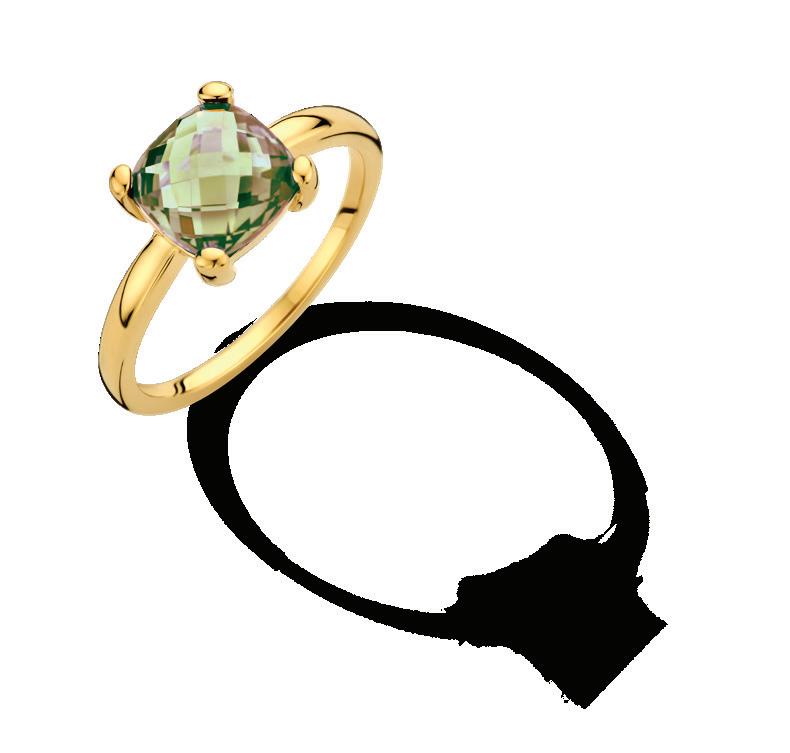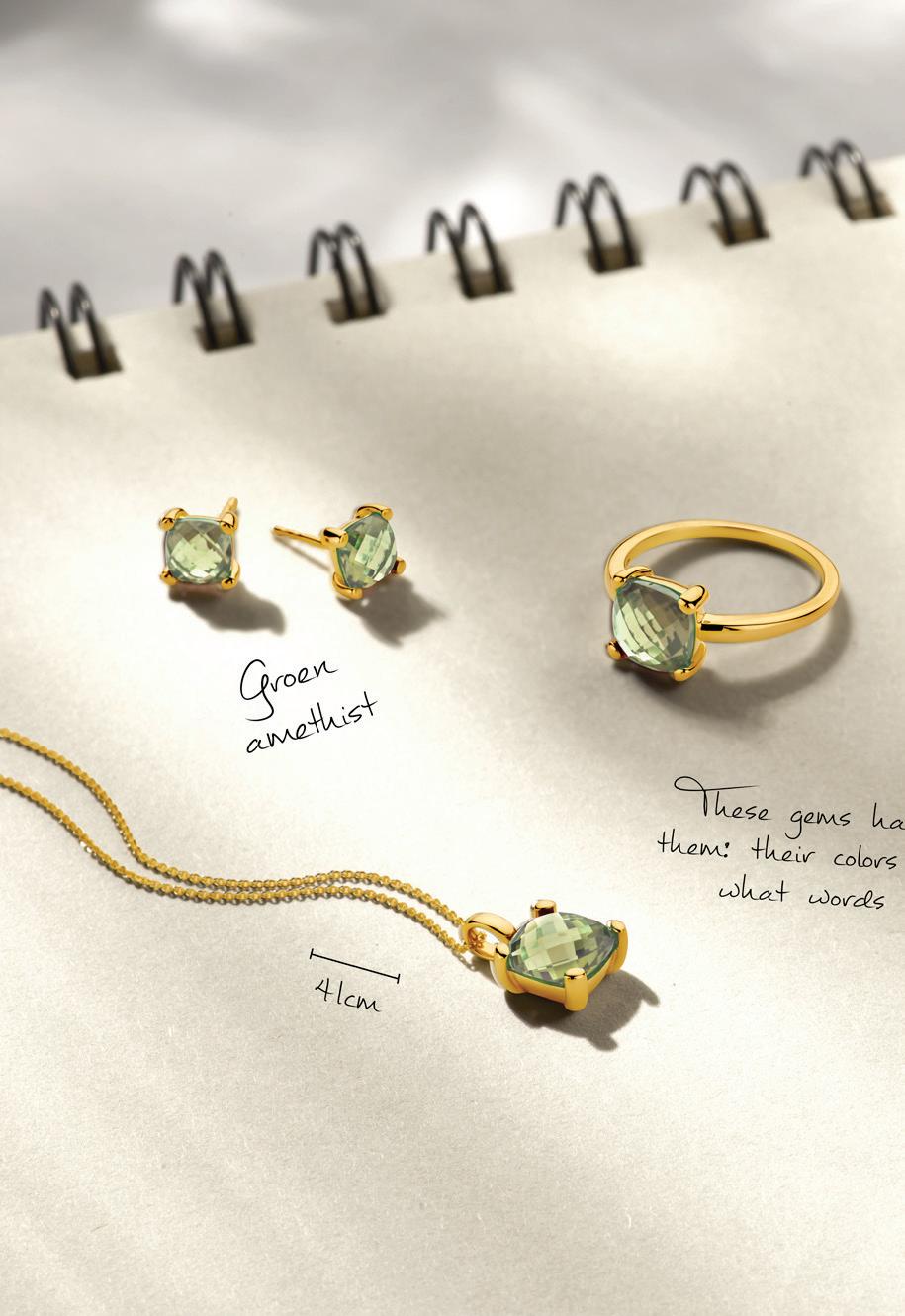 1. 2. 4. 3. Geelgouden set met groen amethist: 1. T021 Ring 599,- 2. T016 Oorstekers 549,- 3. T017 Collier 41+2+2cm 159,- 4. T018 Hanger 419,-