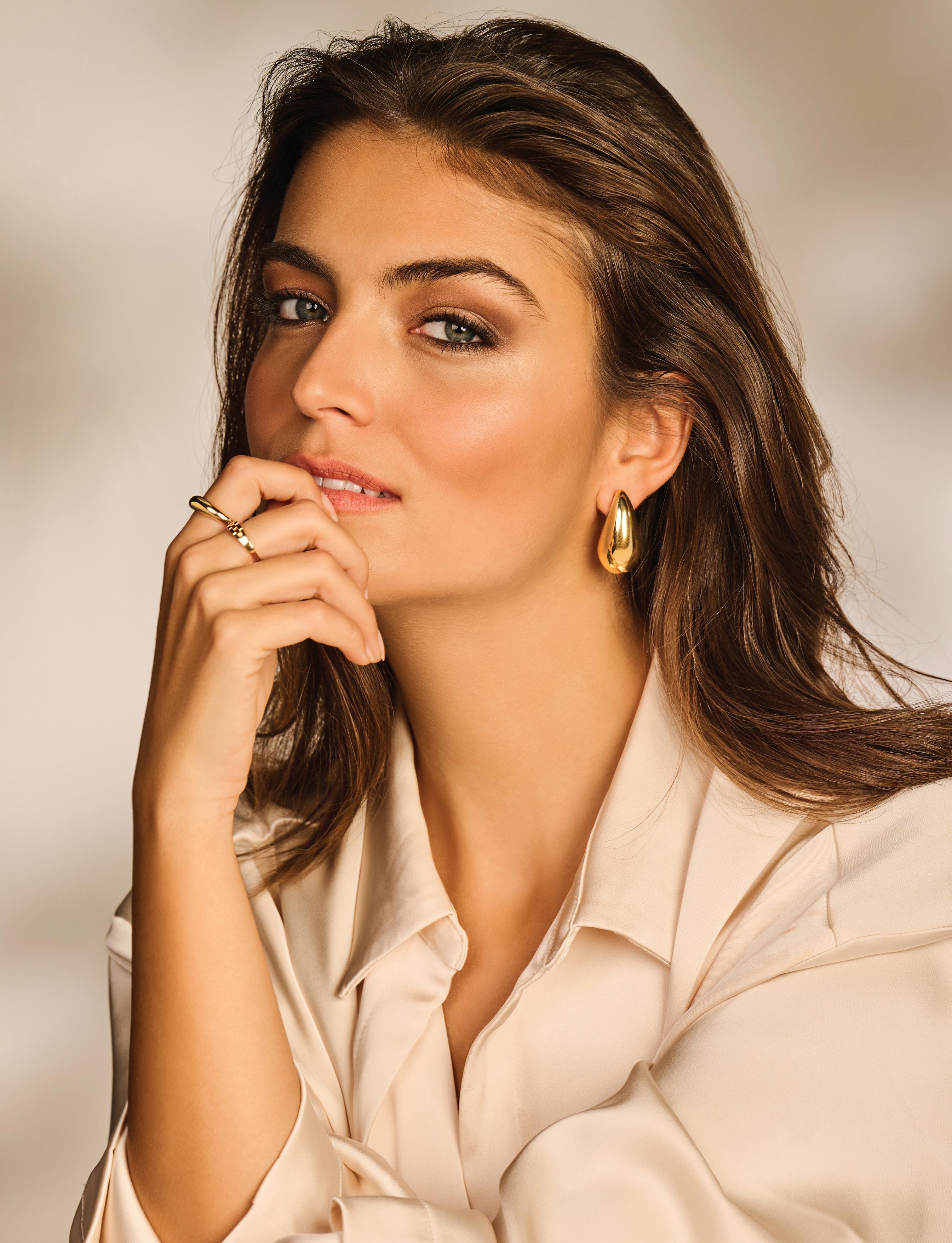 De oren zijn de grote blikvangers dit jaar. Tal van nieuwe ontwerpen passeren de revue, waaronder gouden hartjes oorhangers met onyx en oorringen die niet rond zijn, maar de vorm hebben van een robuust hart! Deze hartjes oorbellen met onyx doen alle hoofden draaien. Ontworpen om een statement te maken. Minimalistische gouden oorknoppen zijn een