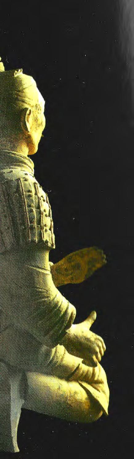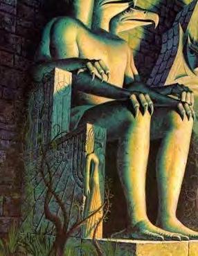 They were like great figures seated upon thrones, each had 3 joined bodies and 3 heads facing outward and inward and across the gateway. Their heads had vulture faces and on their great knees were laid claw-like hands. They seemed to be carved out of huge blocks of stone Immovable and yet they were aware. Some dreadful spirit of evil vigilance abode in them, they knew an enemy visible or invisible; none could pass unheeded, they would forbid his entry or his escape.’