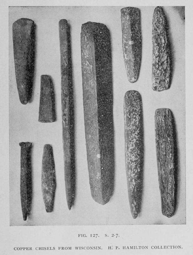 Copper chisels, spear points, crescents, and beads removed from mound sites in Wisconsin.